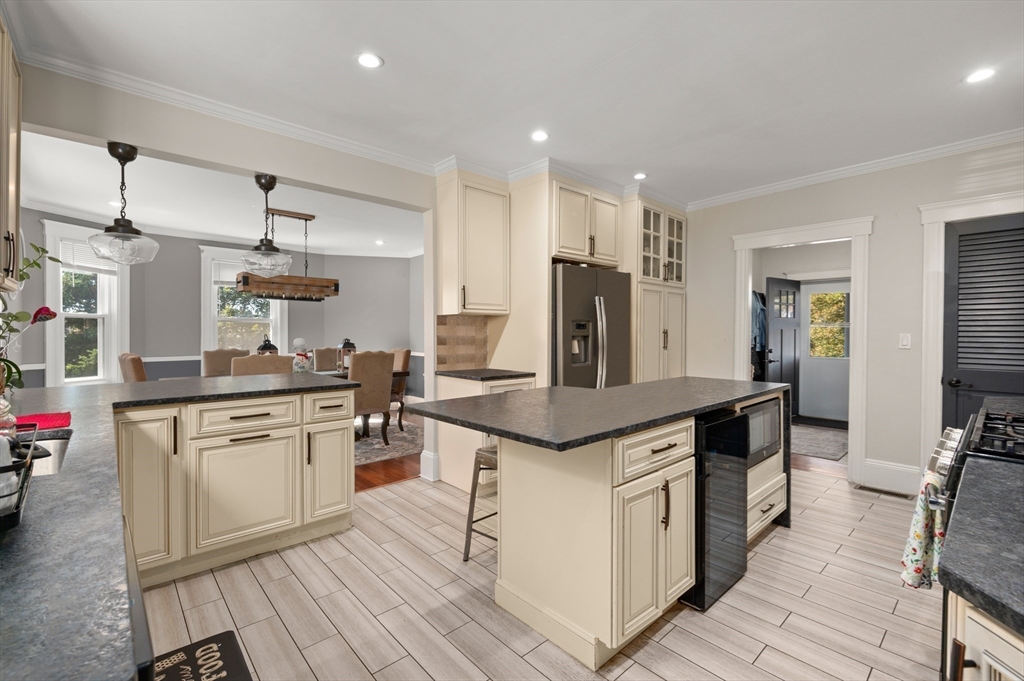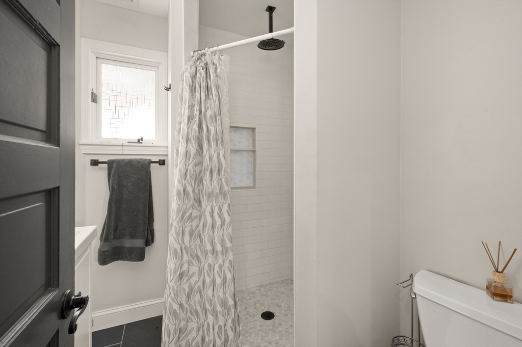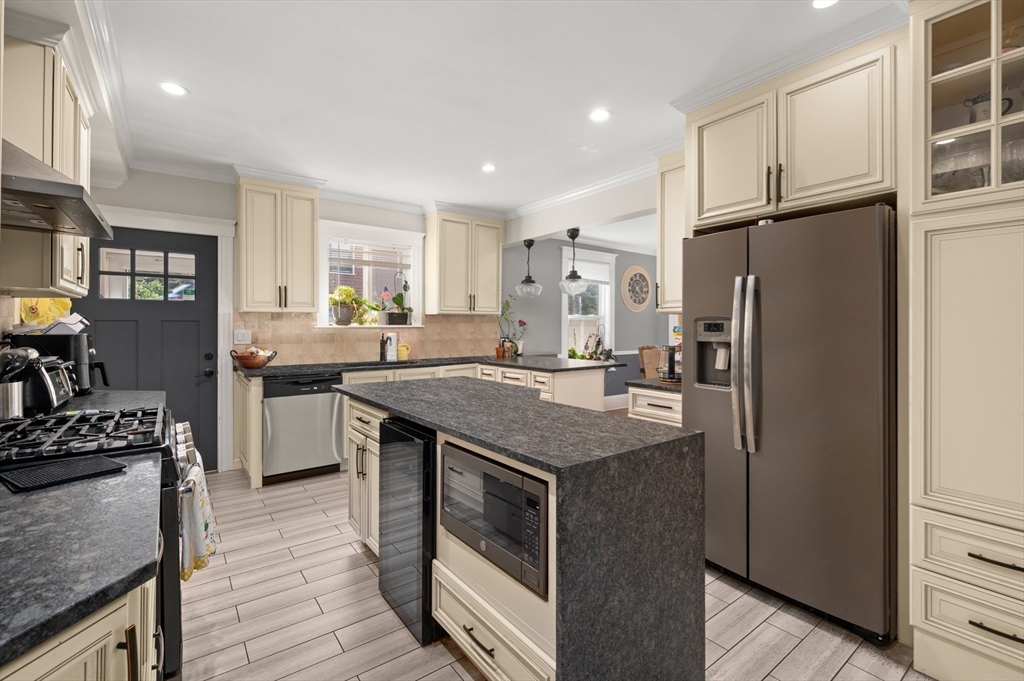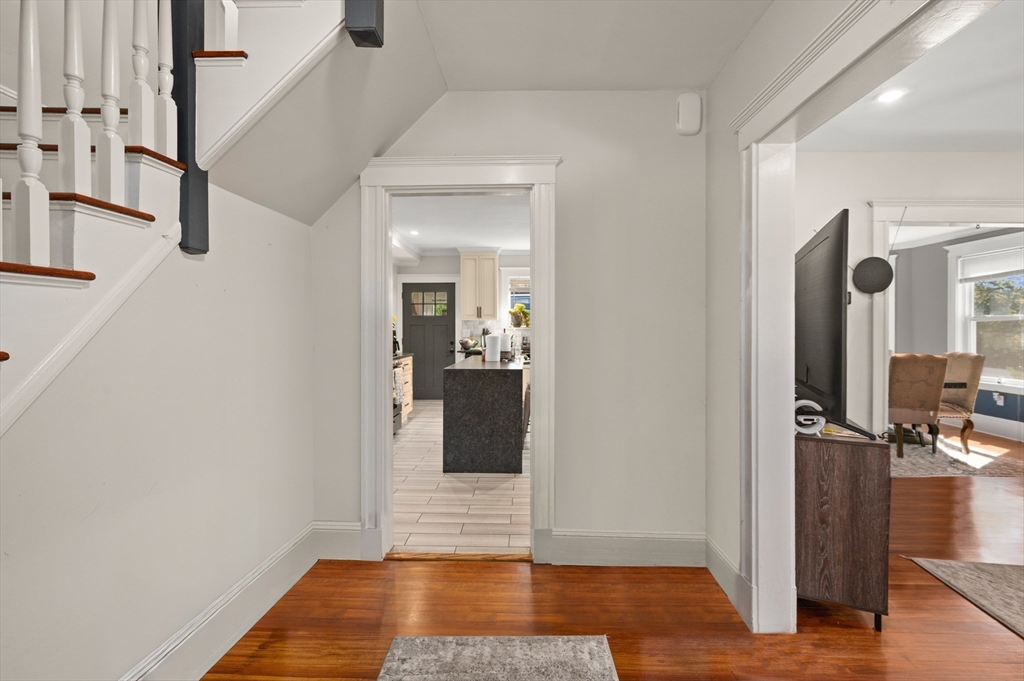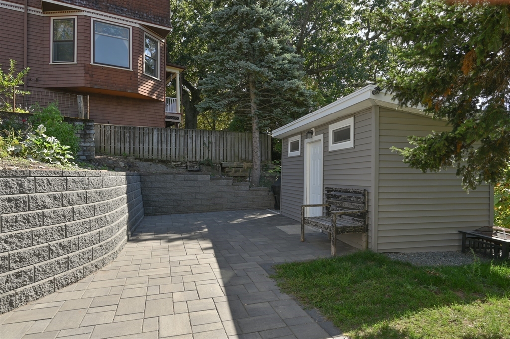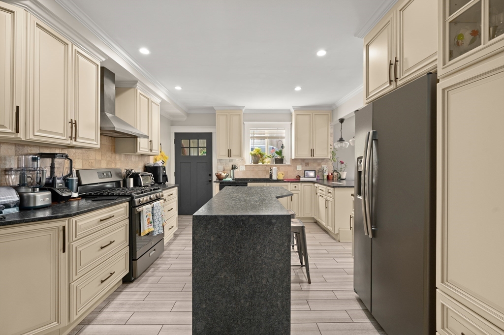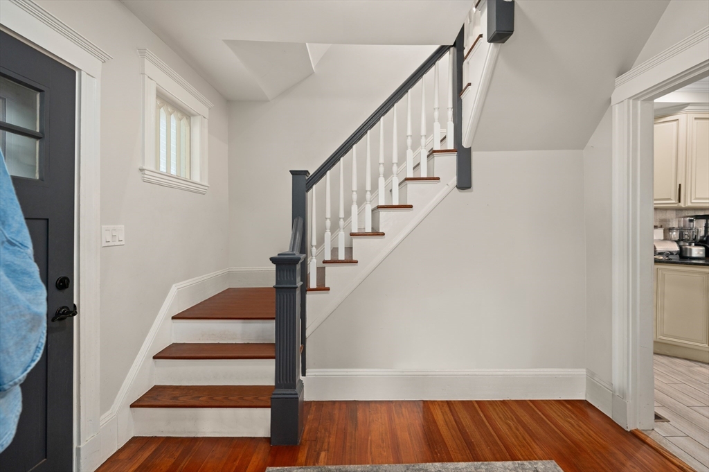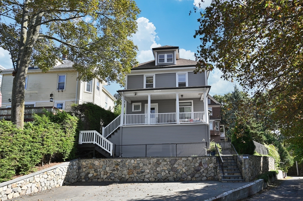 Thoughtfully renovated property in a desirable Saugus neighborhood. Historic charm meets modern living. Easy access to Routes 1 and 60. Four levels of living space including four bedrooms plus a lower-level guest or au pair space. Enter the impressive foyer into the beautifully updated kitchen with high-end cabinetry with marble countertops and island. Light-filled dining room and family room complete the spacious first floor. Primary bedroom with bathroom and walk-in closet on the second floor. Four bedrooms and 3 bathrooms. Huge loft-style bedroom on the top level. Walk-out lower level has the laundry room, and a wet bar. New Central AC and gas heating system with 4 separate zones, updated electrical. Custom newer stone walls creates an impressive terraced garden space with a 16X8 shed. Newer roof, windows and exterior doors, vinyl siding and front deck railings. Ample parking on two levels. Floor plans in pictures.