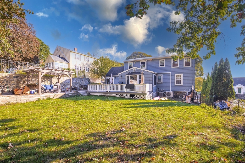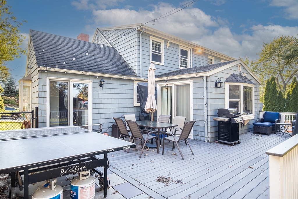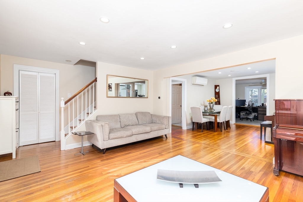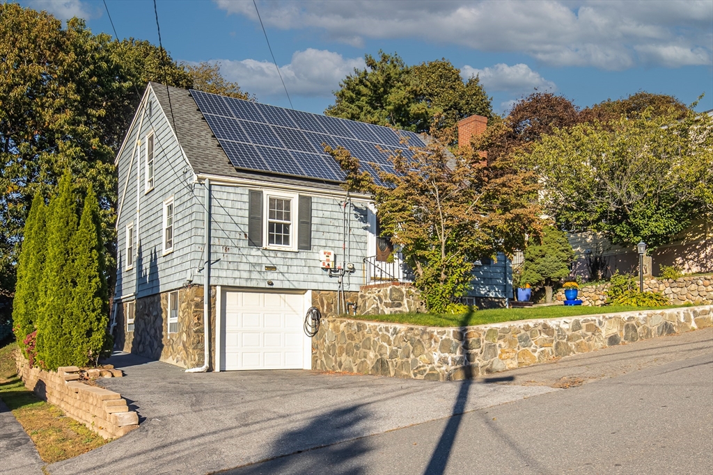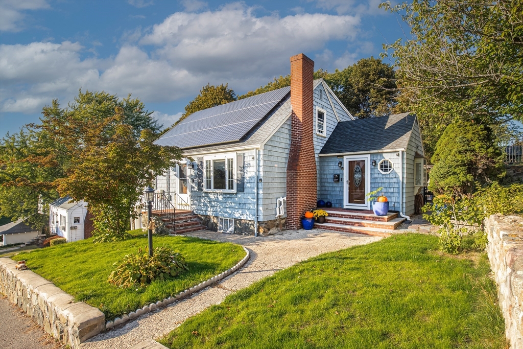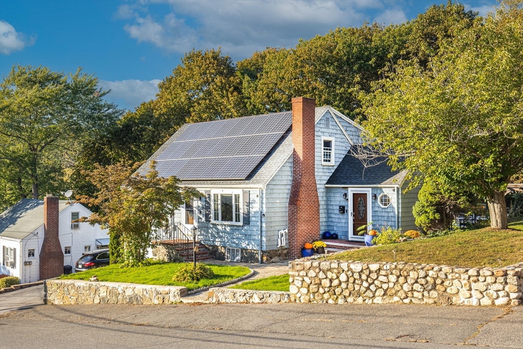 Stunning expanded Cape in a desirable family neighborhood! This sun-filled home offers an open floor plan with gleaming hardwoods, elegant living room with fireplace, sunroom, and updated kitchen with granite counters and stainless steel appliances. Three bedrooms upstairs with an updated bath, plus two versatile first-floor rooms perfect for bedroom, office, or den.Enjoy the new deck, patio with pergola, and beautifully landscaped level yard with sprinklers—ideal for entertaining. Many updates include newer heating system, mini-split AC/heat pumps, tankless water heater, new windows/doors, and owned solar panels with EV charger. Garage, large basement storage, and easy commuter location near the high school.Welcome home for the holidays!