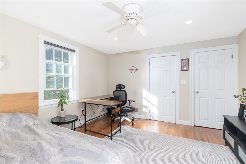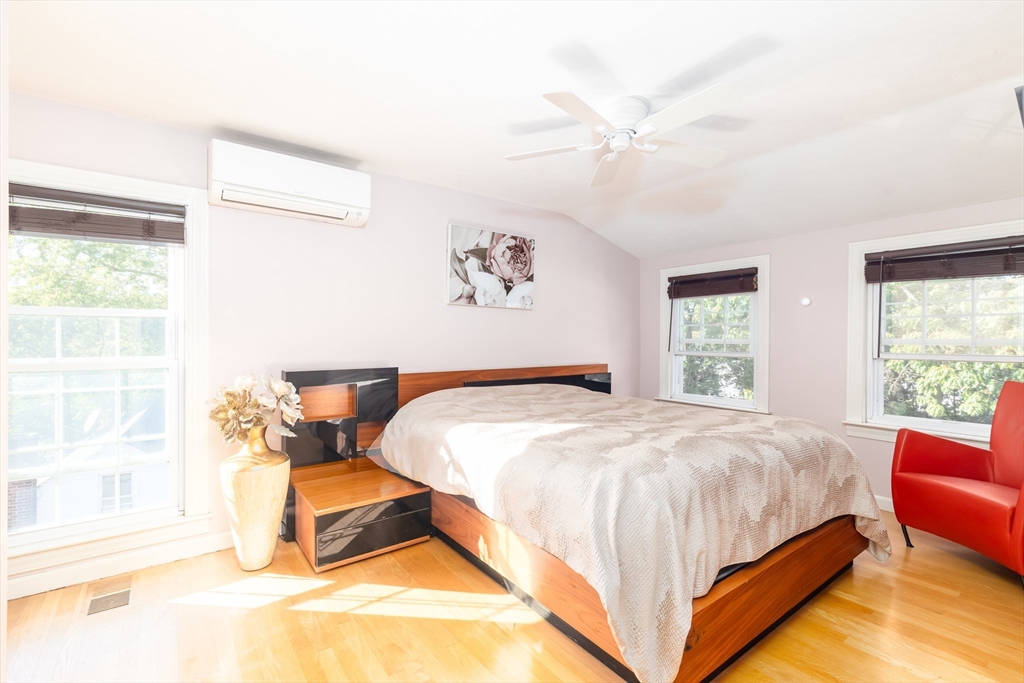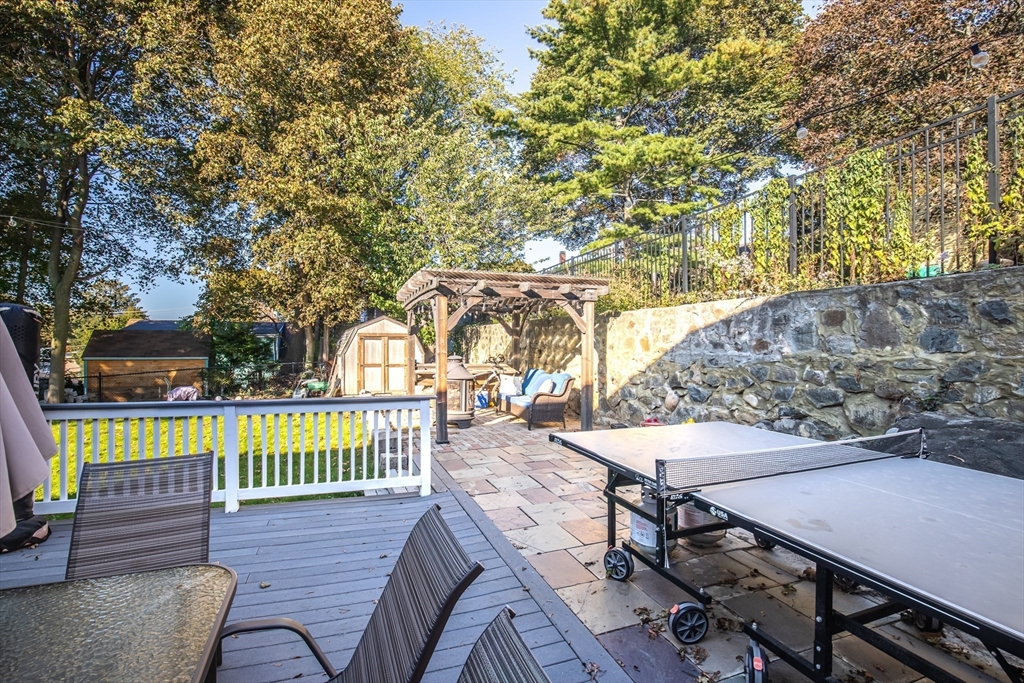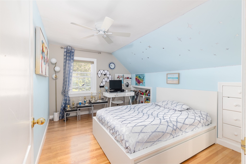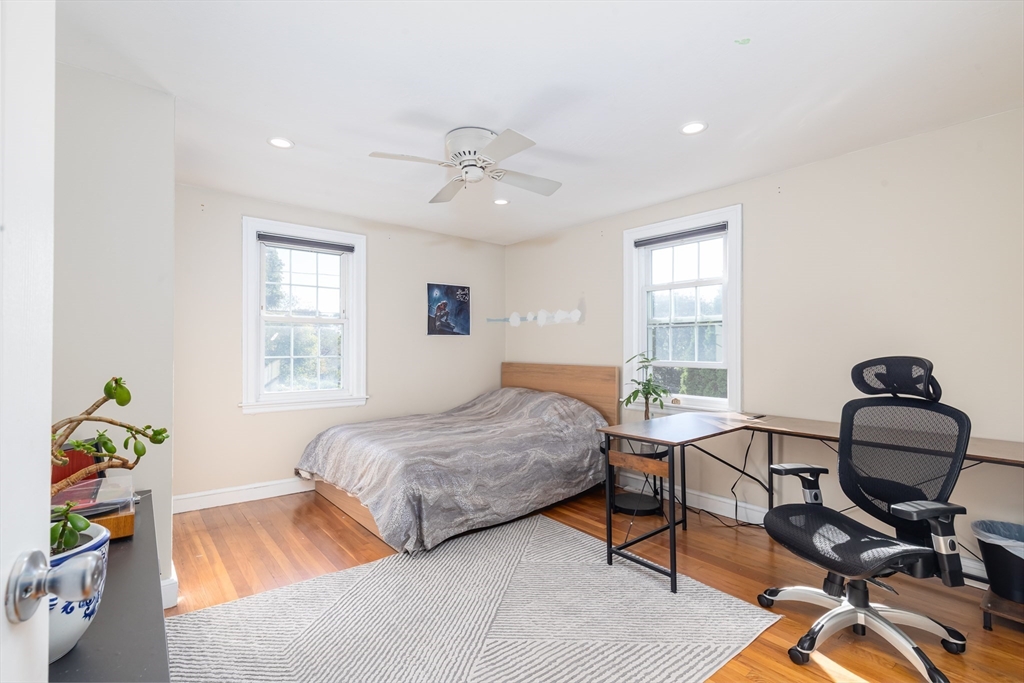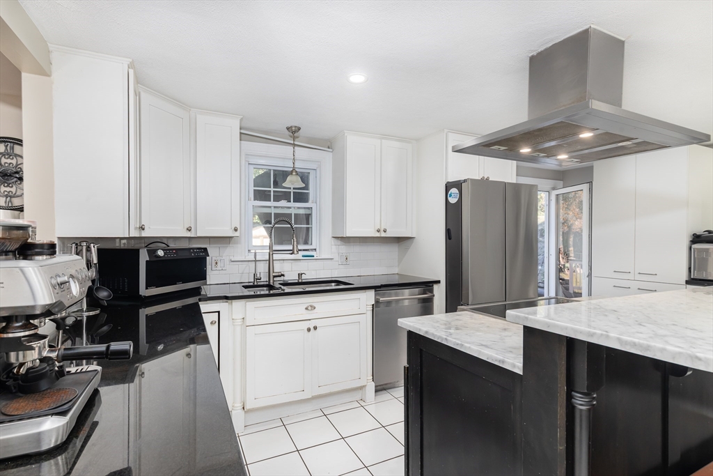 Stunning expanded Cape in a desirable family neighborhood! This sun-filled home offers an open floor plan with gleaming hardwoods, elegant living room with fireplace, sunroom, and updated kitchen with granite counters and stainless steel appliances. Three bedrooms upstairs with an updated bath, plus two versatile first-floor rooms perfect for bedroom, office, or den.Enjoy the new deck, patio with pergola, and beautifully landscaped level yard with sprinklers—ideal for entertaining. Many updates include newer heating system, mini-split AC/heat pumps, tankless water heater, new windows/doors, and owned solar panels with EV charger. Garage, large basement storage, and easy commuter location near the high school.Welcome home for the holidays!