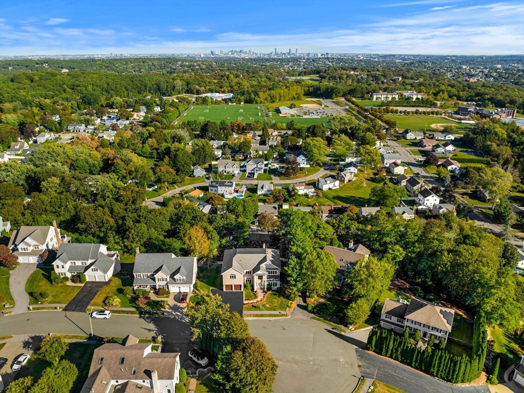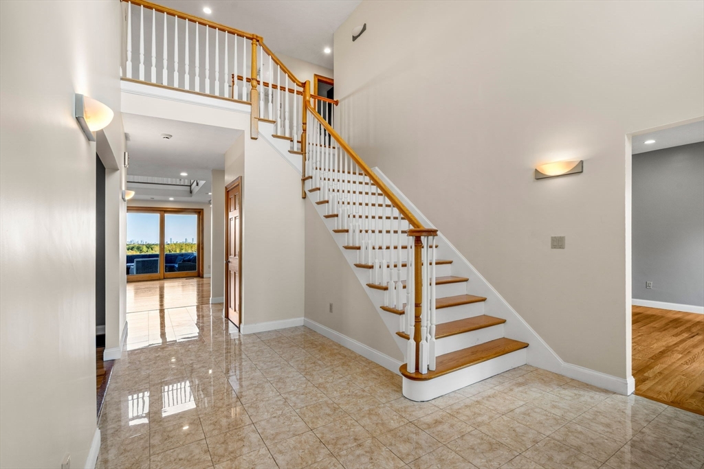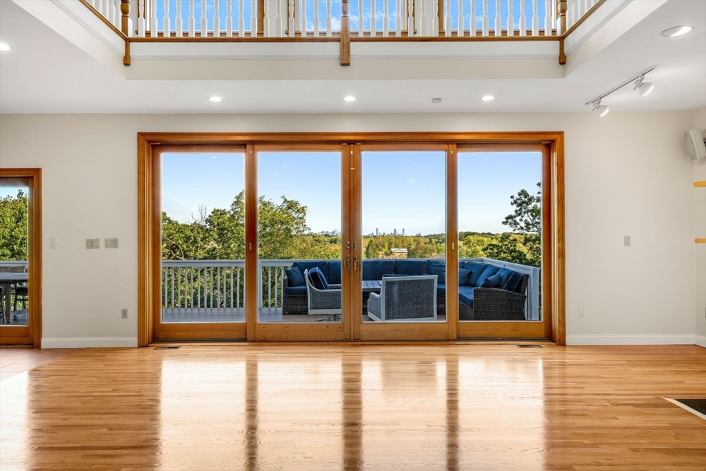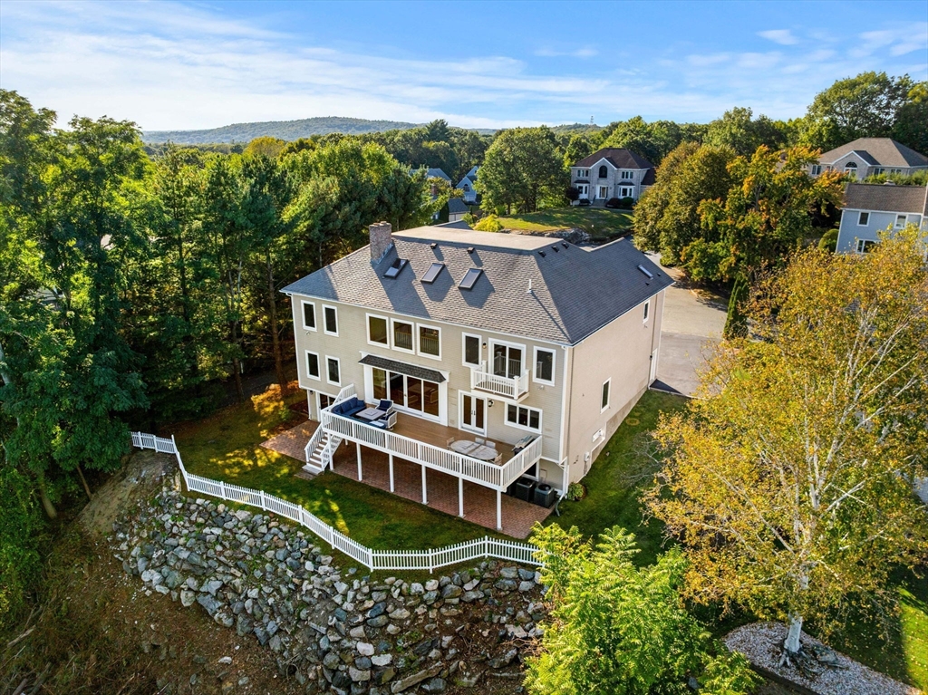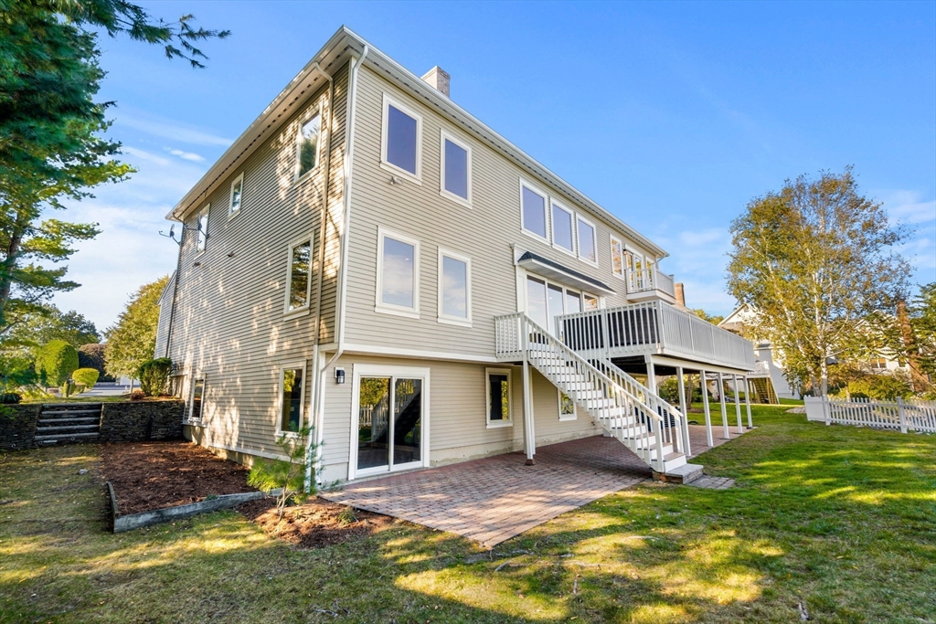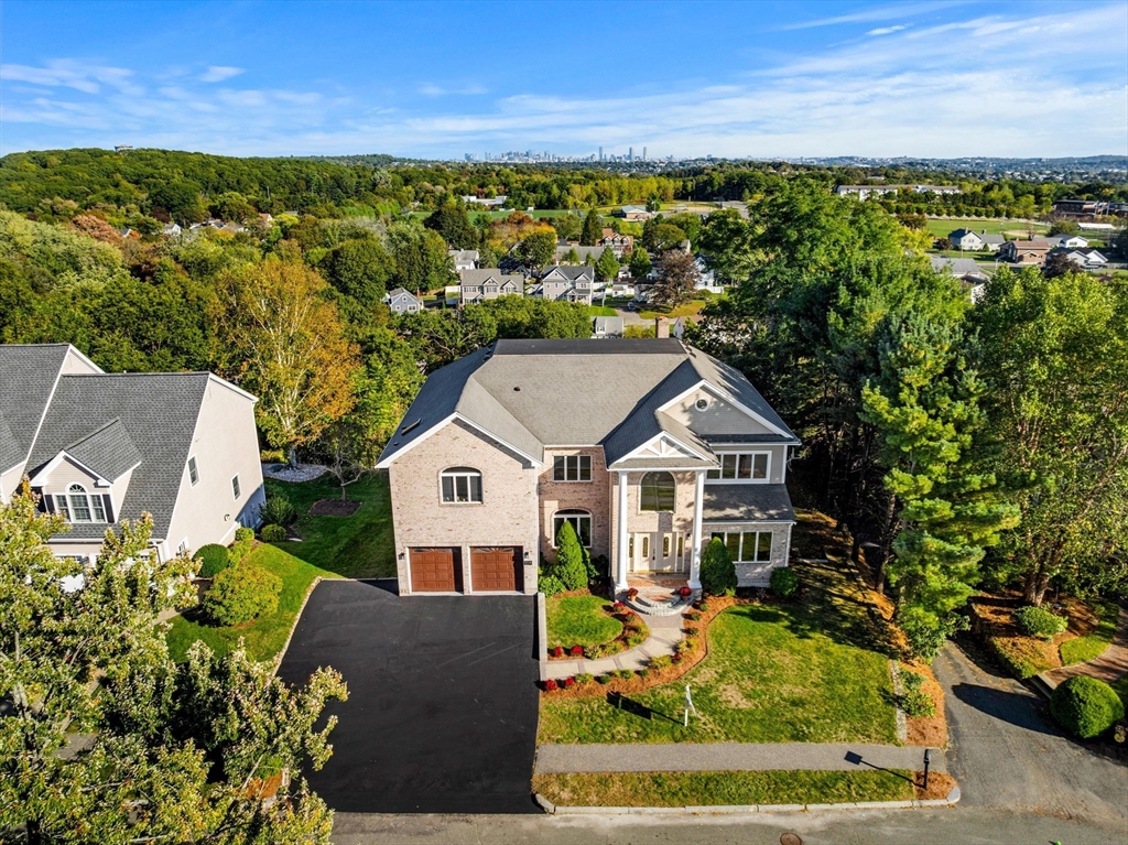 Rare offering in Prestigious Pigeon Hill Estates captures breathtaking direct skyline views of Boston! Perfectly set on a cul-de-sac, this custom-built Colonial features soaring ceilings, brick front, spacious rear deck ideal for entertaining, walk-out lower level, 2-car garage & amazing views from every rear-facing room. Enter the dramatic 2-story foyer leading to the grand family room w/ floor-to-ceiling windows and traditional fireplace. The open layout flows seamlessly into the kitchen, with French doors opening to a large deck overlooking Boston. The 1st floor also offers a living room, dining room, office/br, full bath, laundry & garage access. Upstairs, the primary suite features French doors to a private balcony, spa-like marble bath, dual vanities, whirlpool tub, and two walk-in closets. Two additional bedrooms share a full bath, while a 4th bedroom includes an en-suite. Finished walk-out lower level offers endless options & a walk-up 3rd level allows expansion.