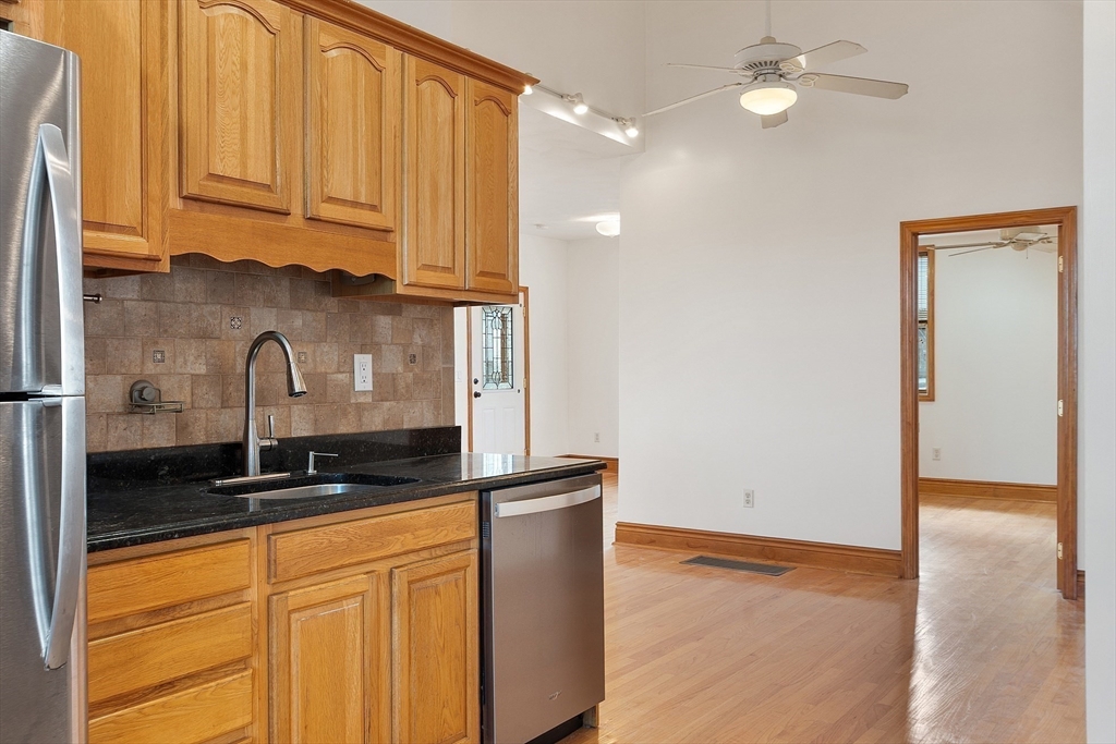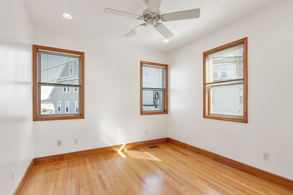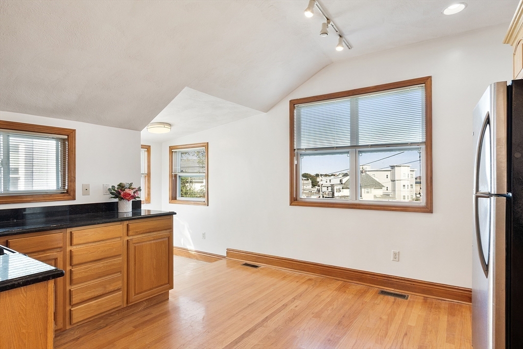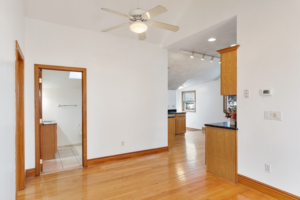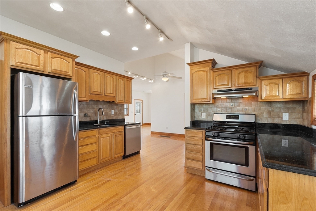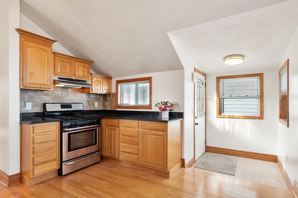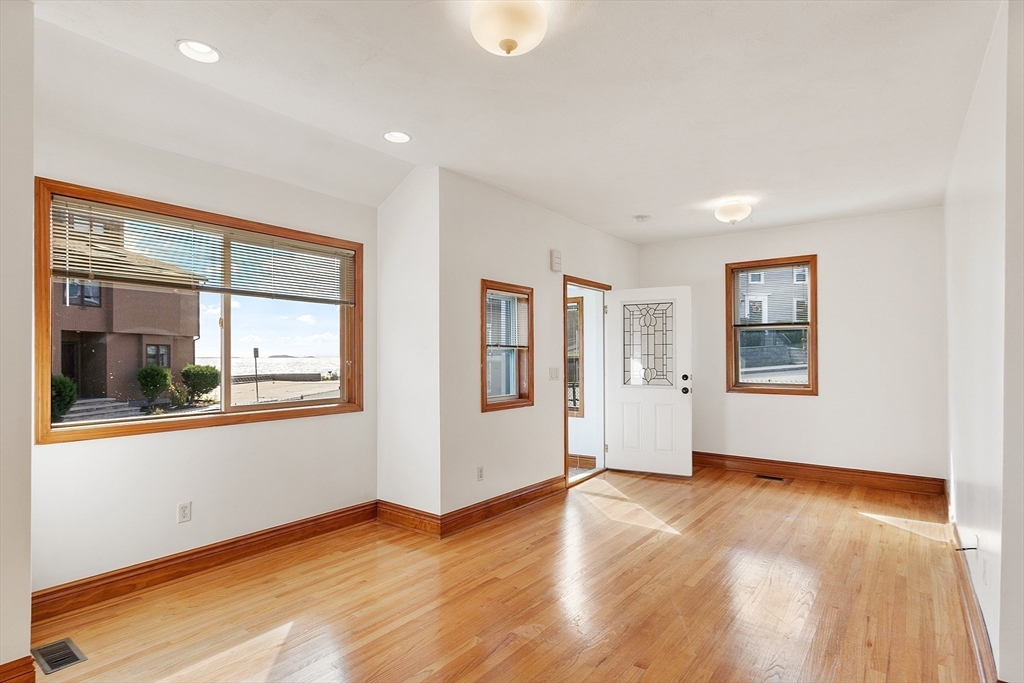 Ocean views and the soothing sound of the surf all year long! This meticulous ranch-style home features two bedrooms, one full bath, and gleaming hardwood floors throughout. The welcoming front mudroom with leaded glass doors opens to a spacious living room with recessed lighting. The open floor plan flows into a dining area conveniently located off the updated kitchen, which offers stone countertops, stainless steel appliances, a gas stove, tile backsplash, and hardwood floors. The full bath includes a tiled tub/shower, tile flooring, and a skylight. Both bedrooms feature ceiling fans, recessed lighting, and hardwood floors. Off the kitchen, a step down leads to a tiled rear entry connecting to an oversized two-car garage with an expansive storage and workshop area. Additional storage can be found in the basement. Near Boston with close proximity to public transportation. Enjoy a fenced yard and ocean views from most windows — just move right in and start living the coastal lifestyle!