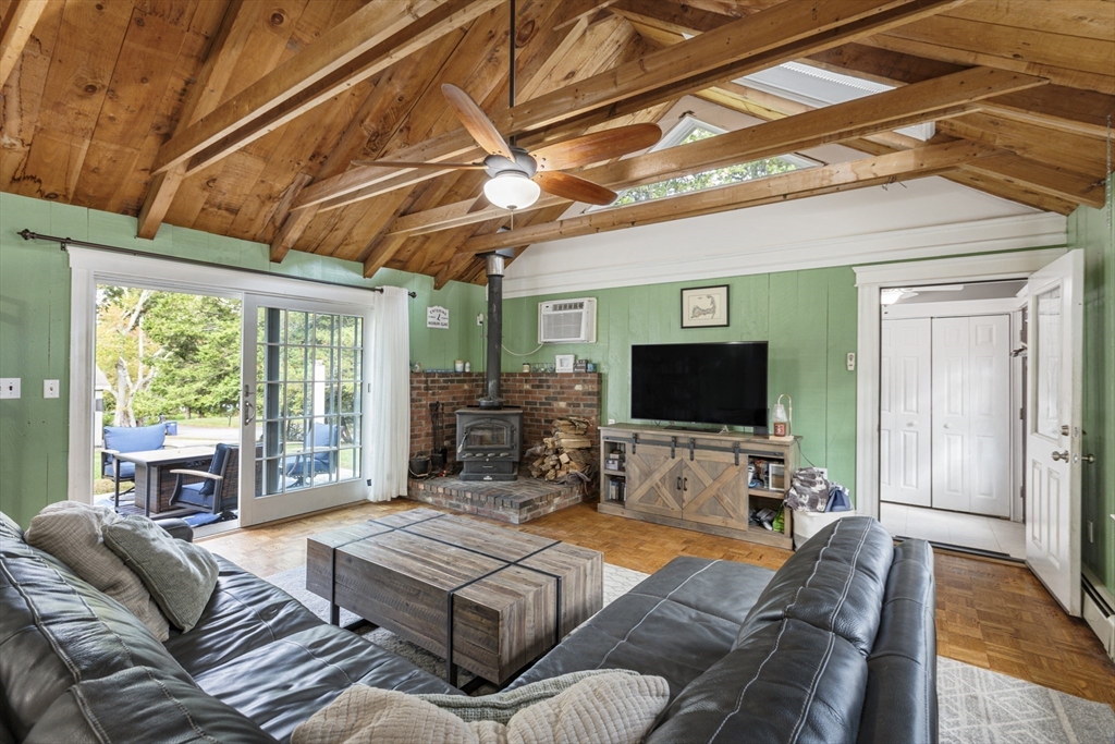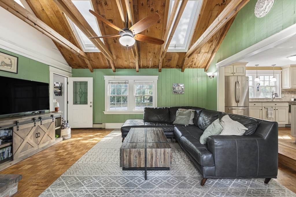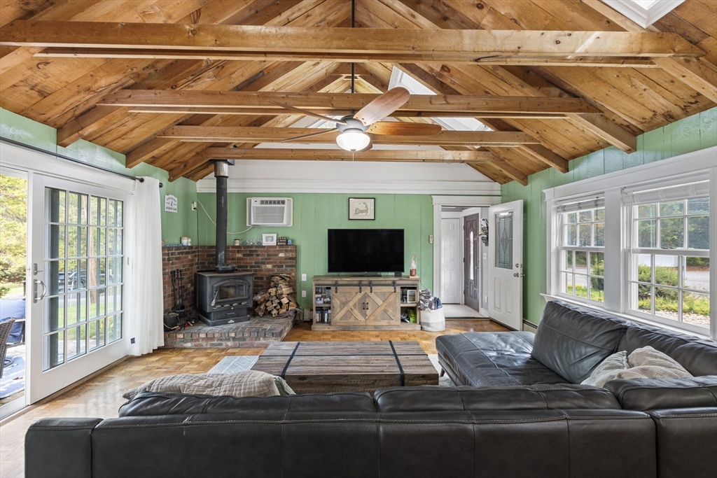 As you enter the large mudroom and walk into the cathedral ceilinged, wood beam great room, you are immediately struck by the spaciousness and openness of this home. The large scale of this room, with sliders to the patio and .5+ acre lot, makes you feel at ease. A wood stove with large ceiling fan warms the space up. The updated galley kitchen with stainless appliances opens into a dining area, additional living space and a spacious office. There is a first floor ensuite bedroom with full bath. The second floor has 2 large bedrooms, a sweet nursery/office and another full bath. The lower level has walls and built ins in place and is waiting for a quick finish to add an additional 600+SF to the home! The detached garage has room for 2 cars and lots of storage. The siting of the home and skylights allows the sun to stream in throughout the day. Newly installed solar panels help the home run efficiently with $0 electric bills. Perfectly located between Cobb Corner and Sharon Center!