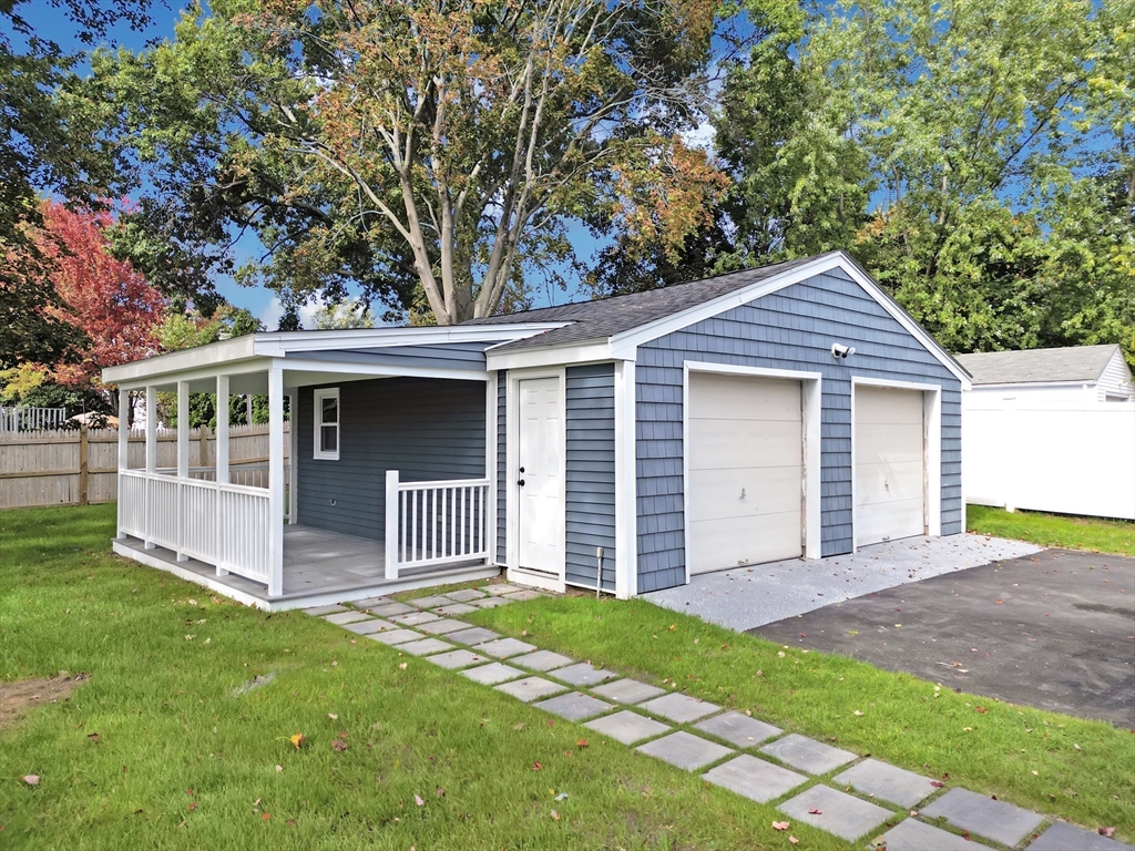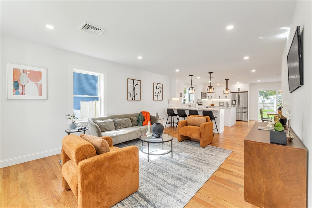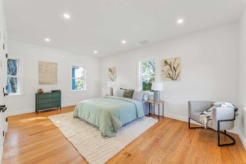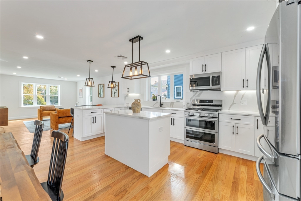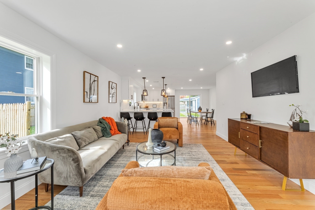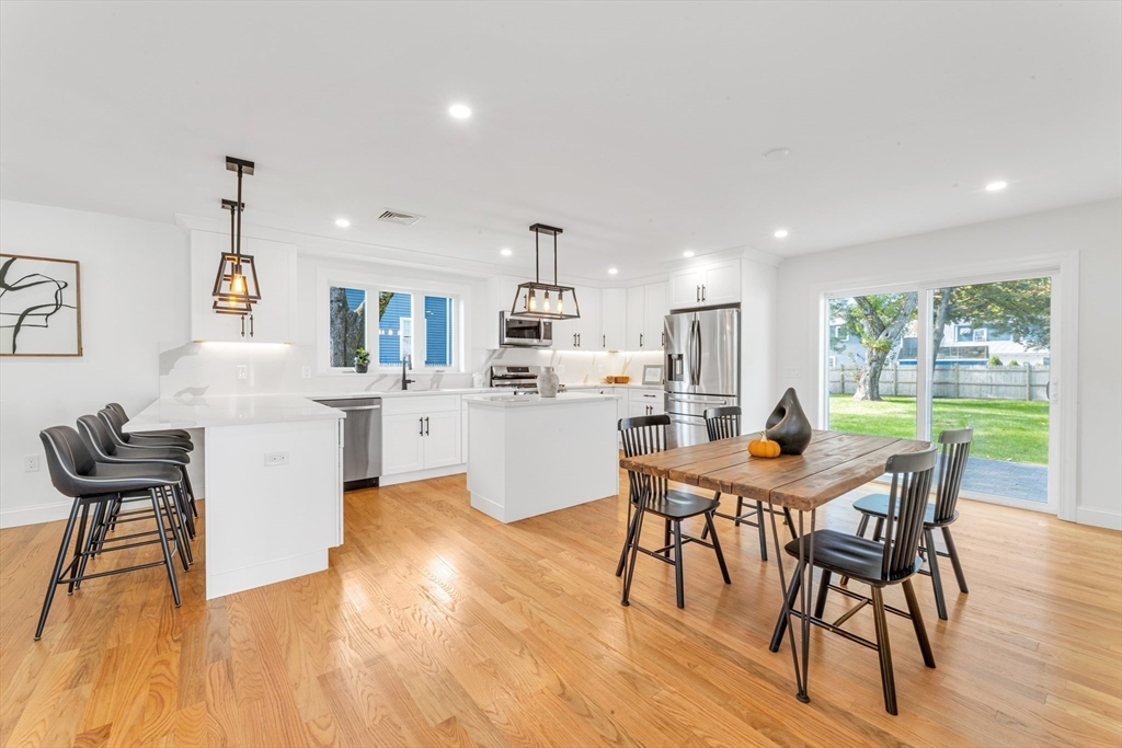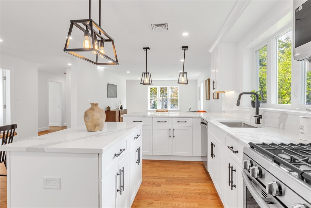 Completely gut renovated from the studs up, 1307 Washington St offers 4 beds, 3 full baths, and modern luxury throughout. The open-concept main level features a designer kitchen with quartz counters, stainless appliances, two kitchen islands that flow into the dining and living areas — perfect for entertaining. A first-floor bedroom and full bath provide ideal guest space. Upstairs includes a spacious primary suite with two closets and a spa-like bath. You'll also find two more large bedrooms, a full bath and the washer/dryer. The semi-finished basement offers great flex space for an office or play room. Enjoy a large detached garage, patio, and yard — all in a convenient Braintree location close to shops, parks, and commuter routes. New garage doors to be delivered/installed soon!