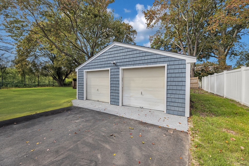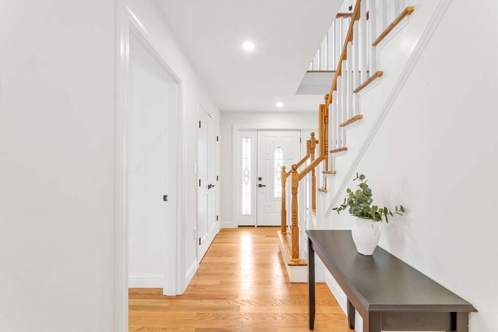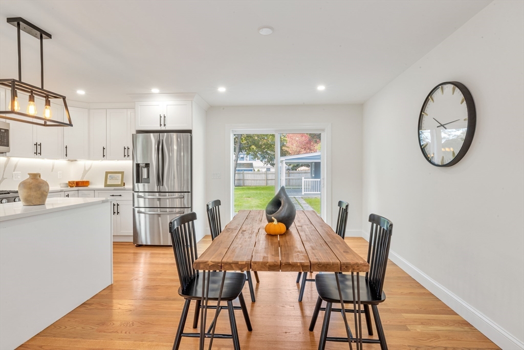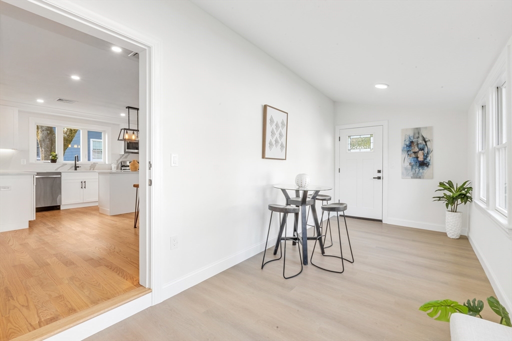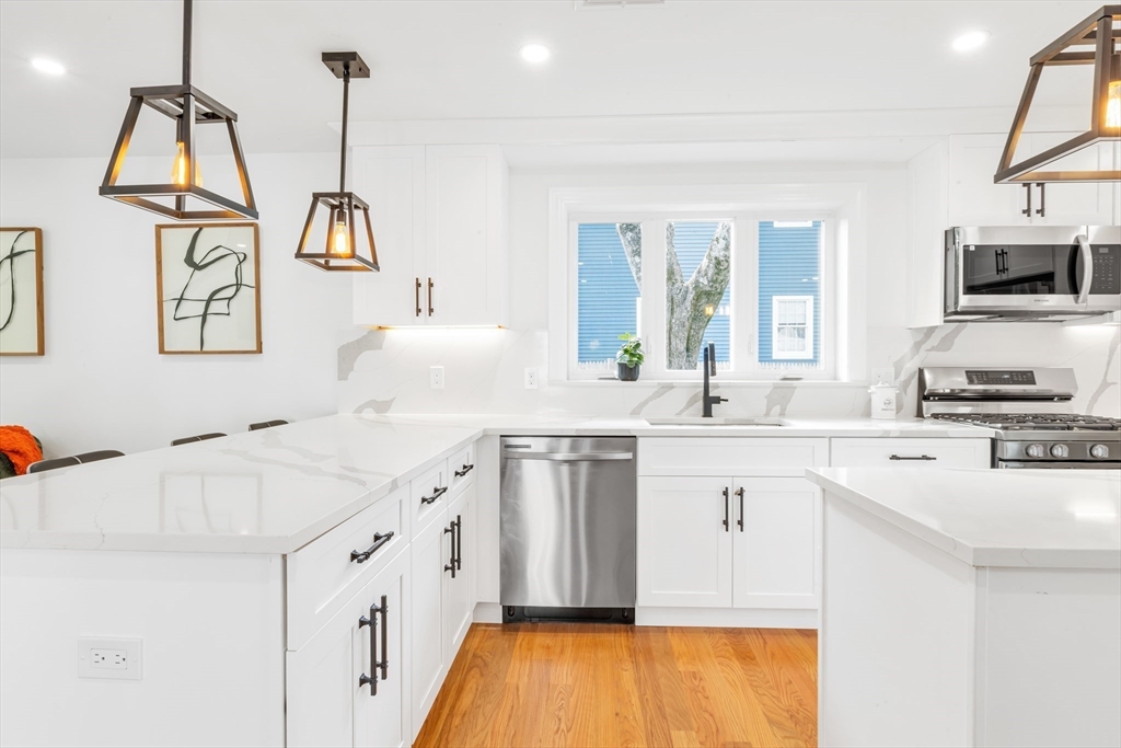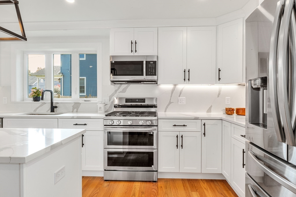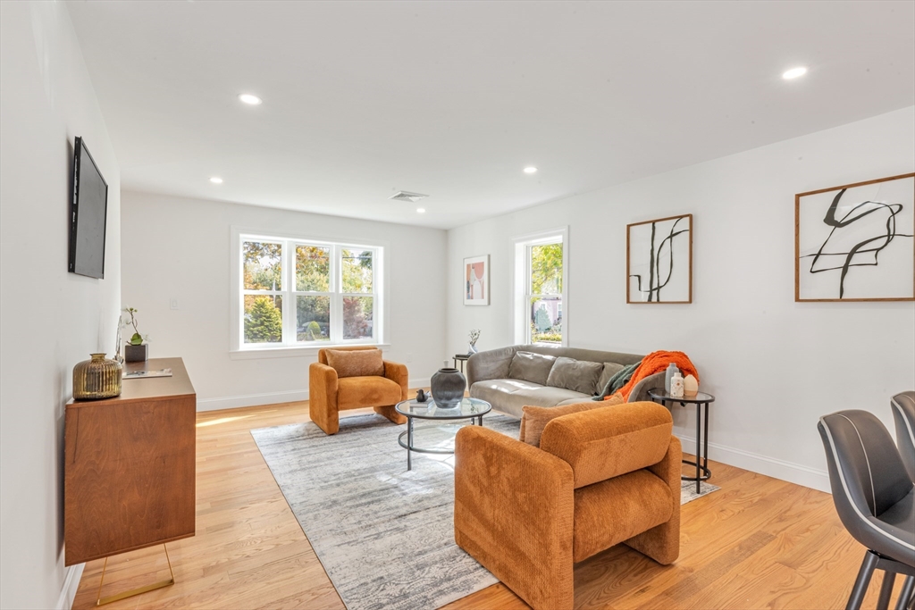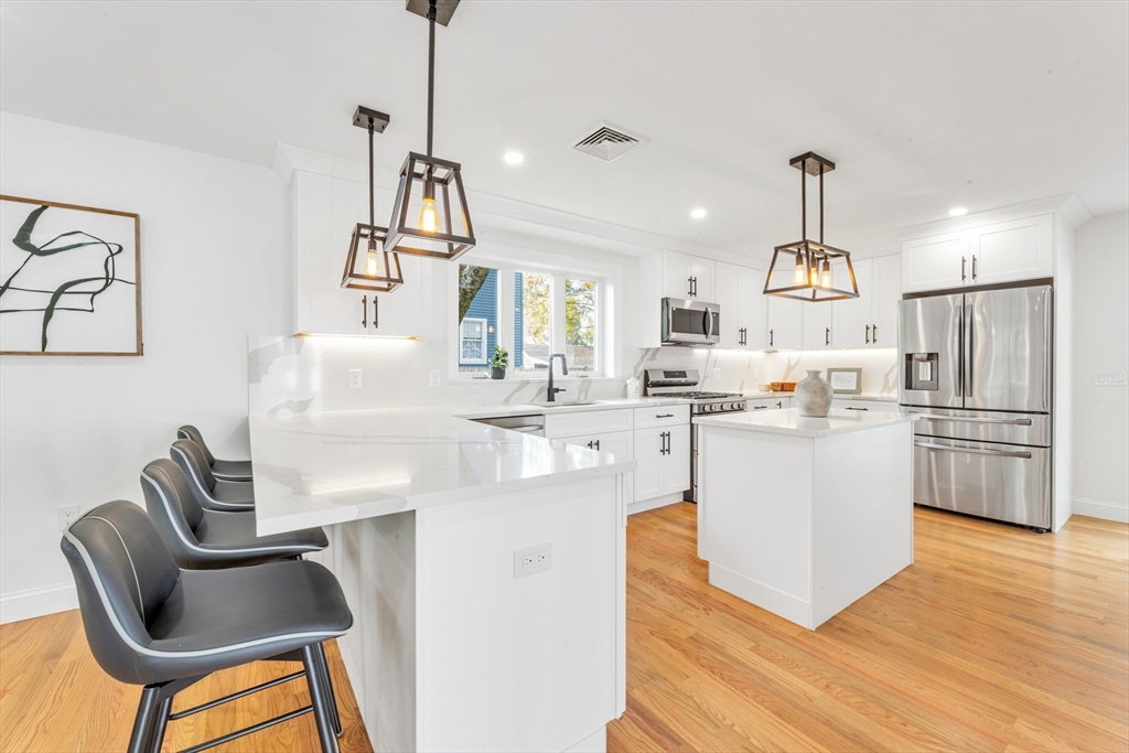 Completely gut renovated from the studs up, 1307 Washington St offers 4 beds, 3 full baths, and modern luxury throughout. The open-concept main level features a designer kitchen with quartz counters, stainless appliances, two kitchen islands that flow into the dining and living areas — perfect for entertaining. A first-floor bedroom and full bath provide ideal guest space. Upstairs includes a spacious primary suite with two closets and a spa-like bath. You'll also find two more large bedrooms, a full bath and the washer/dryer. The semi-finished basement offers great flex space for an office or play room. Enjoy a large detached garage, patio, and yard — all in a convenient Braintree location close to shops, parks, and commuter routes. New garage doors to be delivered/installed soon!