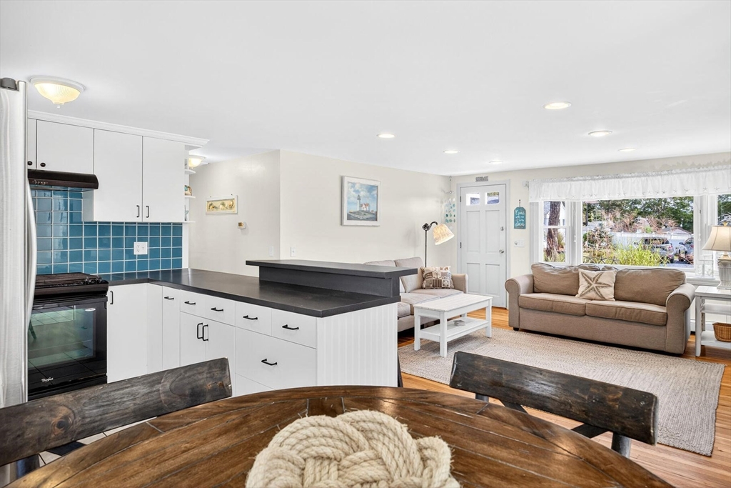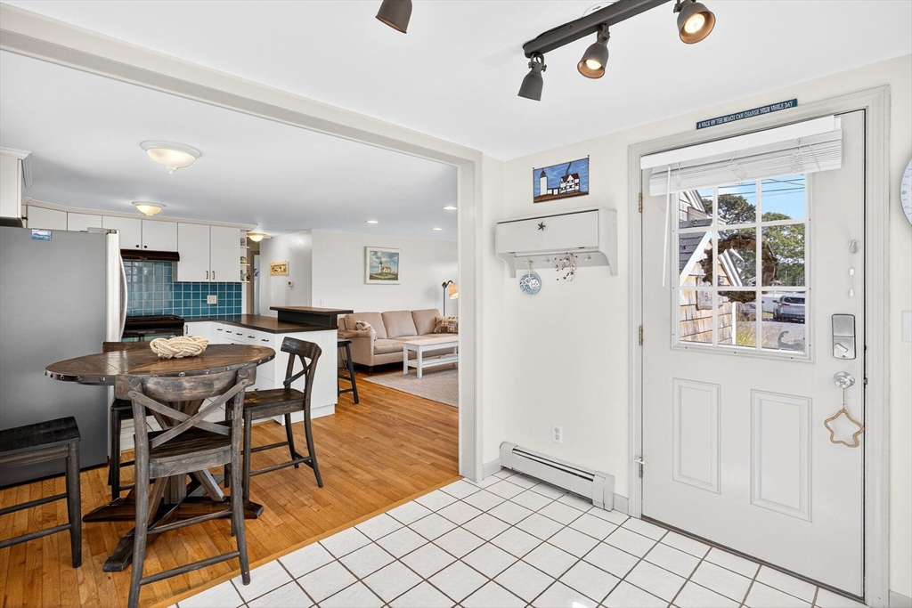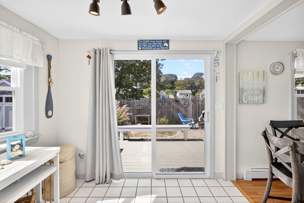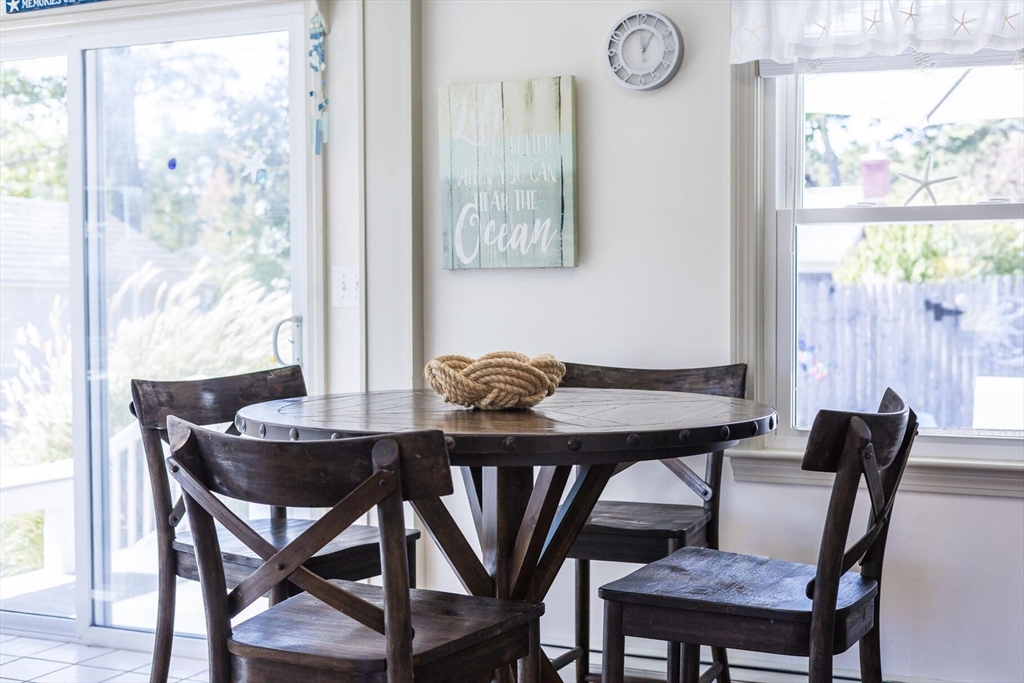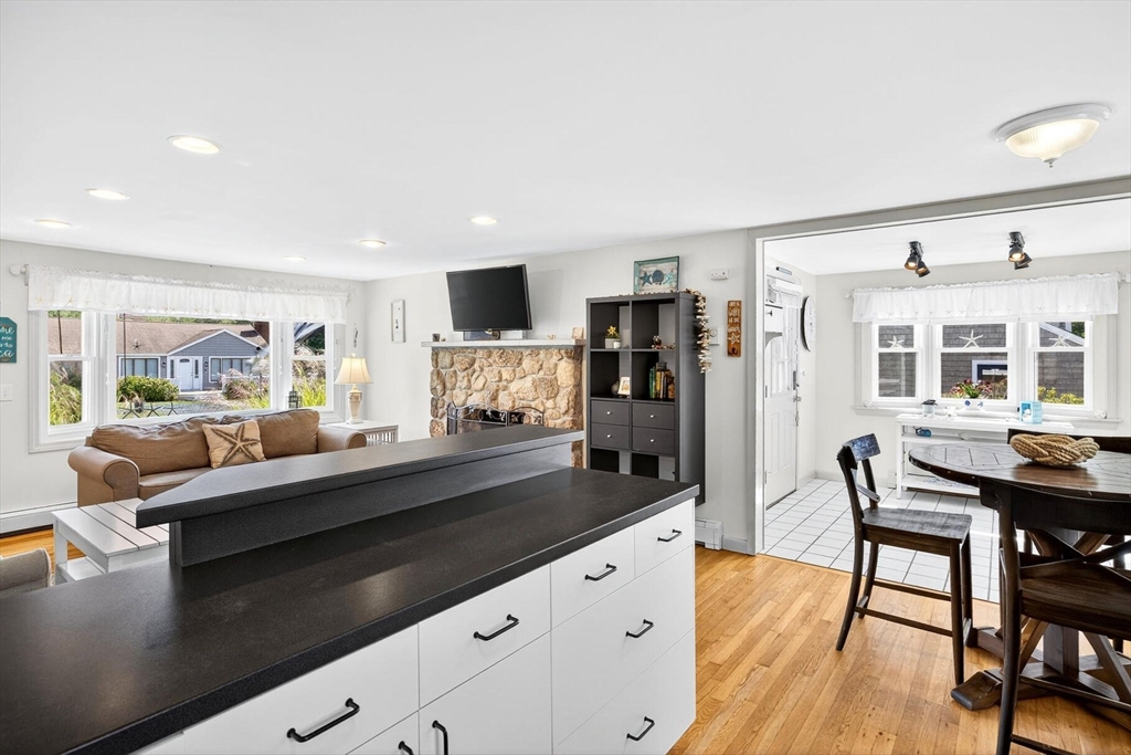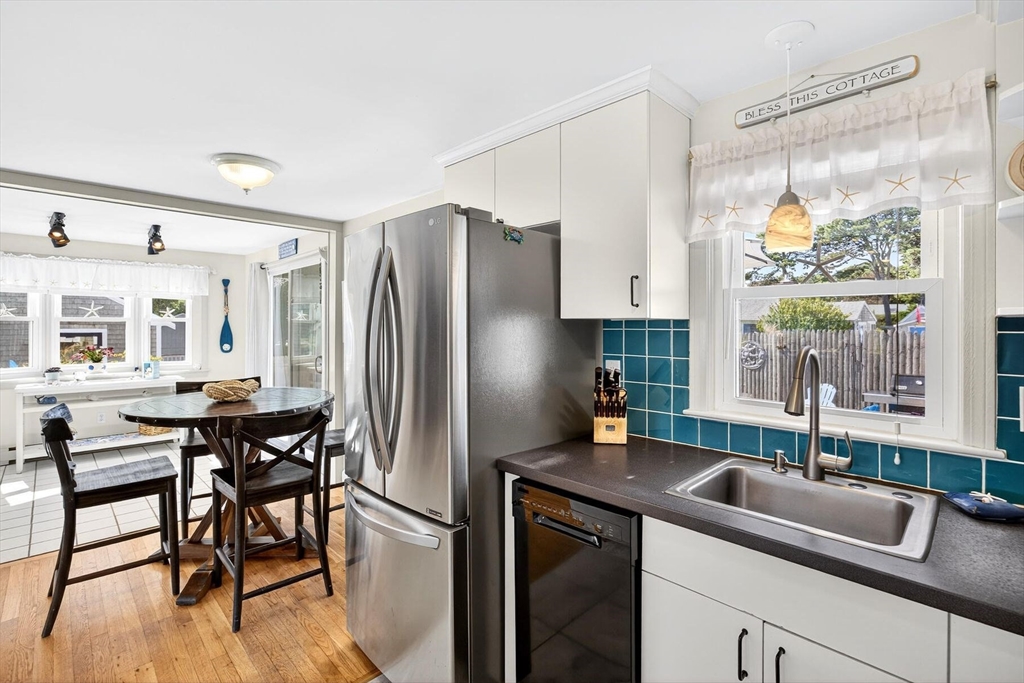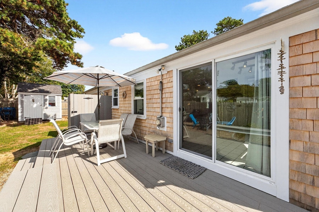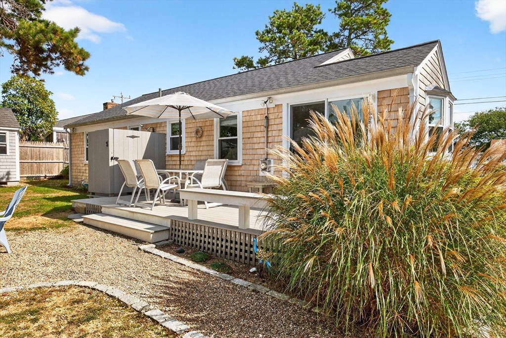 Discover coastal living on Easy Street! This delightful 3-bedroom, 1-bath cottage is just a short stroll from the sandy shores of Nantucket Sound. Inside, you'll find hardwood floors throughout, a sun-filled kitchen with dining area, and a welcoming living room with a bay window and a stone ventless gas fireplace. A bright sunroom opens directly to the spacious deck, creating the perfect flow for indoor-outdoor living. Step outside to enjoy a private backyard designed for relaxation and fun—featuring an outdoor shower to rinse off after the beach, a fenced yard for privacy, and two storage sheds for all your gear. Recent updates include new shingles and a new roof in 2024, along with a gas fireplace offering both style and peace of mind. With restaurants and local amenities close by, this cottage is the perfect blend of coastal charm and everyday convenience.