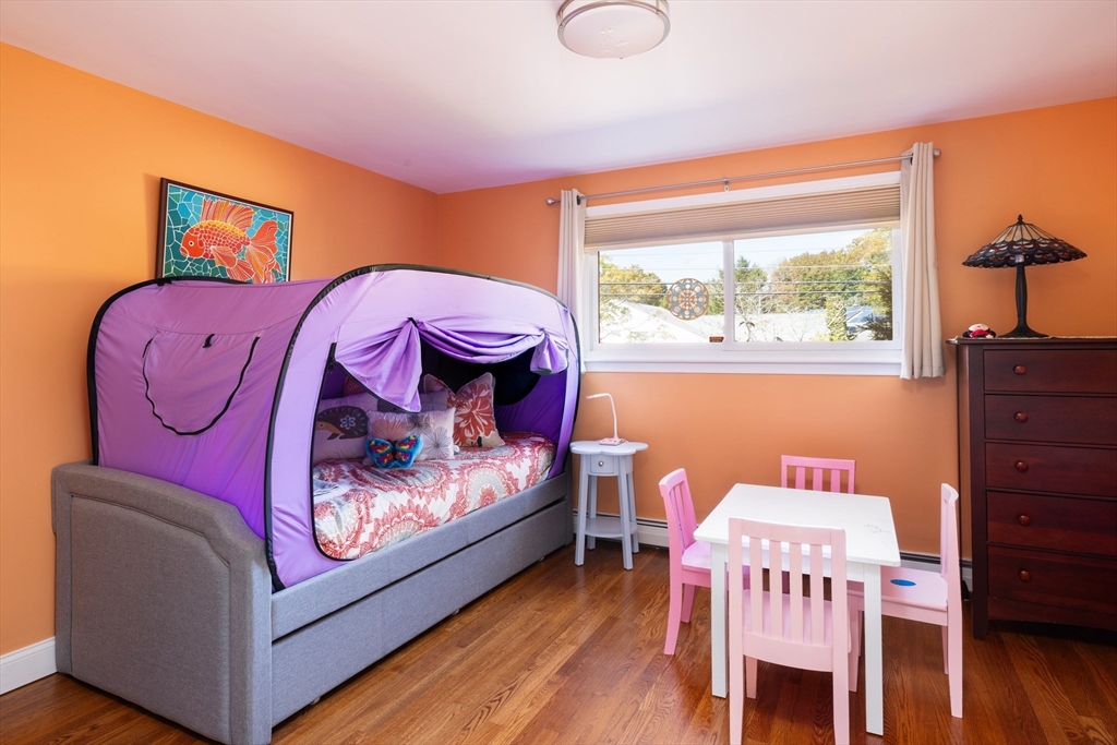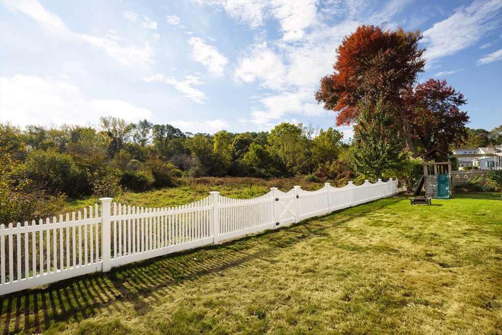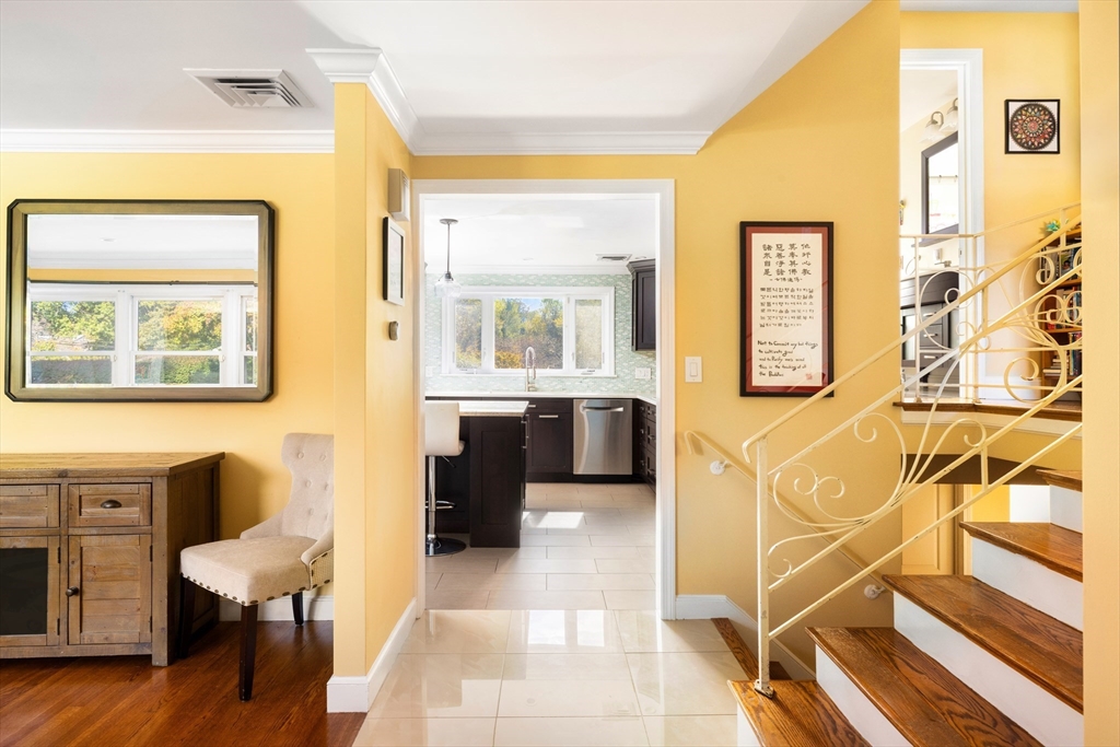 Abutting conservation land by Newton South High School, this updated home includes central AC and a direct entry two car garage. It's about a mile to the villages of Newton Centre & Newton Highlands plus Chestnut Hill shopping, and under a mile to the public schools. On the main level is a spacious living room with a fireplace that opens to the kitchen/family room area. Renovated in 2015, the kitchen has a huge island with a breakfast bar & stainless appliances. It is open to a dining area and the family room. French doors lead to a private office and sliders lead to a bright sunroom kept comfortable with a mini-split. This room has a door to the deck & fenced yard. A few stairs up from the entry lead to the main bedroom area including the primary bedroom with an en suite bathroom, plus two more large bedrooms, the second full bathroom & laundry. On the entry level is a mudroom with a door to the garage, fourth bedroom & third full bathroom. Enormous finished lower level bonus room.