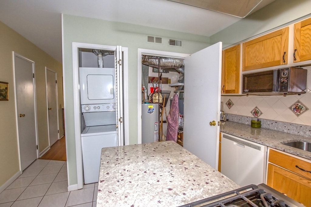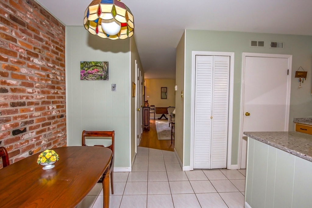 Beautifully maintained townhouse in the desirable Georgetown Condominiums on the Longmeadow line. This spacious home features a large living room that opens to the dining area with a charming brick wall and a sliding glass door leading to a private fenced patio overlooking a peaceful wooded area with a walking path into Forest Park—perfect for enjoying nature and wildlife. The kitchen offers newer granite countertops, backsplash, stainless steel gas range, and refrigerator. Convenient first-floor laundry and half bath. The second floor includes two generous bedrooms with abundnce of closets and built-ins, plus a full bath with a large shower stall. Condo fee covers everything except electric and taxes, offering easy, maintenance-free living in a serene setting close to shopping, dining, and highways.  Newer hot water tank 2021 and windows. Garage number 56.