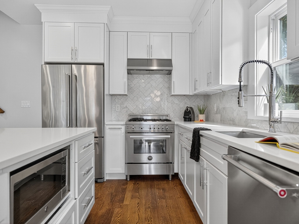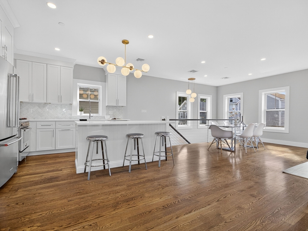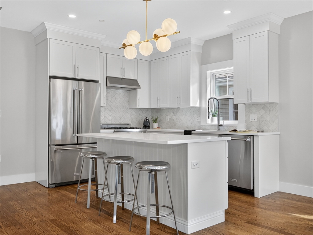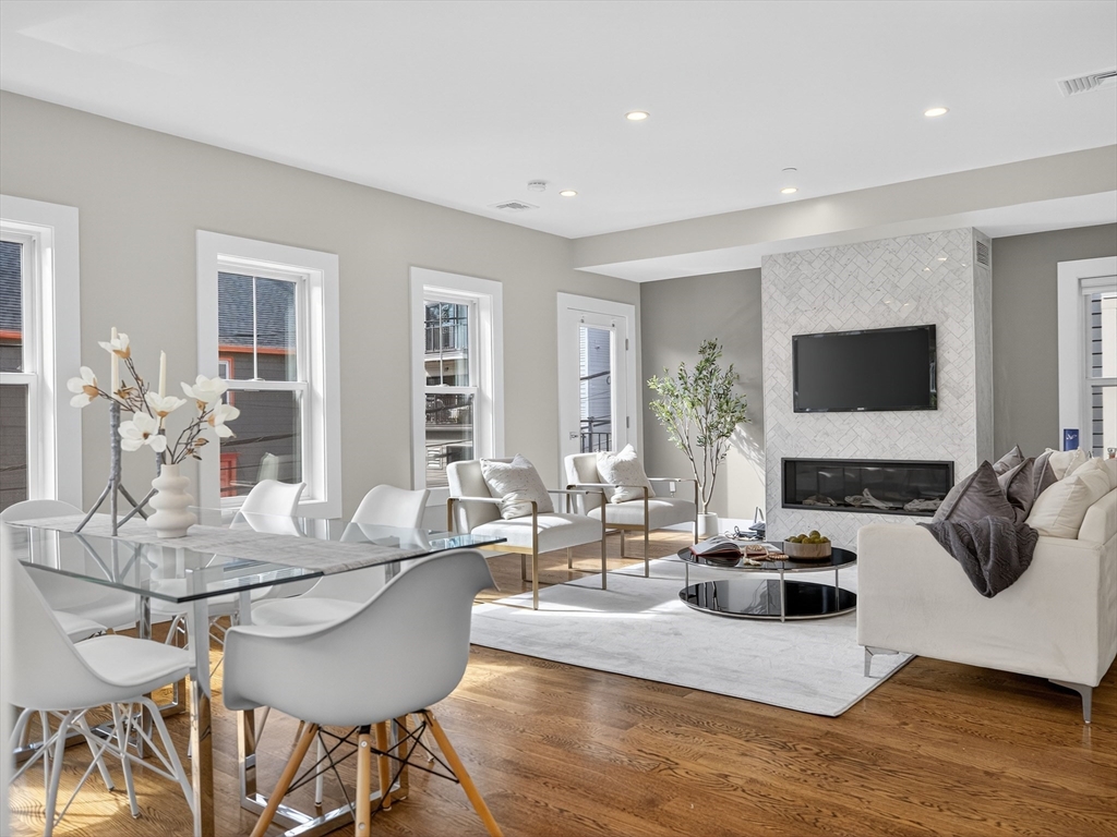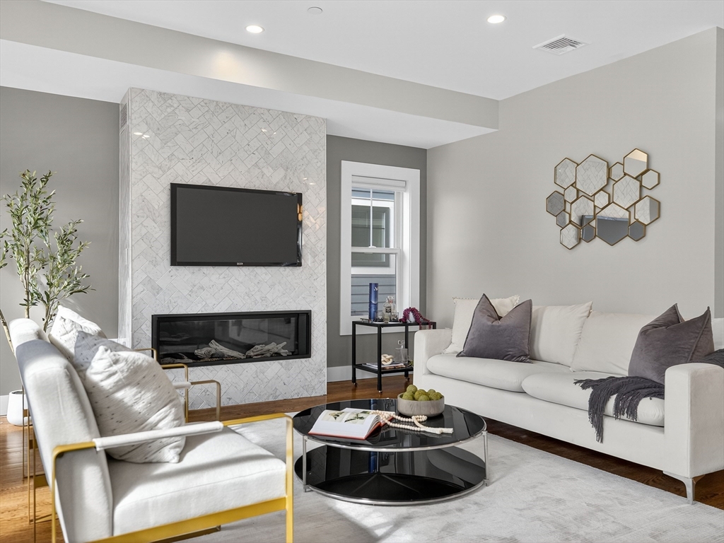 Light pours into this stunning front-facing townhouse-style condo, where contemporary design meets effortless living. The open floor plan is anchored by a sleek gas fireplace with herringbone tile surround and framed by a wall of oversized windows that fill the space with natural light. A designer kitchen shines with West Elm lighting, marble backsplash, and a spacious island ideal for casual dining or entertaining. Upstairs, the serene primary suite features a spa-like bath with dual rain showers, while two additional bedrooms offer flexibility for guests or creative spaces. A private walk-up roof deck offers a sun-soaked retreat with treetop views, ideal for relaxing or gathering with friends. The versatile first-floor flex room—perfect as an office, gym, or mudroom—adds convenience and function. With garage parking, Elfa closet systems, an EV charger, and a location near JP’s vibrant shops, green spaces, and Orange Line T, this home embodies elevated city living with a modern edge.