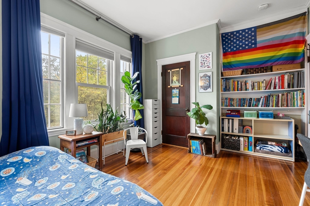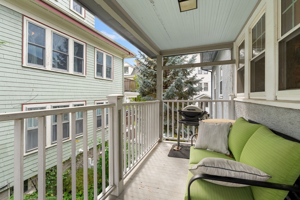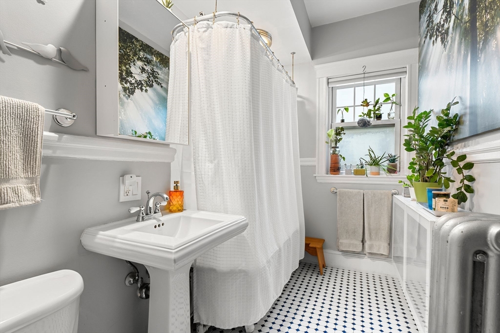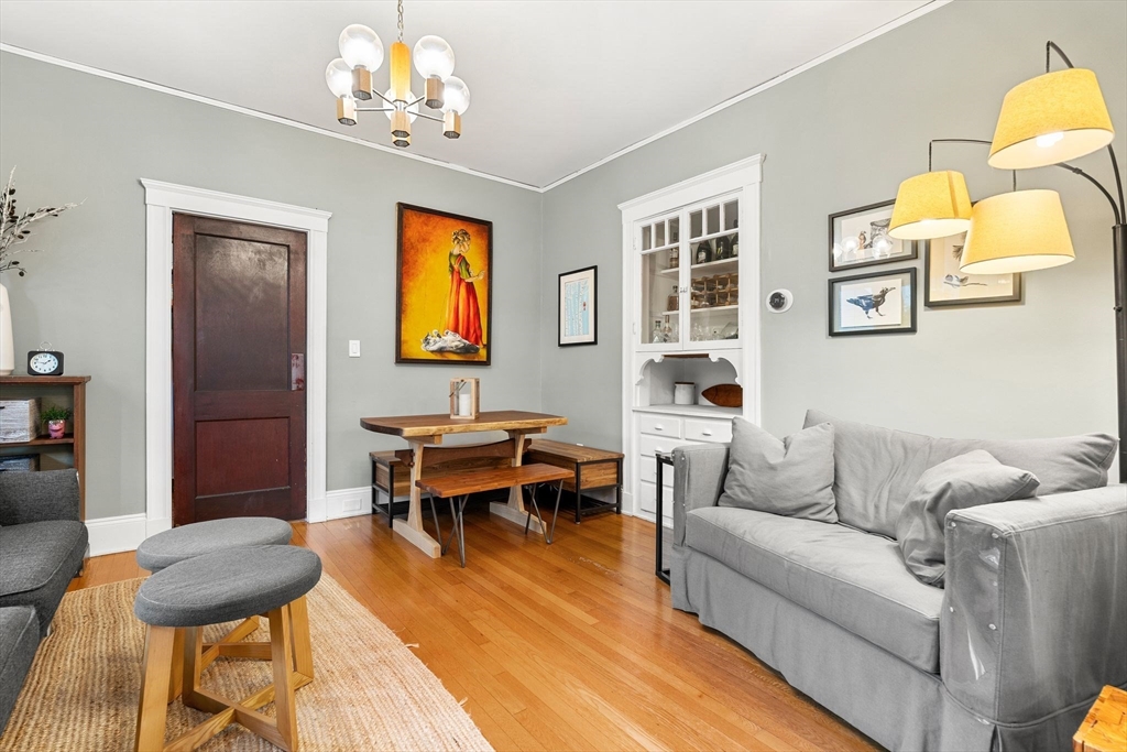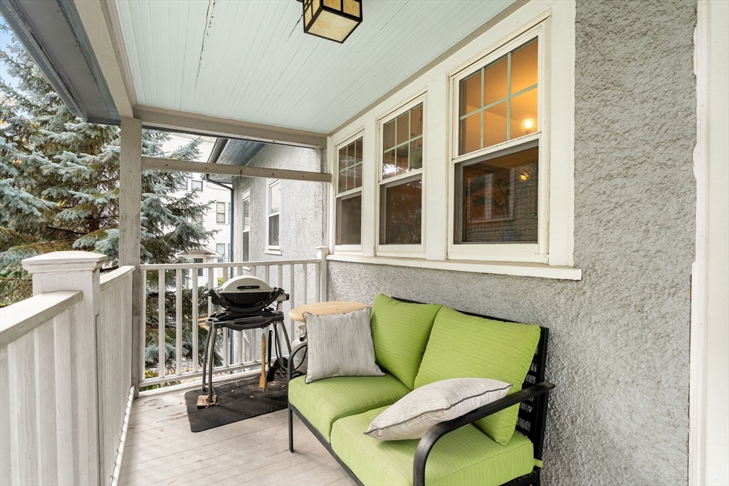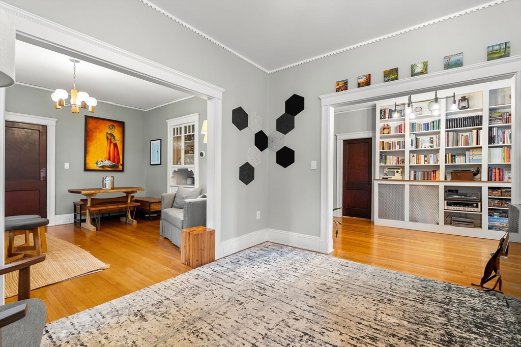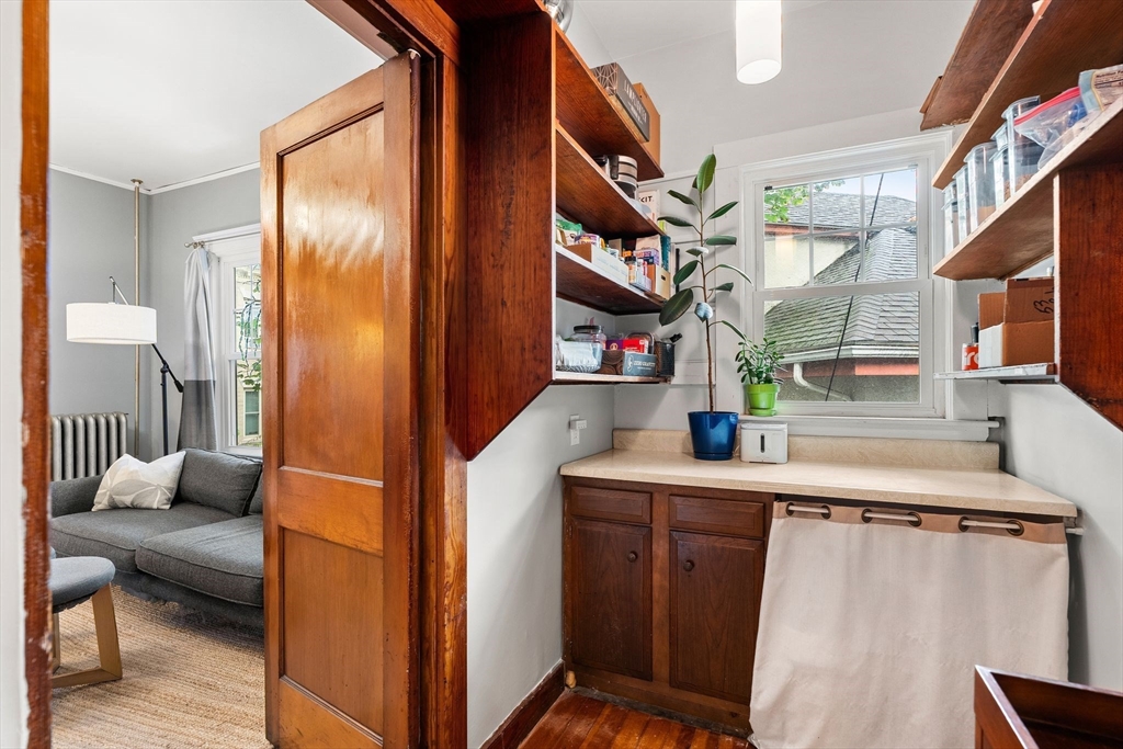 Charming 2 bed, 2nd floor condo is hidden just one block from bustling Centre St. in a quaint, tree-lined neighborhood. You’ll be greeted by an oversized foyer with a full wall of custom-built bookshelves, an office area, and access to the large front porch. Open floor plan with soaring ceilings flows into the formal living rm with decorative fireplace, currently being utilized as the piano room. Off the LR you'll find the family/dining area with original built-in hutch. A walk-through pantry leads to a well-appointed kitchen w/ a breakfast bar plus ample counter & storage space. Lovely bathroom is highlighted by a clawfoot tub & period details, and two large bedrooms on opposite sides provide exceptional privacy. Common laundry in building + large private basement storage rm. This home is a unique space offering a peaceful location in the cloud of urban life. Walkable to Centre St, Jamaica Pond, & an easy commute to downtown or Longwood via Orange Line T or 39 bus.