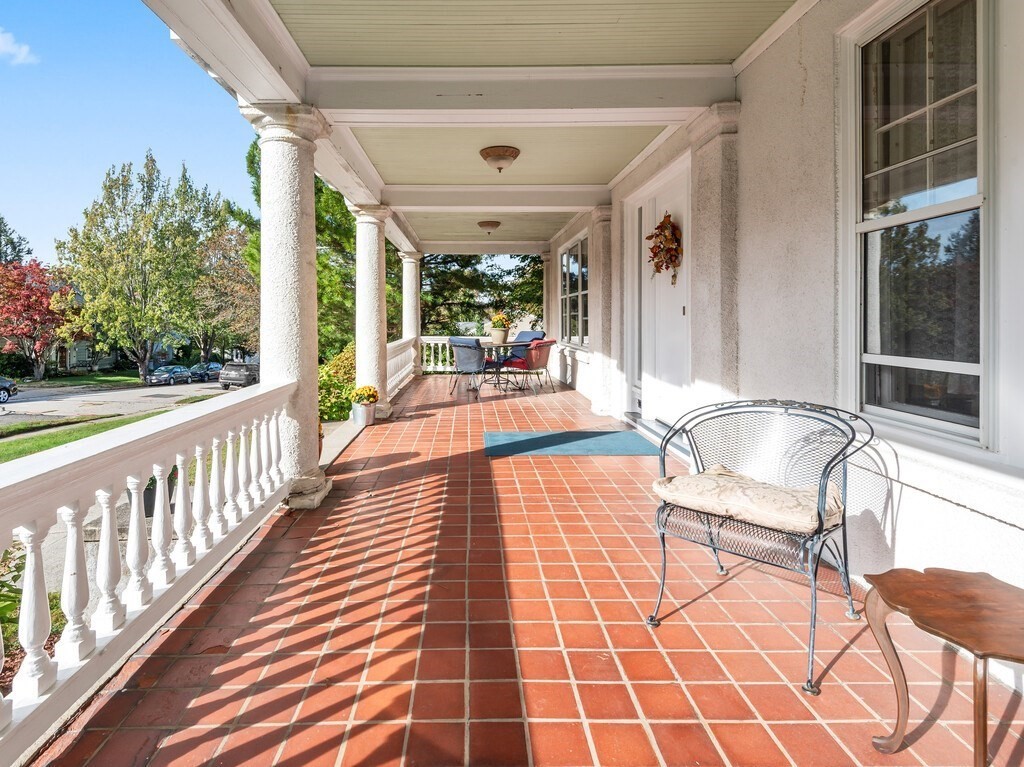 Beautifully crafted, this solid circa 1920 Federal Style home exudes charm with custom details that define the era. Original hardwood floors, intricate decorative molding, leaded glass windows, and two distinctive fireplaces. Generously sized formal dining and living rooms offer the perfect setting for entertaining. A versatile first-floor office and the light-filled sunroom seamlessly extends indoor relaxation with outdoor activities. Tastefully remodeled kitchen includes custom cherry cabinetry, Gaggenau cooktop, built-in oven, microwave, double sink and marble countertops. The built-in dining peninsula, and hutch are perfect for day-to-day use. Four generous sized bedrooms on second floor with two dual entry bathrooms from each room. Sun filled sitting area, perfect for a reading nook! Third level includes three additional bedrooms and full bathroom which has been newly updated. Stucco exterior, grand columed portico and two car garage add to the home's architectural appeal!