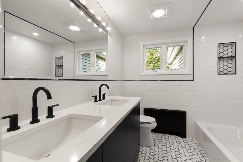 Discover this beautifully renovated 4-bedroom, 3 full bath multi-level home tucked away on a peaceful cul-de-sac. Designed for comfort and flexibility, two bedrooms are ensuite—one offering private exterior access for guests or extended family. The sunlit main living area features a fireplace, gleaming hardwood floors, recessed lighting and an open layout perfect for entertaining. Recent updates include a renovated kitchen and two renovated baths, a new energy-efficient heat pump system with central air, 200 amp service, new roof and new insulation, Recent renovations bring a modern feel throughout. Step outside to enjoy the expansive, level yard—ideal for gatherings, play, or quiet relaxation. A perfect blend of style, space, and convenience awaits. Convenient to public transportation, schools and highways.