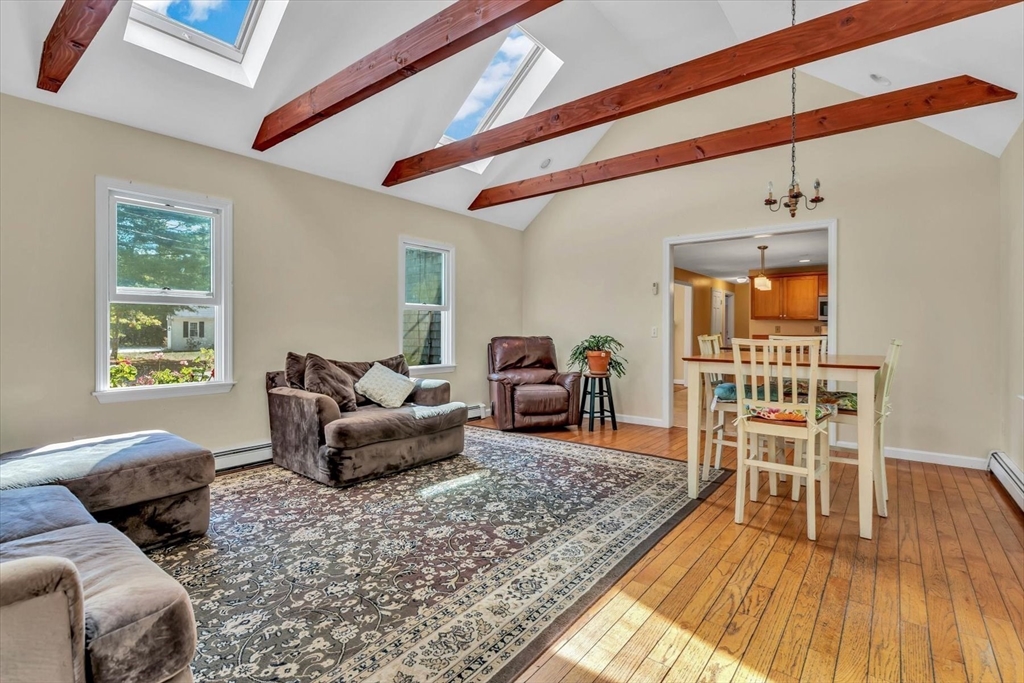Located in the sought-after village of Cotuit, this inviting home offers comfort, light, and a peaceful setting. The first floor features hardwood floors in the main living areas, fresh carpeting in the 2 bedrooms upstairs, and a convenient mudroom entry. A beamed cathedral ceiling, skylights, and a slider to the backyard define the spacious great room, creating an open and relaxed feel. The kitchen's central island is perfect for casual dining and gathering. The first-floor primary ensuite includes a walk-in closet and a calm, private atmosphere. Upstairs, flexible space suits guests, work, or hobbies. Set amid quiet streets and natural beauty, this home captures the essence of Cotuit living. Warm, practical, and close to beaches, village shops, and walking trails.