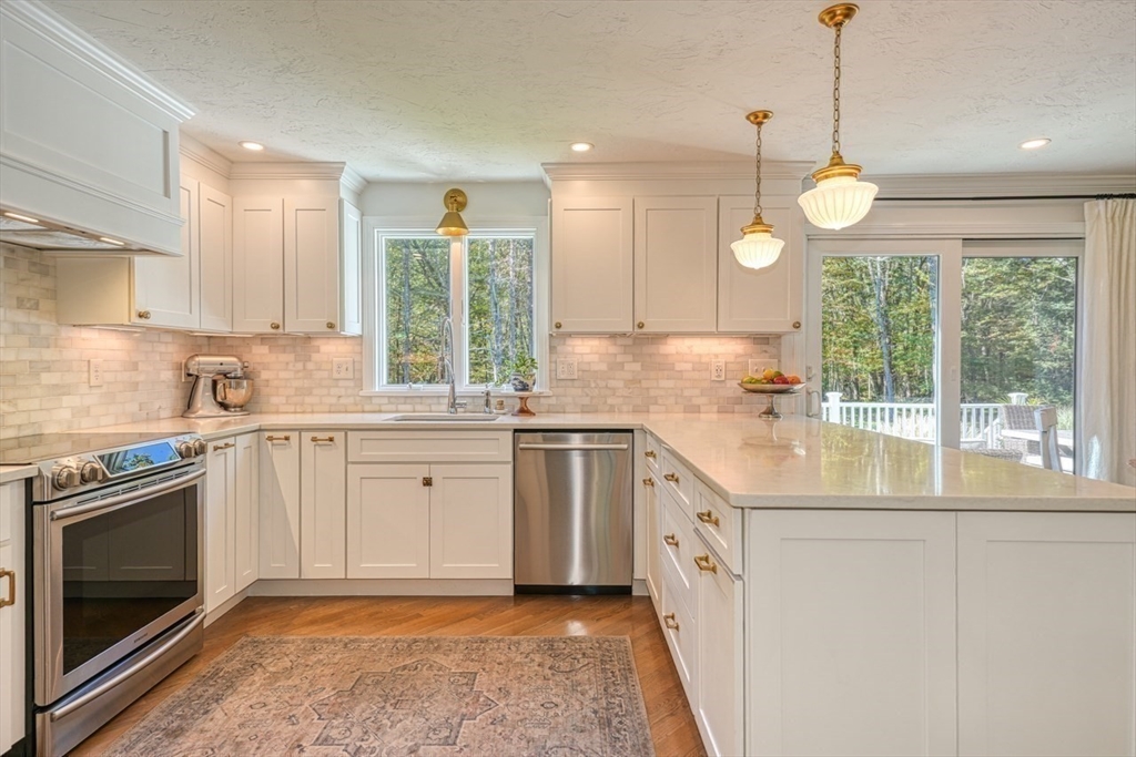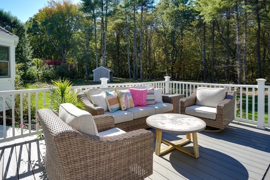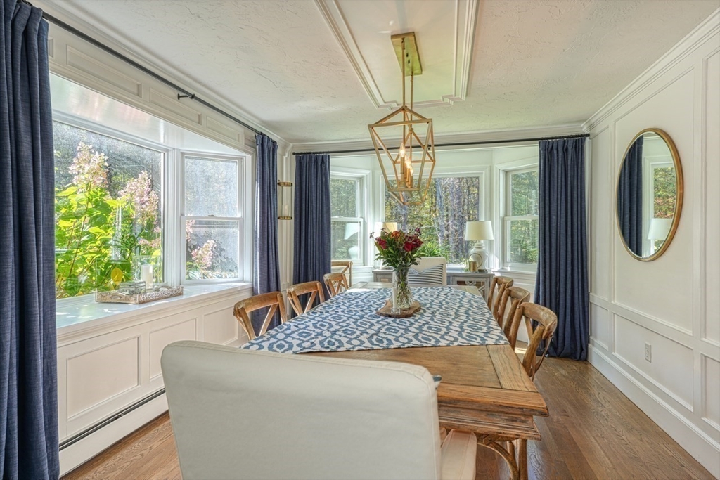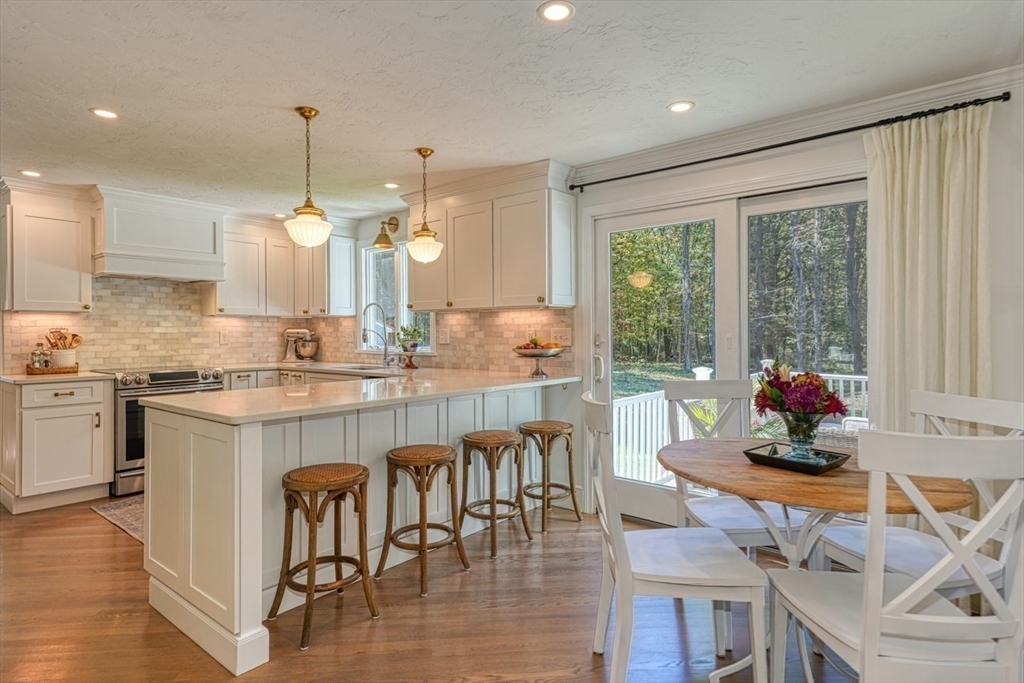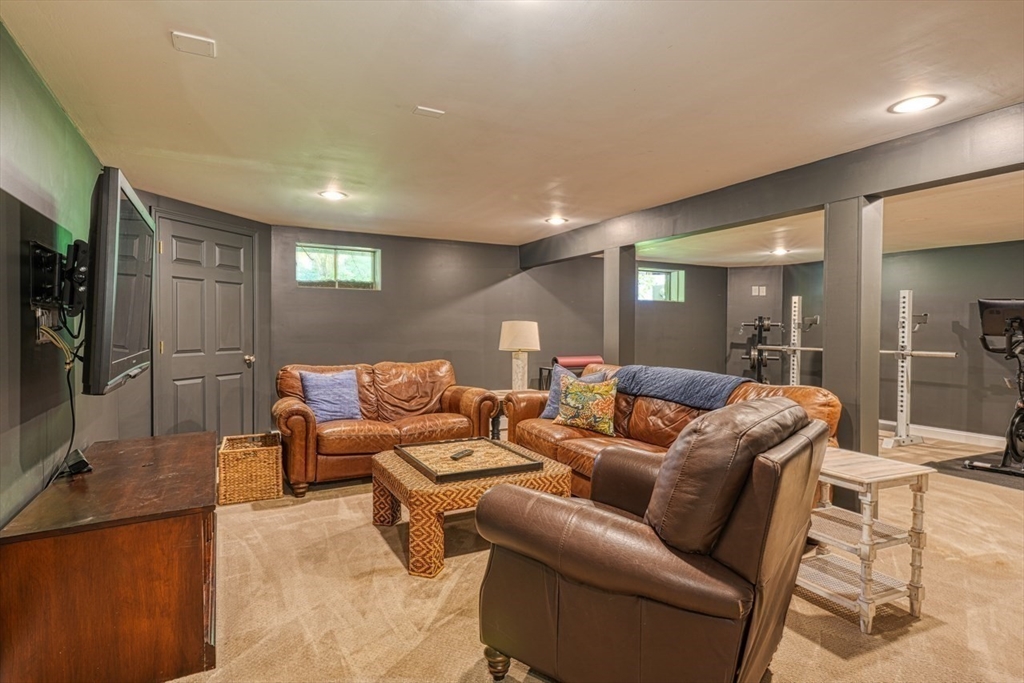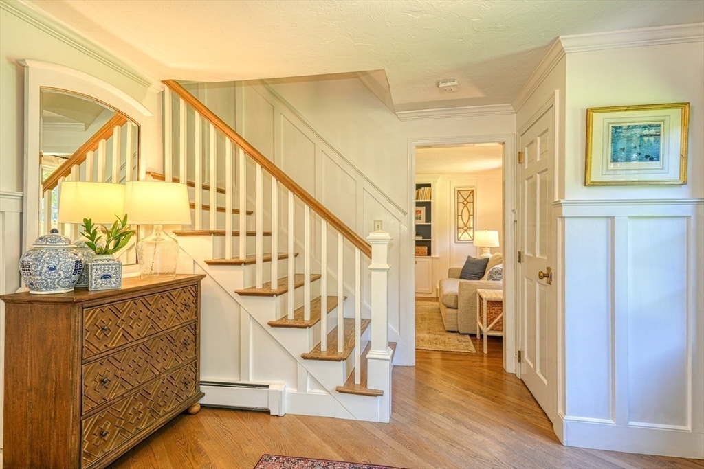Beautifully updated and meticulously maintained Colonial offering a spacious and functional layout. The remodeled kitchen features sleek quartz countertops, ample cabinetry, and newer stainless steel appliances. Enjoy a sun-filled family room with a cozy fireplace, a gracious living room with custom built-in shelving, and an elegant formal dining room with detailed trim work. Step outside to a generous deck with retractable awning overlooking a serene, landscaped backyard with a built-in fire pit—ideal for outdoor entertaining. The second level boasts a large primary suite with a fully renovated bathroom featuring marble tile, plus three additional well-sized bedrooms and a stylish updated full bath. The finished lower level offers a versatile bonus room with high ceilings, perfect for a home office, gym, or recreation space. Notable updates include windows (2024/2012), roof and gutters (2021), and furnace and hot water tank (2020). Truly move-in ready!