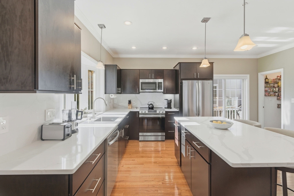 Welcome to Merrimac Condominiums! This lovely desirable End unit Townhome offers 3 Bedrooms, 2 Full Baths and 1 half bath. Open concept eat-in Kitchen with stone countertops, island stone backsplash, recessed lighting, crown molding, balcony to sit out and enjoy the fall weather, 2 walk-in pantry's, Living Room w/ gas fireplace, crown molding, recessed lighting, Primary suite has balcony to sit out and relax, large walk-in closet, full bath, 2 additional spacious bedrooms w/ ample closet space, full bath in hallway, 2 additional spacous Bedrooms with ample closet space, lower level has family room/office with closet, access to the unfinished basement, 2-car garage, yard space. The basement features high ceilings, 3/4-size windows, and plenty of storage. Close to shopping, restaurants, schools, parks, and major commuting routes. Situated in sought-after Sargent School District. OPEN HOUSE Sunday, 10/19 12-1:30. OFFERS DUE: Tuesday, 10/21 at 10 am. Schedule your showing today!