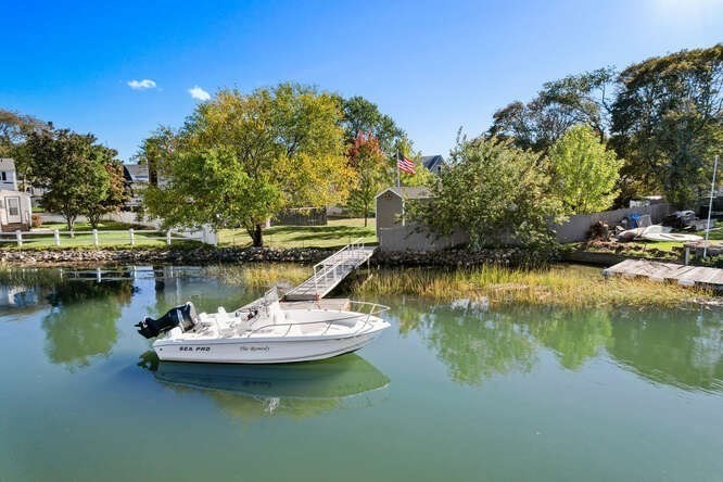 Fisherman’s delight — or simply enjoy the view! Located directly on the scenic Saugus River with your own private dock, this special home offers the perfect blend of comfort, condition, and waterfront living — and the seller says the boat stays! The first floor features an open-concept kitchen and dining room with a working wood-burning fireplace, ideal for gatherings year-round. A spacious family room and convenient half bath complete this level. The large eat-in kitchen includes an island and access to a 22’x24’ deck with awning and night lighting, perfect for entertaining while overlooking the water. Upstairs you’ll find three bedrooms and a full bath. The high-ceiling basement offers excellent potential for finishing to add more living space. Recent improvements include a high-efficiency FHW x gas heating system and hot water (2021), plus roof, siding, windows, front steps, and electrical service (2011). The property sits on a large, level lot with a 20’x8’ storage shed