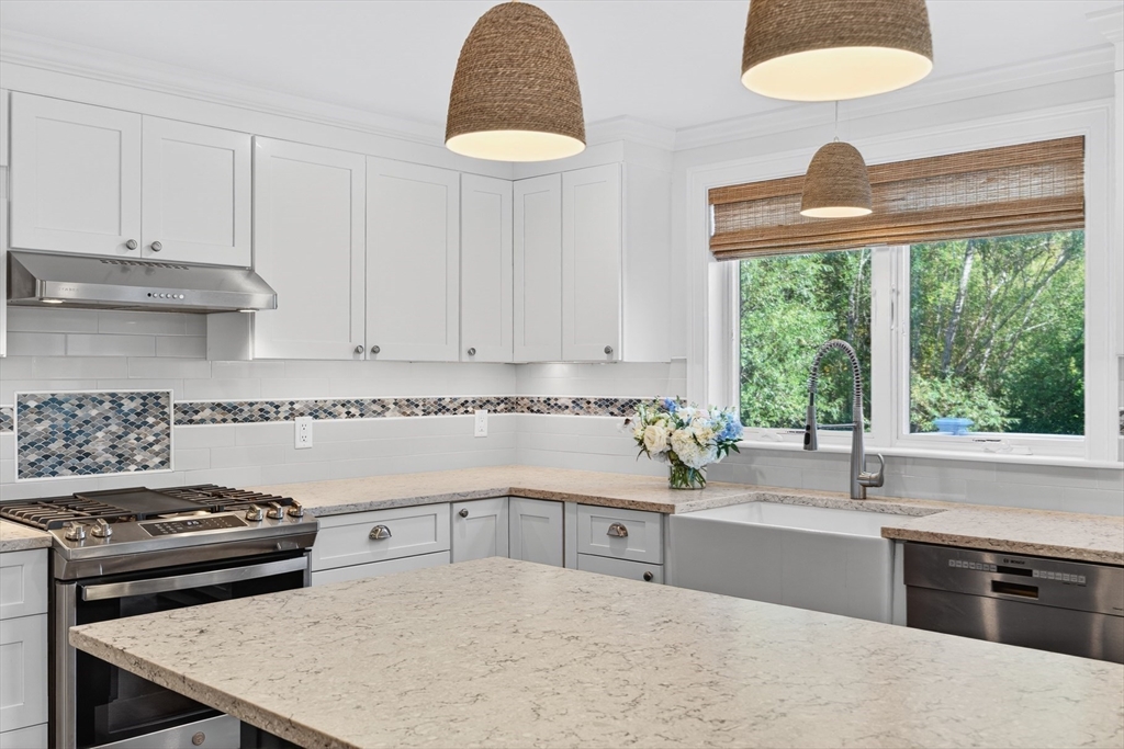 Renovated Cape nestled in the heart of the Popponesset Beach Association. This charming home offers tranquil views of Deans Pond and is just a short stroll or bike ride to your private association beach, where expansive sands meet the sparkling waters of Nantucket Sound. Whether you're seeking a summer escape or a year-round residence, this property is ready for its next adventure. Inside, you'll find three spacious bedrooms and three and a half beautifully appointed bathrooms. The brand-new kitchen features stainless steel appliances, custom cabinetry, and a striking white subway tile backsplash accented with a blue scallop design. The open living room invites relaxation with a gas fireplace, custom built-ins, crown molding, and shiplap detailing throughout. Step outside to a large wooden deck off the kitchen and dining area, perfect for entertaining. A few steps down leads to a stunning stone patio that extends your living space into the outdoors and to Deans Pond to Kayak or fish!