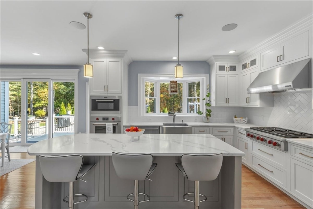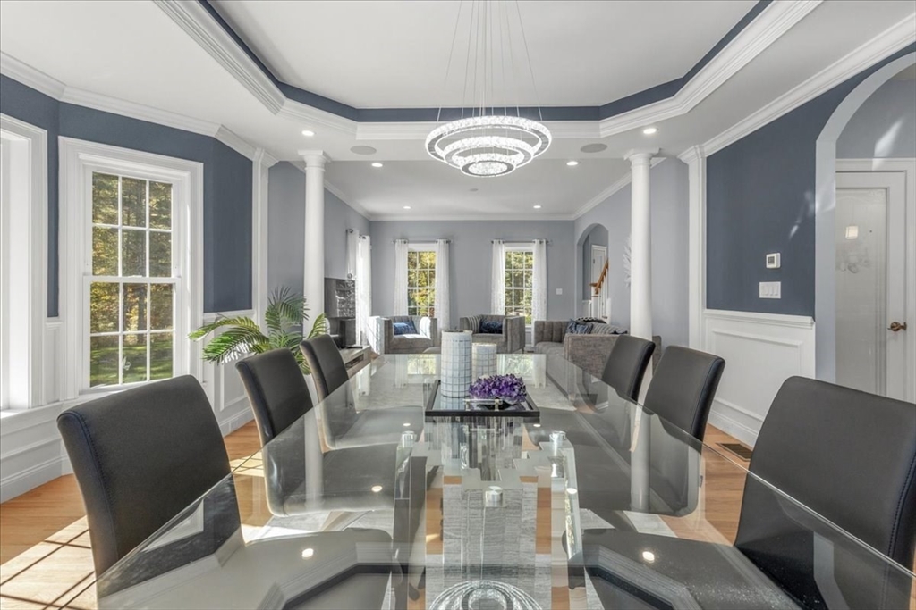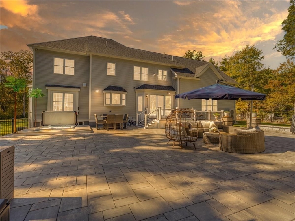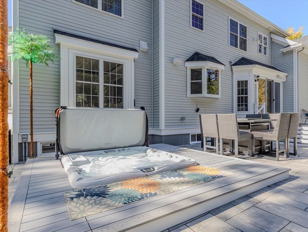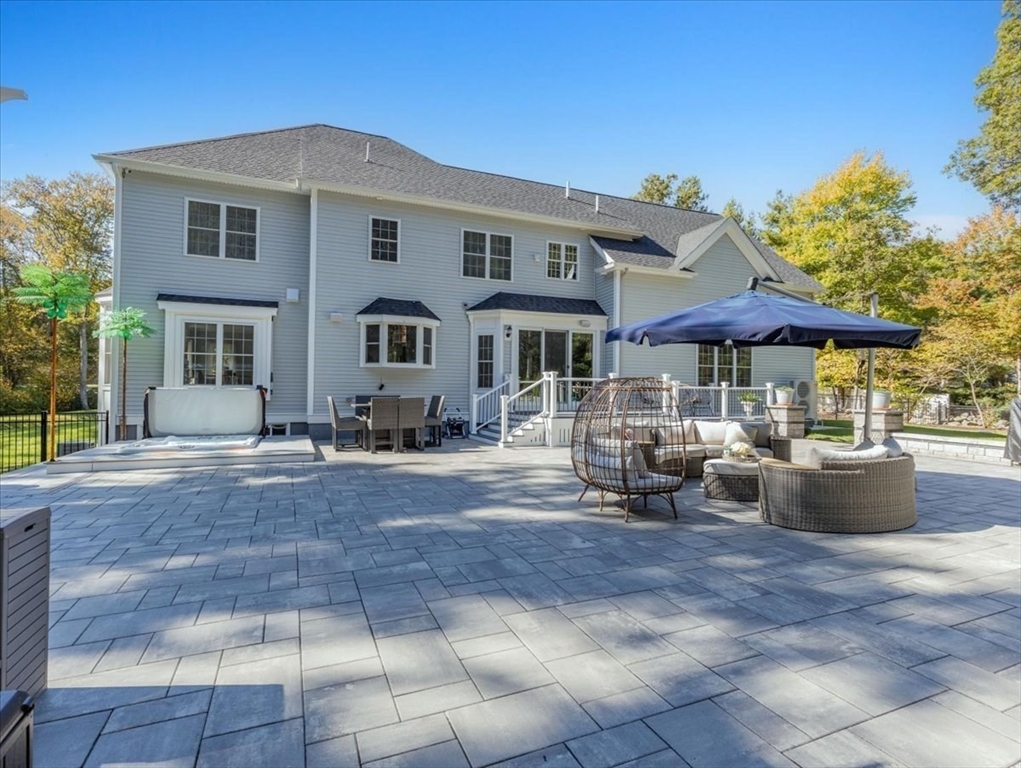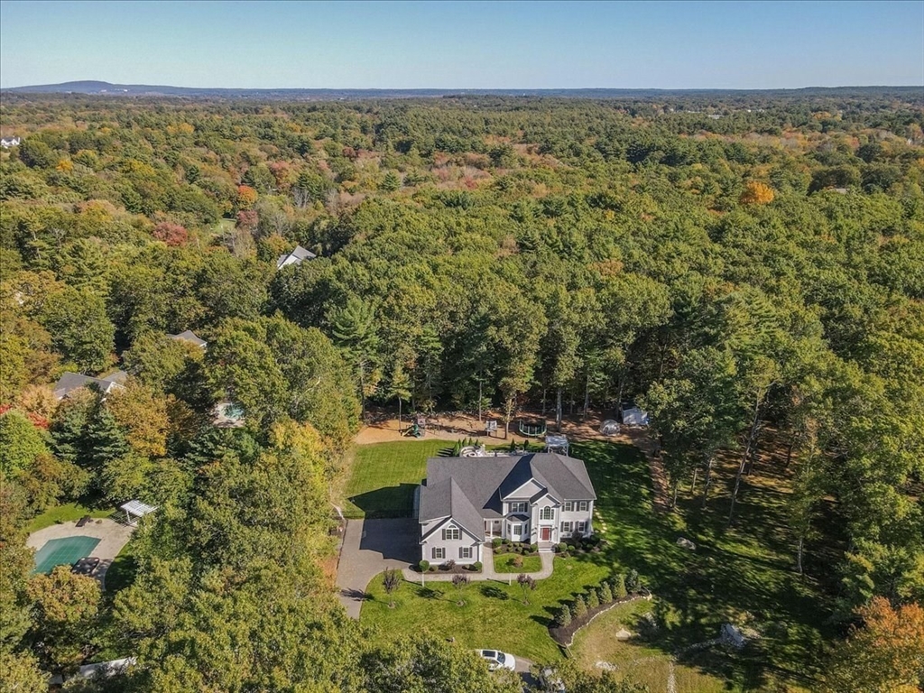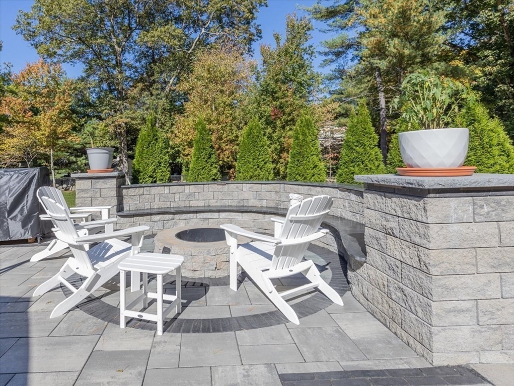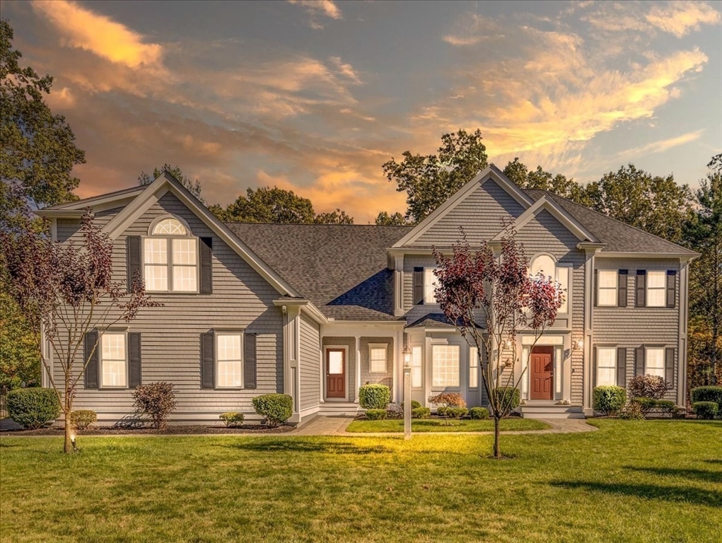 Welcome to 4 Lost Brook Trail in Walpole—an exceptional 5BR, 3BA Colonial built in 2020 on 2.94 private acres abutting conservation land. With 5800 sq ft, this home impresses with a soaring foyer, custom millwork, and abundant light. The gourmet kitchen offers a large 8 1/2 foot island, high-end Wolf appliances, 42" Sub-Zero fridge, walk-in pantry, and breakfast nook opening to a step-down cathedral family room with fireplace. Formal dining with bay window and an elegant living room provide ideal entertaining. The primary suite boasts a tray ceiling, spa bath with soaking tub, glass shower, dual vanities, and walk-in closet. Three additional bedrooms plus a bonus room add flexibility. The finished basement with bar and movie theatre elevates recreation. Outdoors, enjoy an expansive 50'x56' patio with built-in hot tub, firepit, and pergola. Nestled in North Walpole’s premier enclave near schools, parks, shopping, and major routes, this rare offering is complete with a three-car garage.