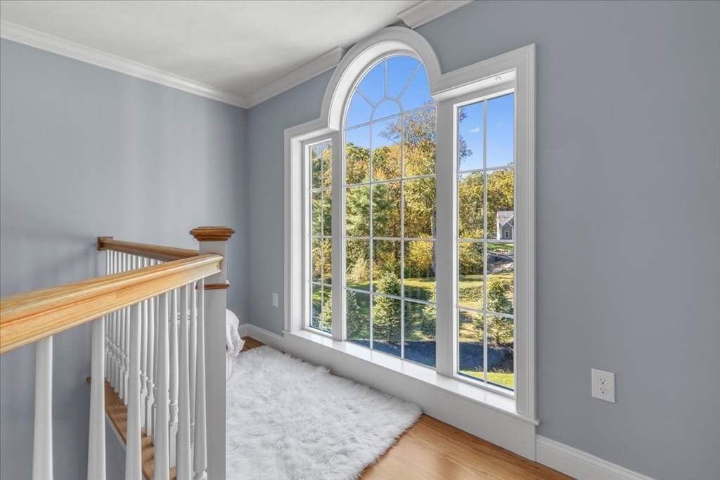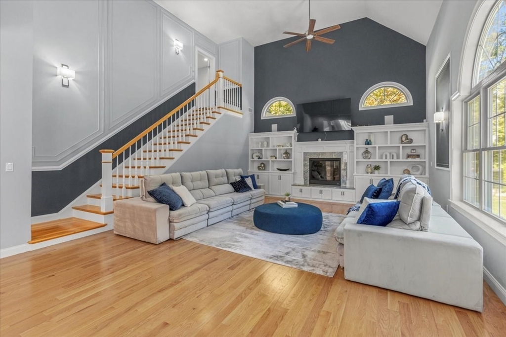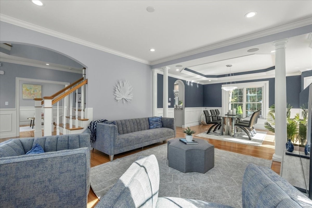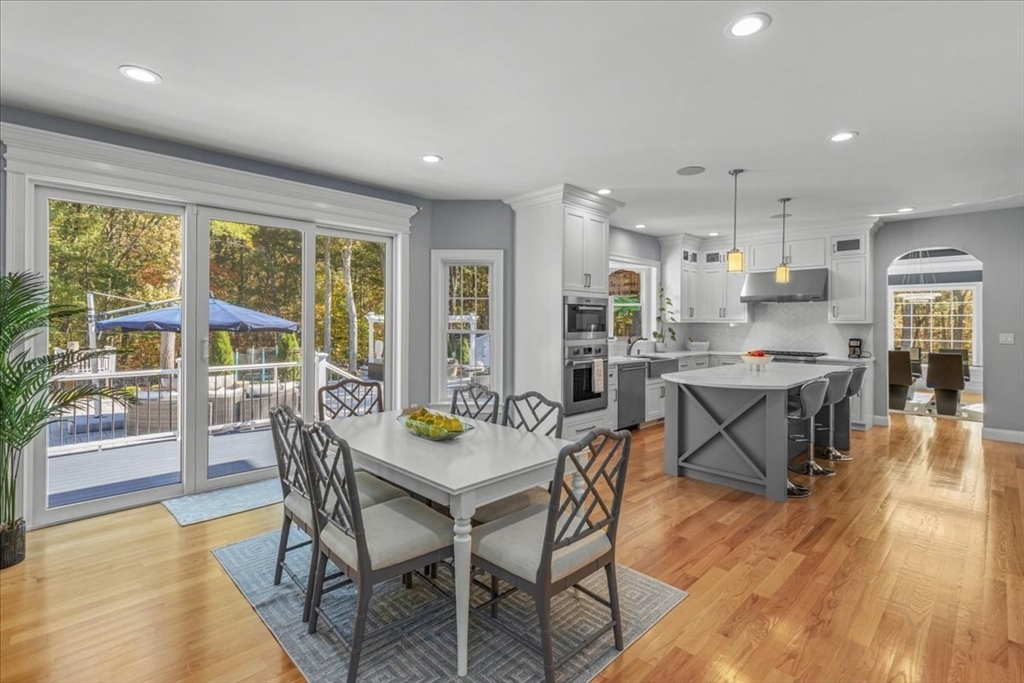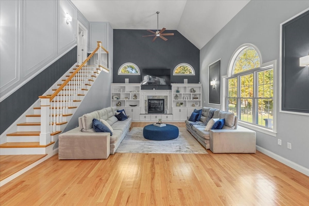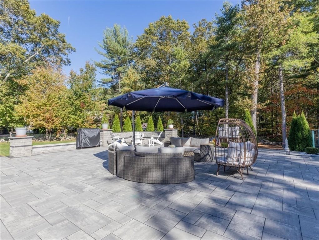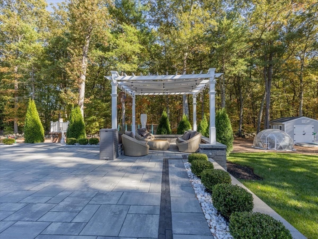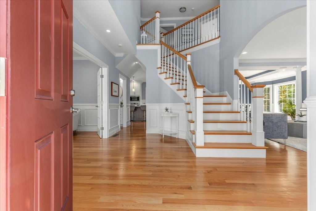 Welcome to 4 Lost Brook Trail in Walpole—an exceptional 5BR, 3BA Colonial built in 2020 on 2.94 private acres abutting conservation land. With 5800 sq ft, this home impresses with a soaring foyer, custom millwork, and abundant light. The gourmet kitchen offers a large 8 1/2 foot island, high-end Wolf appliances, 42" Sub-Zero fridge, walk-in pantry, and breakfast nook opening to a step-down cathedral family room with fireplace. Formal dining with bay window and an elegant living room provide ideal entertaining. The primary suite boasts a tray ceiling, spa bath with soaking tub, glass shower, dual vanities, and walk-in closet. Three additional bedrooms plus a bonus room add flexibility. The finished basement with bar and movie theatre elevates recreation. Outdoors, enjoy an expansive 50'x56' patio with built-in hot tub, firepit, and pergola. Nestled in North Walpole’s premier enclave near schools, parks, shopping, and major routes, this rare offering is complete with a three-car garage.