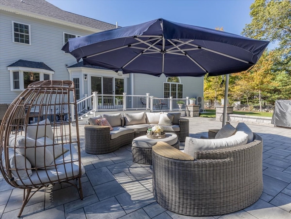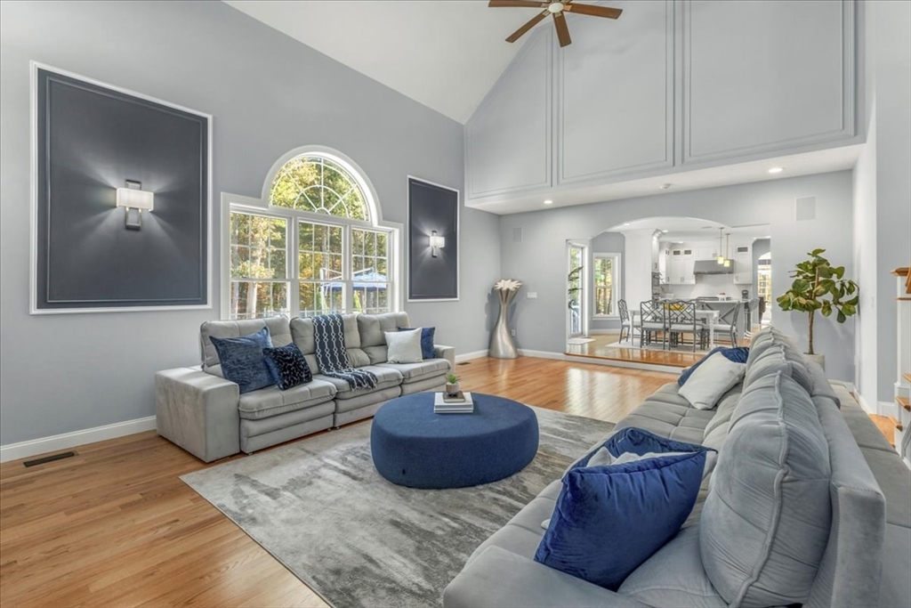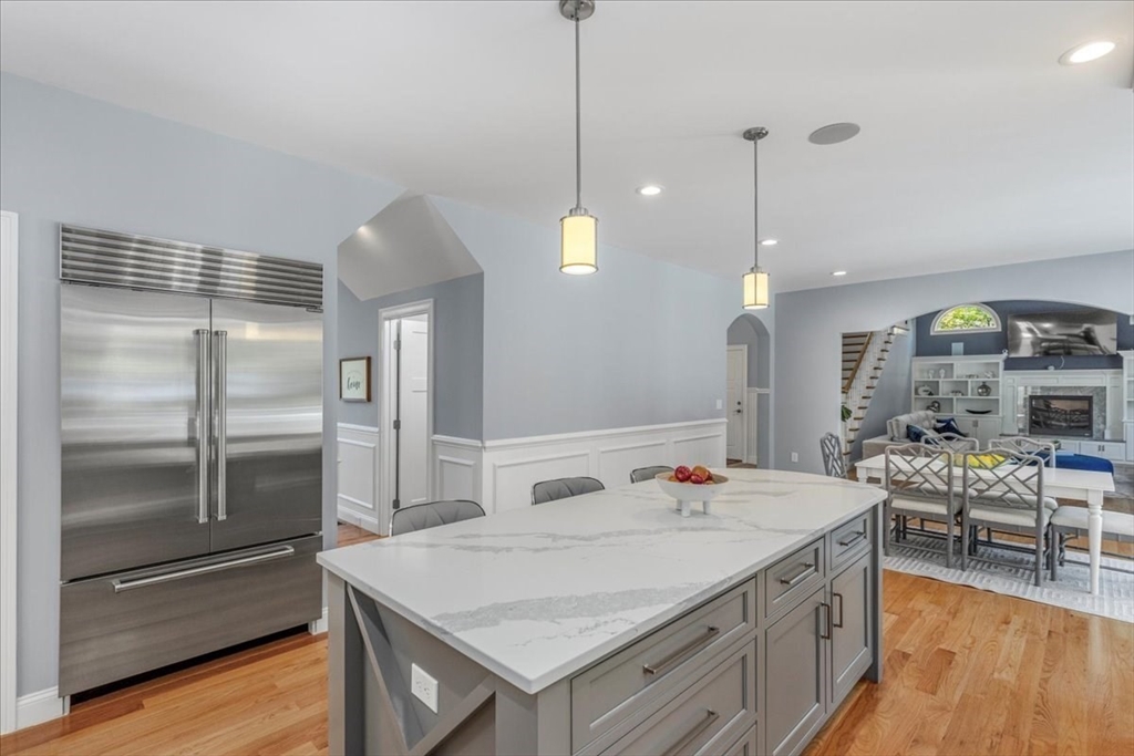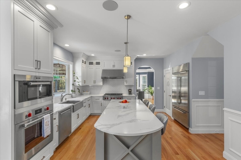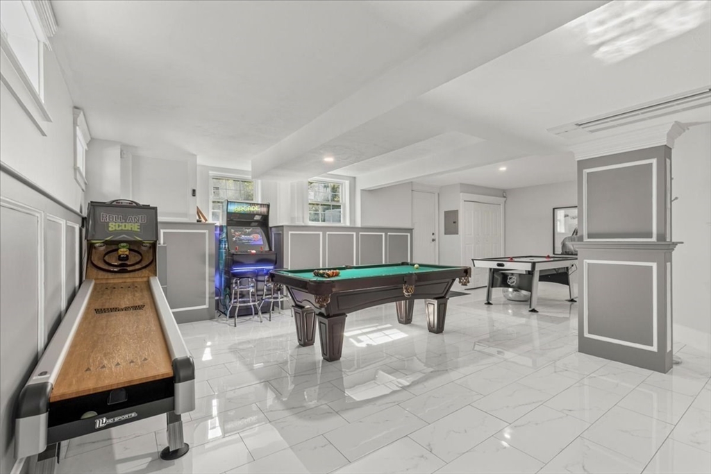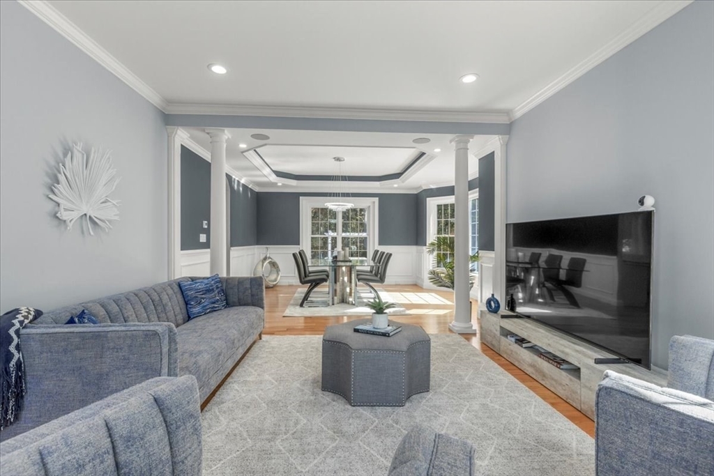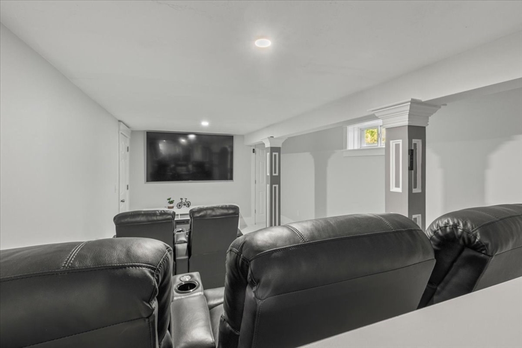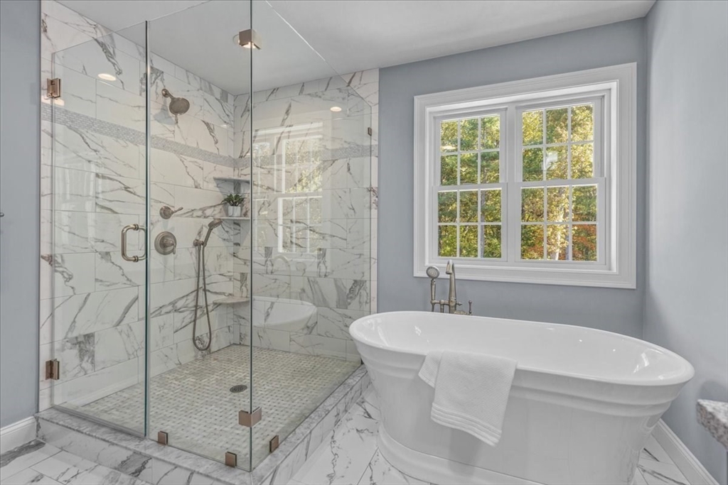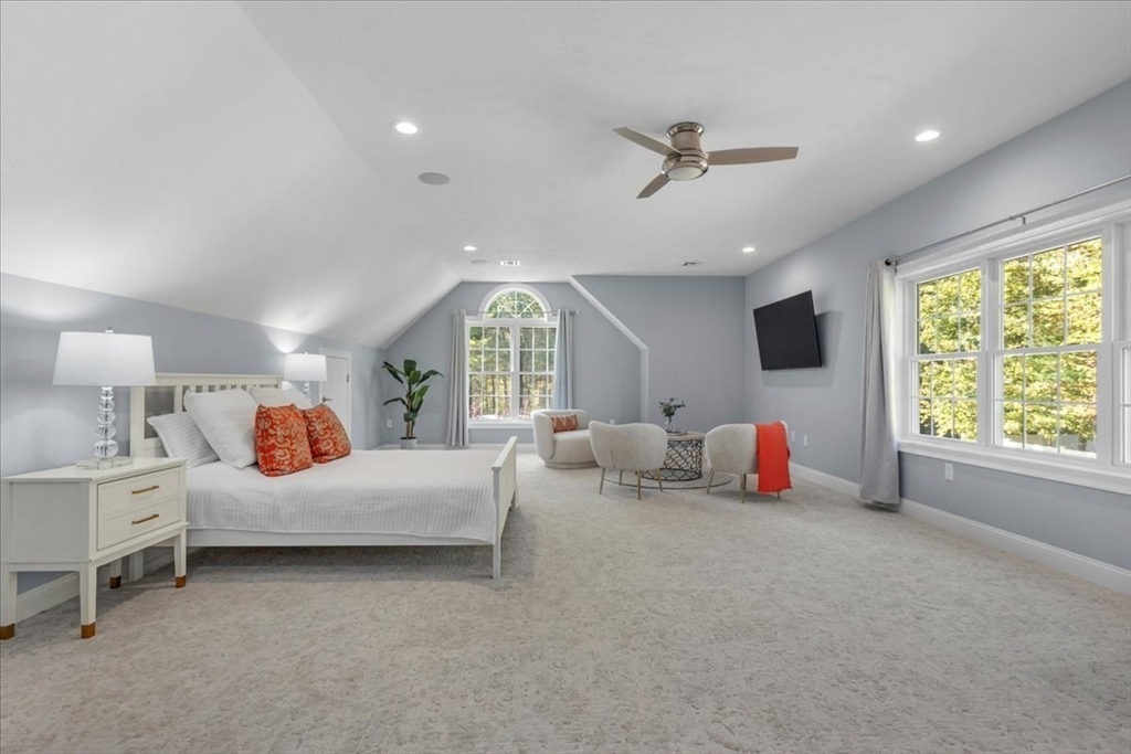 Welcome to 4 Lost Brook Trail in Walpole—an exceptional 5BR, 3BA Colonial built in 2020 on 2.94 private acres abutting conservation land. With 5800 sq ft, this home impresses with a soaring foyer, custom millwork, and abundant light. The gourmet kitchen offers a large 8 1/2 foot island, high-end Wolf appliances, 42" Sub-Zero fridge, walk-in pantry, and breakfast nook opening to a step-down cathedral family room with fireplace. Formal dining with bay window and an elegant living room provide ideal entertaining. The primary suite boasts a tray ceiling, spa bath with soaking tub, glass shower, dual vanities, and walk-in closet. Three additional bedrooms plus a bonus room add flexibility. The finished basement with bar and movie theatre elevates recreation. Outdoors, enjoy an expansive 50'x56' patio with built-in hot tub, firepit, and pergola. Nestled in North Walpole’s premier enclave near schools, parks, shopping, and major routes, this rare offering is complete with a three-car garage.