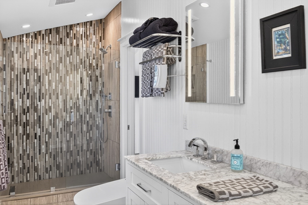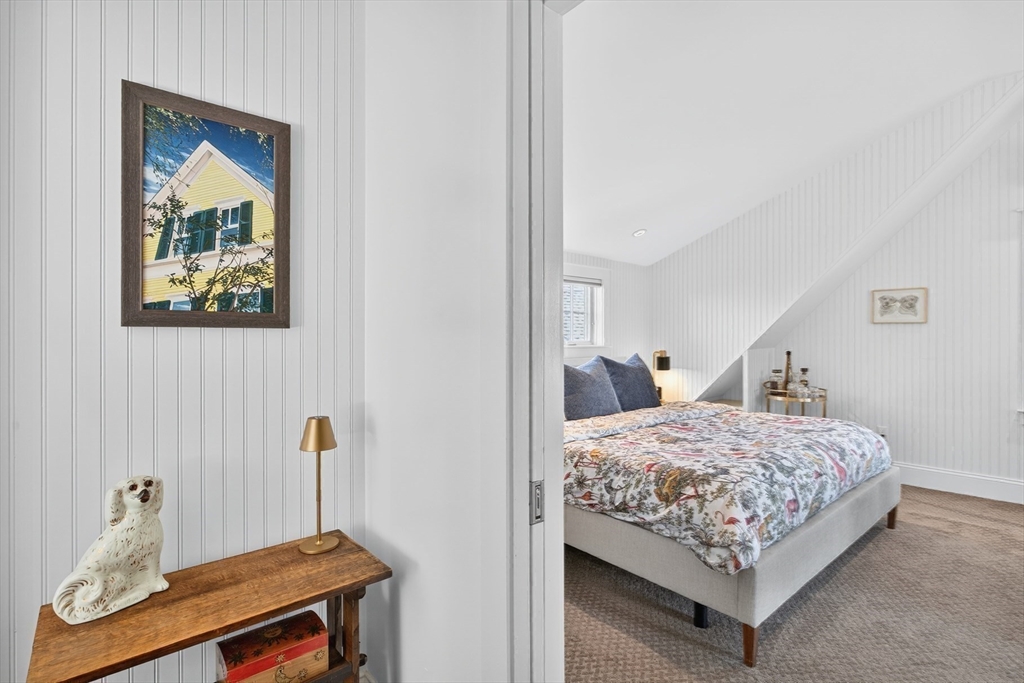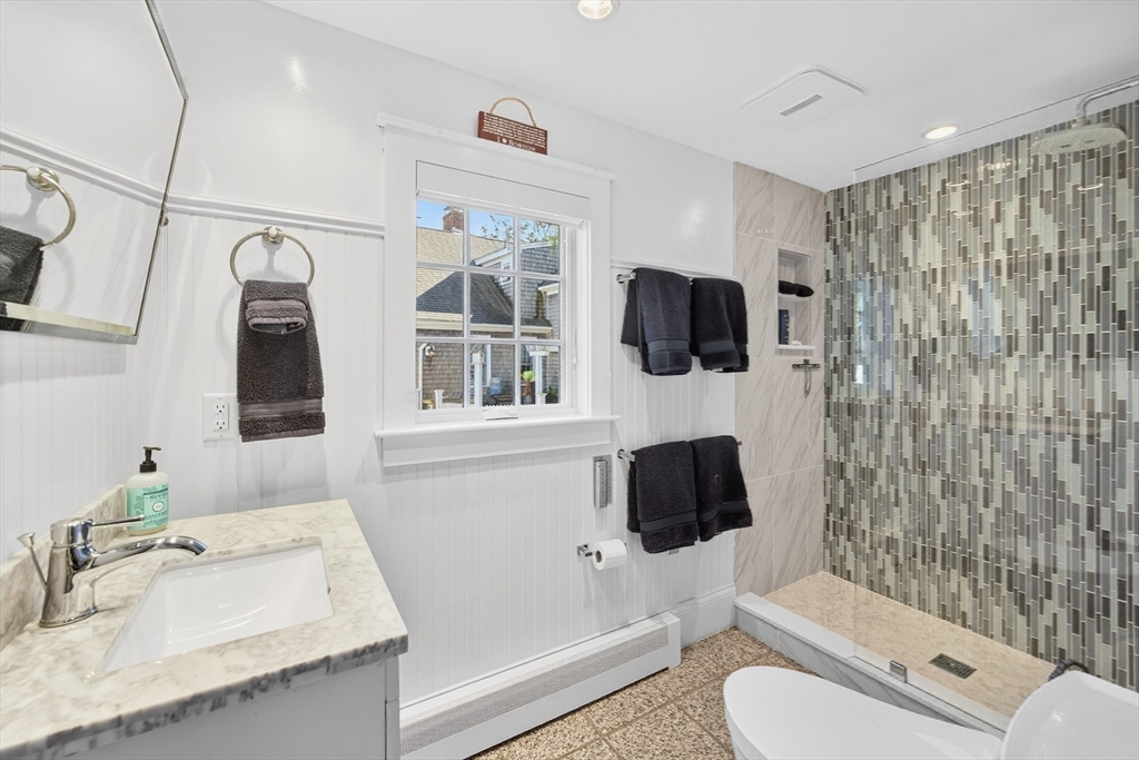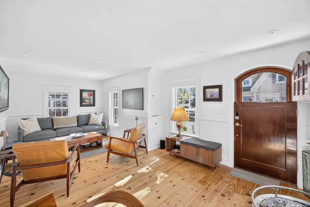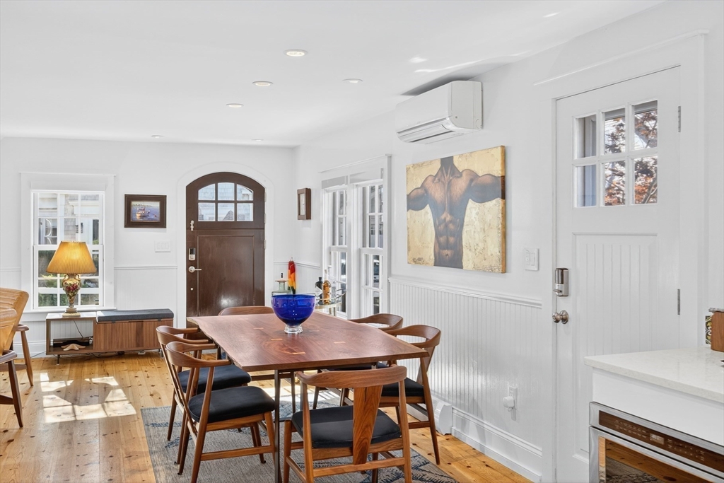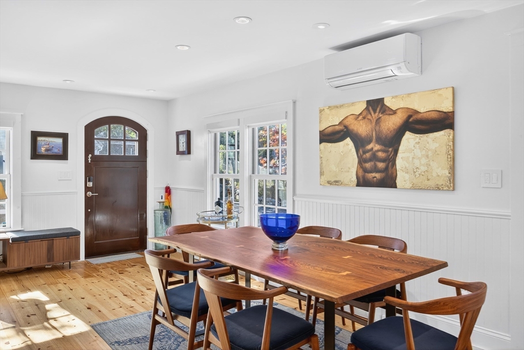 Rare opportunity to own the house where the dancing policeman lived! Iconic single family in the heart of Provincetown and recognized by its arched Dutch door. This home is tucked away on idyllic Atlantic Ave in the desirable West End. The first floor is open concept with beautiful pine floors and plenty of windows to let in natural light. The spacious living and dining area is a great space for entertaining. The kitchen has high gloss custom cabinetry, quartz countertops and stainless appliances. Completing the 1st floor is a cozy bedroom that fits a queen size bed with an adjacent full bath with a marble topped vanity, a large tiled shower and Toto toilet. Upstairs is the oversized primary bedroom suite with 2 closets and a sitting area. There are views of surrounding gardens and Pilgrim Monument from this bedroom. There is an additional bedroom on this floor plus a large bathroom with a double sink vanity, Toto toilet and a beautifully tiled shower. Full basement with laundry.
