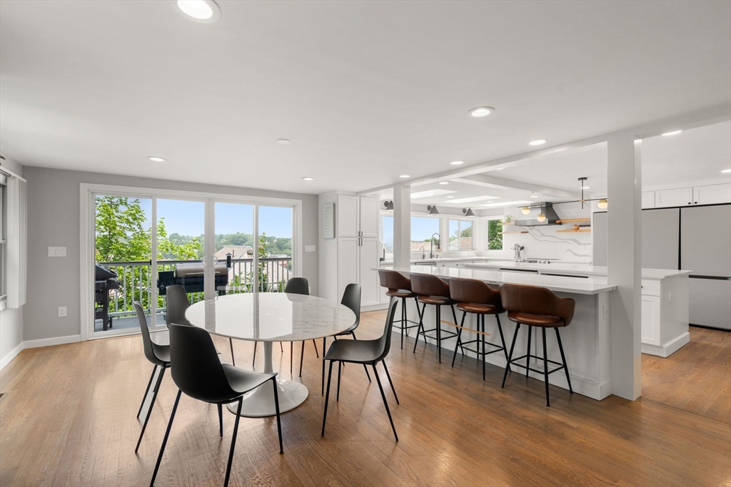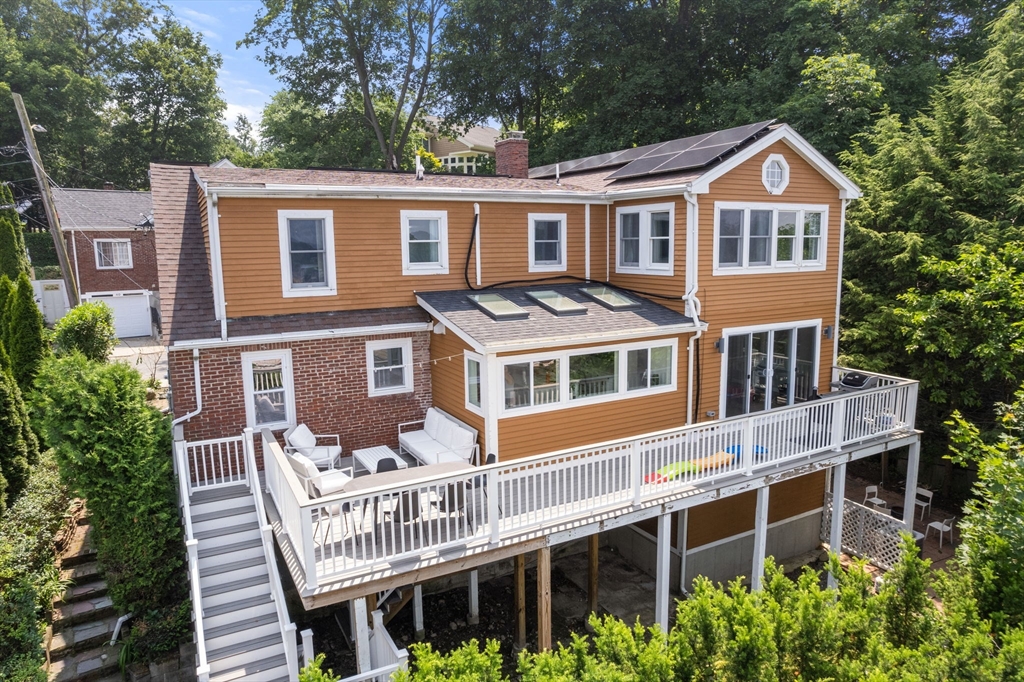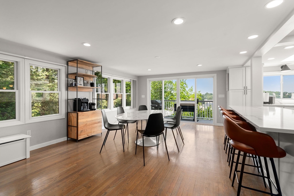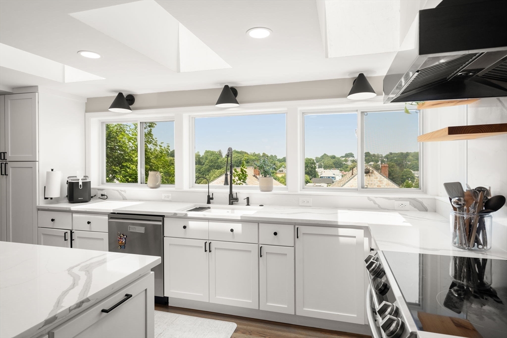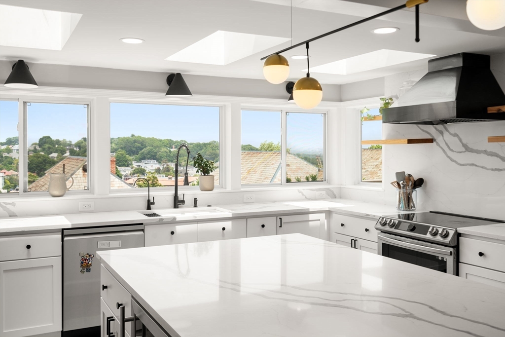 Beautifully updated 5-bed, 3-bath home with stunning panoramic views — the last house on a dead-end street! Immediately feel the spaciousness of the open-concept layout, seamlessly connecting the living room, dining, and show-stopping kitchen. The kitchen is a true centerpiece, featuring quartz countertops, generous center island, and sleek breakfast bar - ideal for entertaining. The dining room opens to a raised deck through double sliding glass doors, where sweeping views take center stage. The first floor includes two bedrooms and a full bath. Upstairs offers a massive primary suite with a full bath and private sunroom retreat. Two spacious bedrooms and another full bath complete the upper level. A large finished basement provides flexible space with access to a patio and a large storage area. Located right on the Boston/Newton line in Oak Square with access to BC, Brighton Center, golf, Boston Landing, Charles River, and the Mass Pike within 1-2 miles.