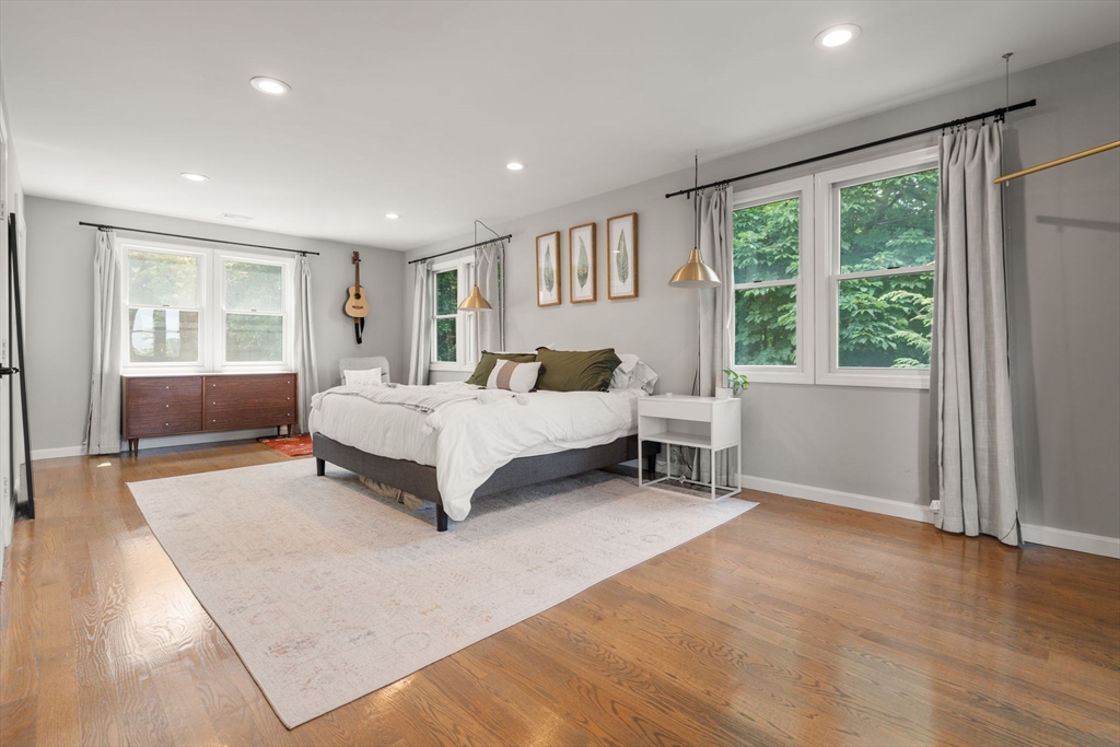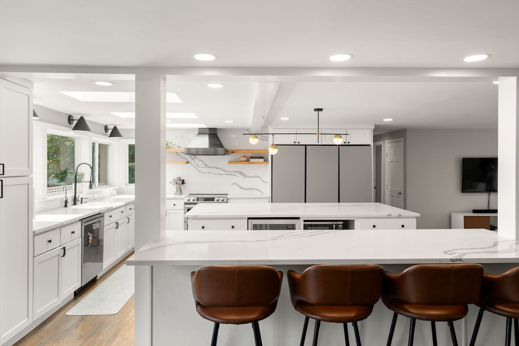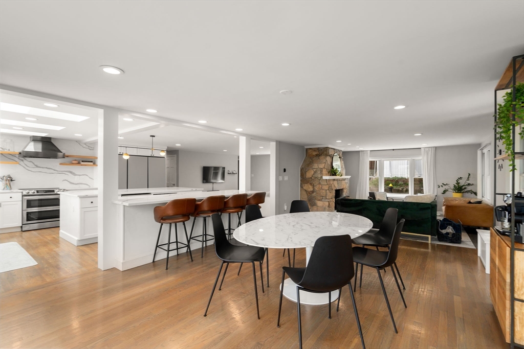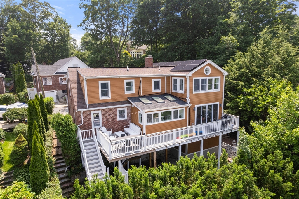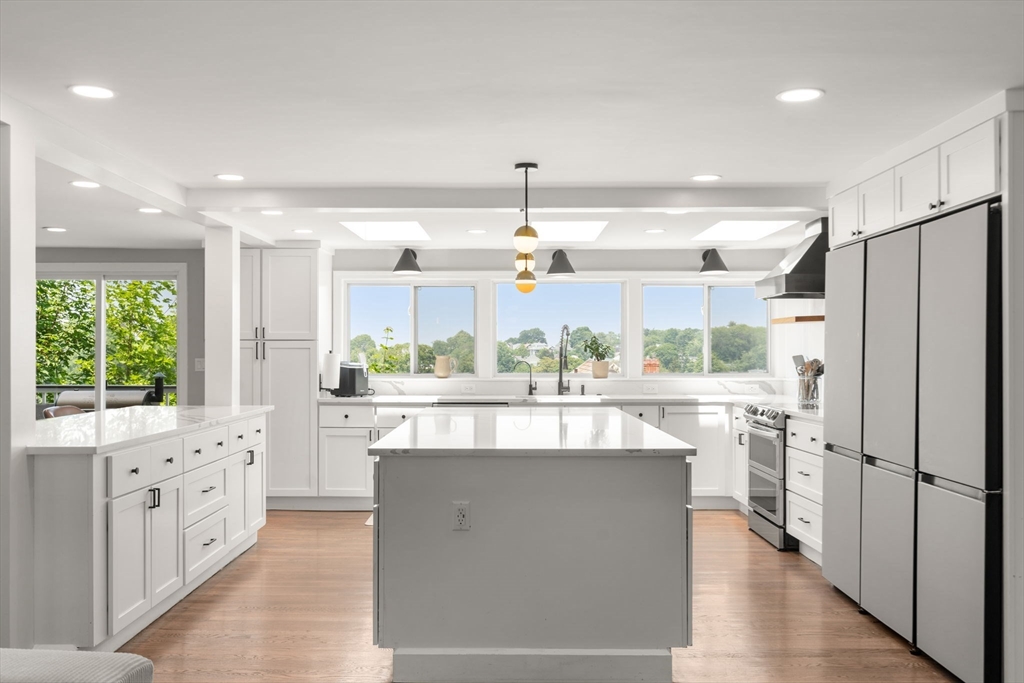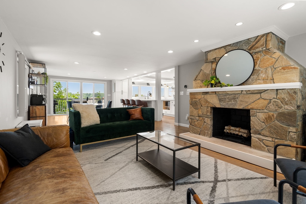 Beautifully updated 5-bed, 3-bath home with stunning panoramic views — the last house on a dead-end street! Immediately feel the spaciousness of the open-concept layout, seamlessly connecting the living room, dining, and show-stopping kitchen. The kitchen is a true centerpiece, featuring quartz countertops, generous center island, and sleek breakfast bar - ideal for entertaining. The dining room opens to a raised deck through double sliding glass doors, where sweeping views take center stage. The first floor includes two bedrooms and a full bath. Upstairs offers a massive primary suite with a full bath and private sunroom retreat. Two spacious bedrooms and another full bath complete the upper level. A large finished basement provides flexible space with access to a patio and a large storage area. Located right on the Boston/Newton line in Oak Square with access to BC, Brighton Center, golf, Boston Landing, Charles River, and the Mass Pike within 1-2 miles.