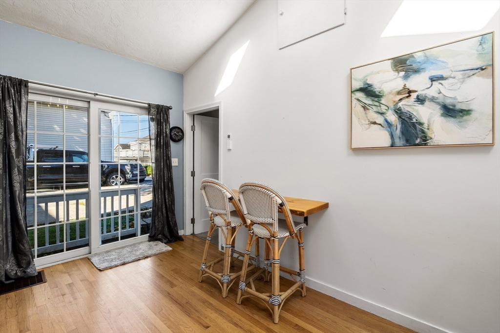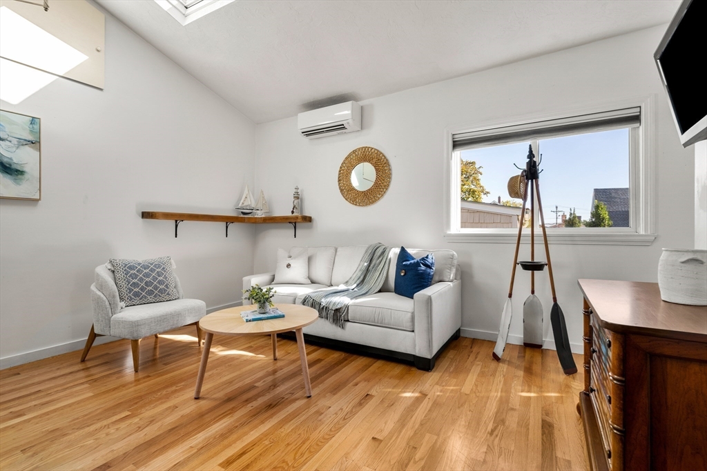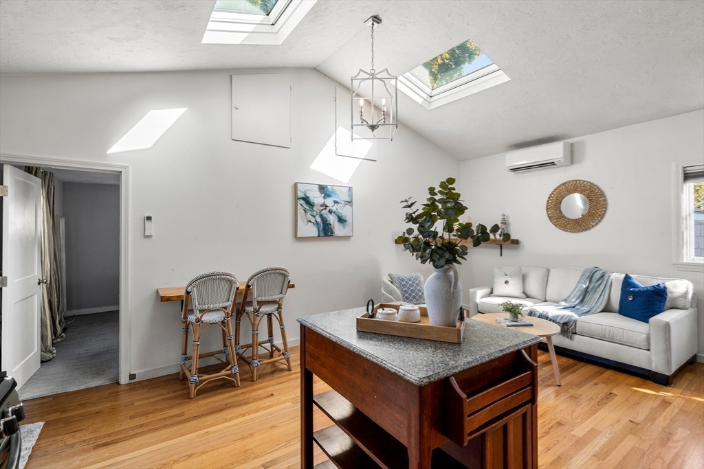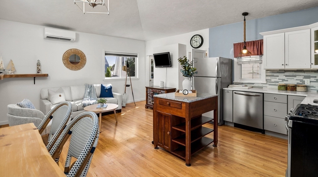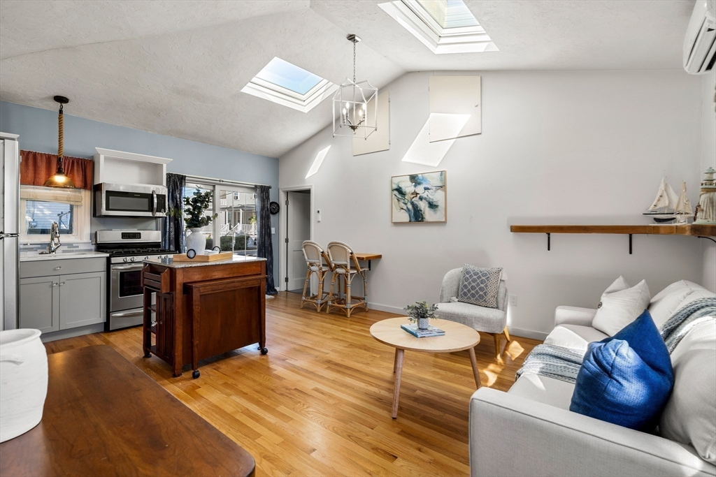 Nahant Bungalow Cottage — This charming seaside retreat offers the perfect space for the first time buyer. The freedom of a single-family home and the price point of a condo. Enjoy your own private fenced patio and yard, ideal for relaxing or entertaining. Inside, the open-concept, single-level layout ensures easy and comfortable everyday living. The updated kitchen boasts quartz countertops, stainless steel appliances, hardwood floors, and a soaring cathedral ceiling. A newer mini-split system provides year-round comfort, while the renovated bathroom features a spa-style shower for a touch of luxury to your daily routine. Newer roof and skylights. Just outside, private off-street parking adds convenience. Breathe in the fresh salt air, listen to the waves, and embrace the simple pleasures of coastal living in this inviting Nahant bungalow.