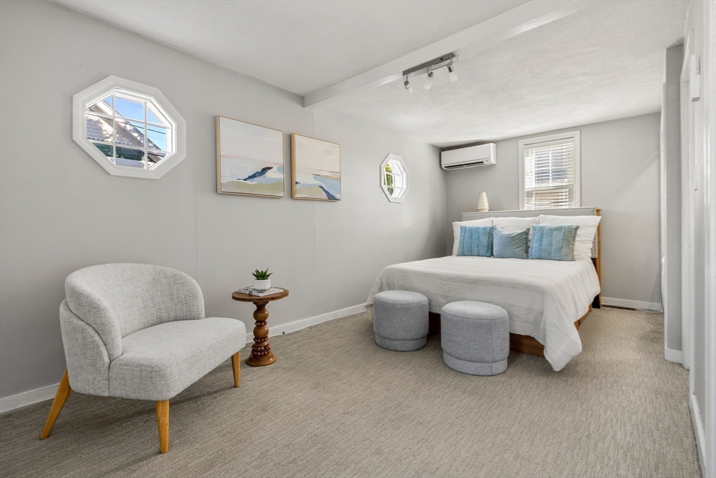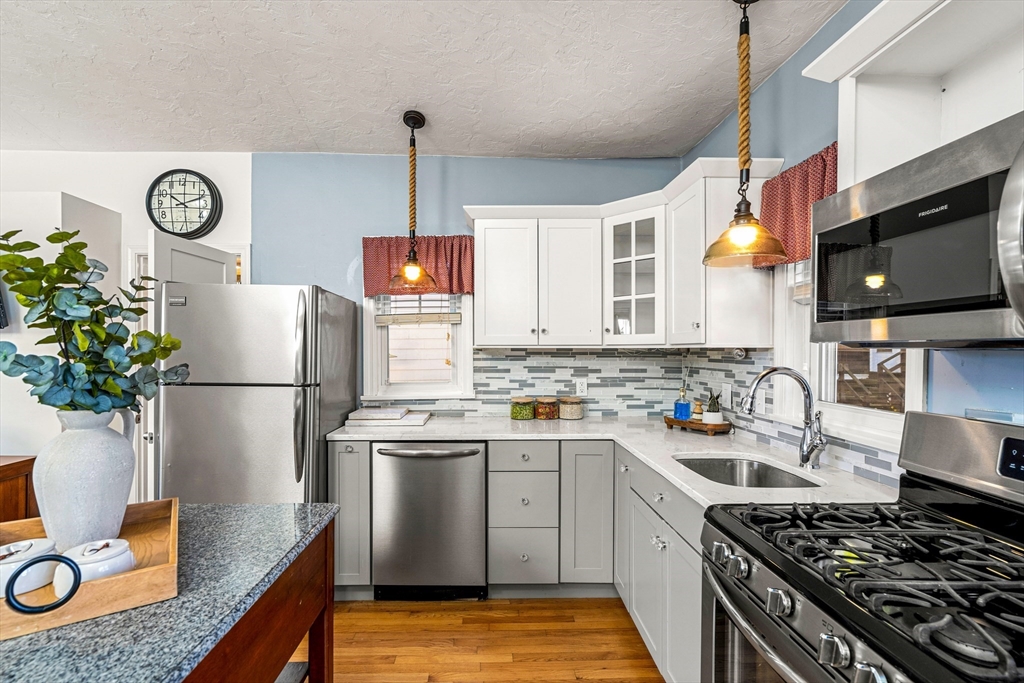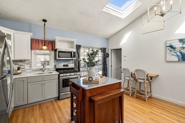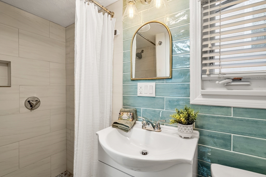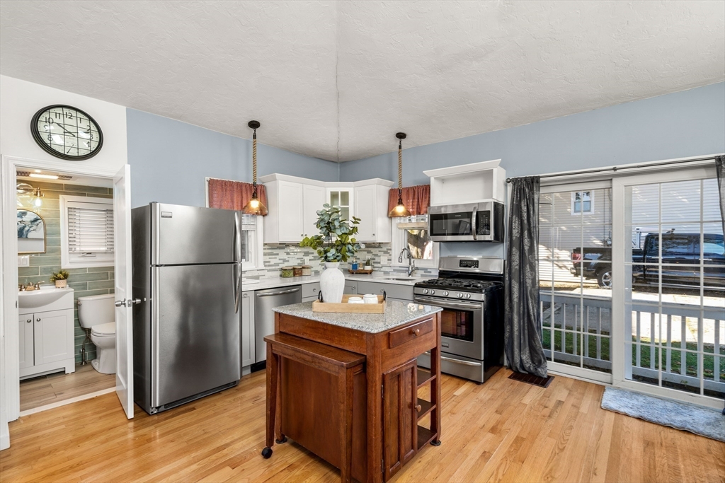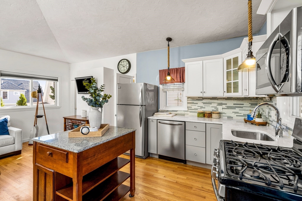 Nahant Bungalow Cottage — This charming seaside retreat offers the perfect space for the first time buyer. The freedom of a single-family home and the price point of a condo. Enjoy your own private fenced patio and yard, ideal for relaxing or entertaining. Inside, the open-concept, single-level layout ensures easy and comfortable everyday living. The updated kitchen boasts quartz countertops, stainless steel appliances, hardwood floors, and a soaring cathedral ceiling. A newer mini-split system provides year-round comfort, while the renovated bathroom features a spa-style shower for a touch of luxury to your daily routine. Newer roof and skylights. Just outside, private off-street parking adds convenience. Breathe in the fresh salt air, listen to the waves, and embrace the simple pleasures of coastal living in this inviting Nahant bungalow.