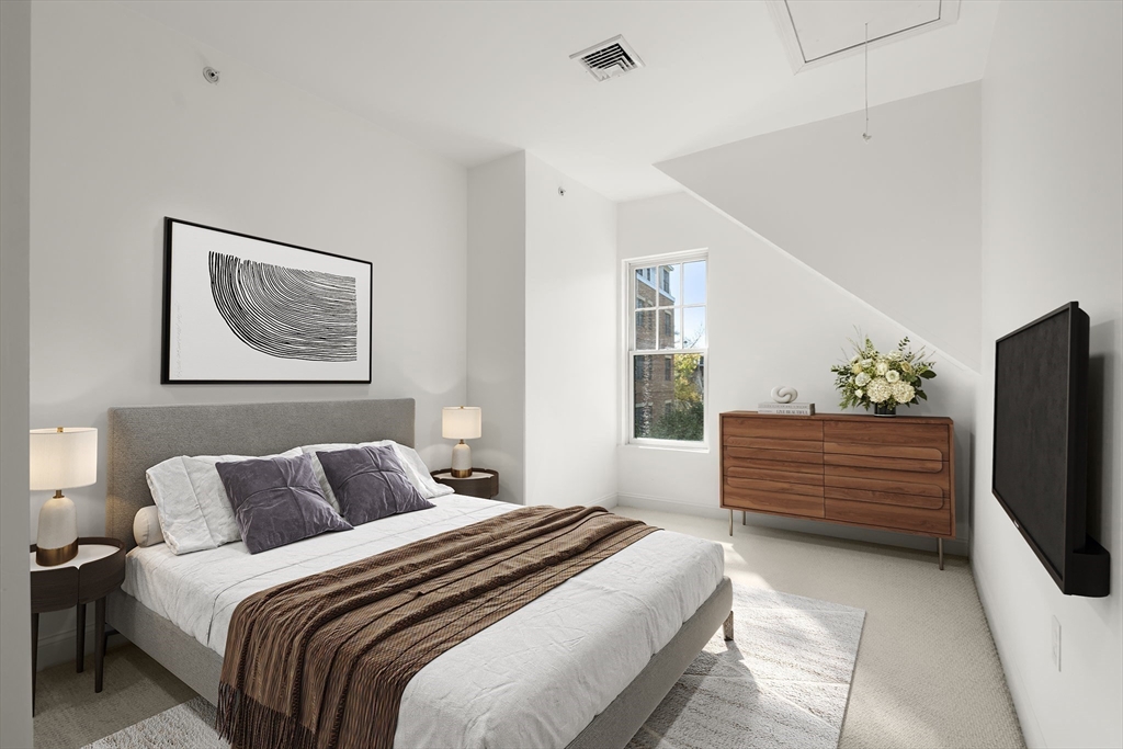 Single-family alternative. Lives like a single. Rarely available. Two-level townhouse on a tree-lined one-way street with a 2-car garage. A gracious and spacious home that has soaring high ceilings, with an abundance of large, insulated windows. This sun-filled home has light streaming in throughout. There is a large open living dining with tree-top views. The sunny, large eat-in kitchen has lots of additional wall cabinets for great storage, granite counters, and stainless steel appliances. The 2nd level has a large master suite with a master bath,2 additional bedrooms, and a large main bath. Great closet space throughout. Minutes to T, school, park, public library, shopping, restaurants, and Longwood Medical. Easy access to downtown Boston.