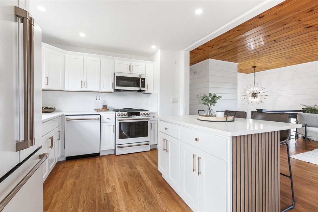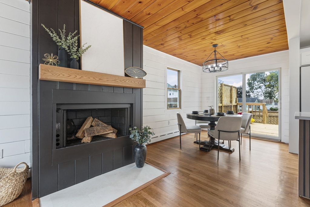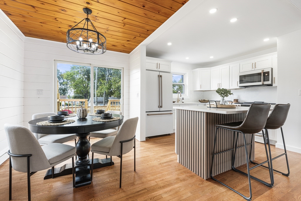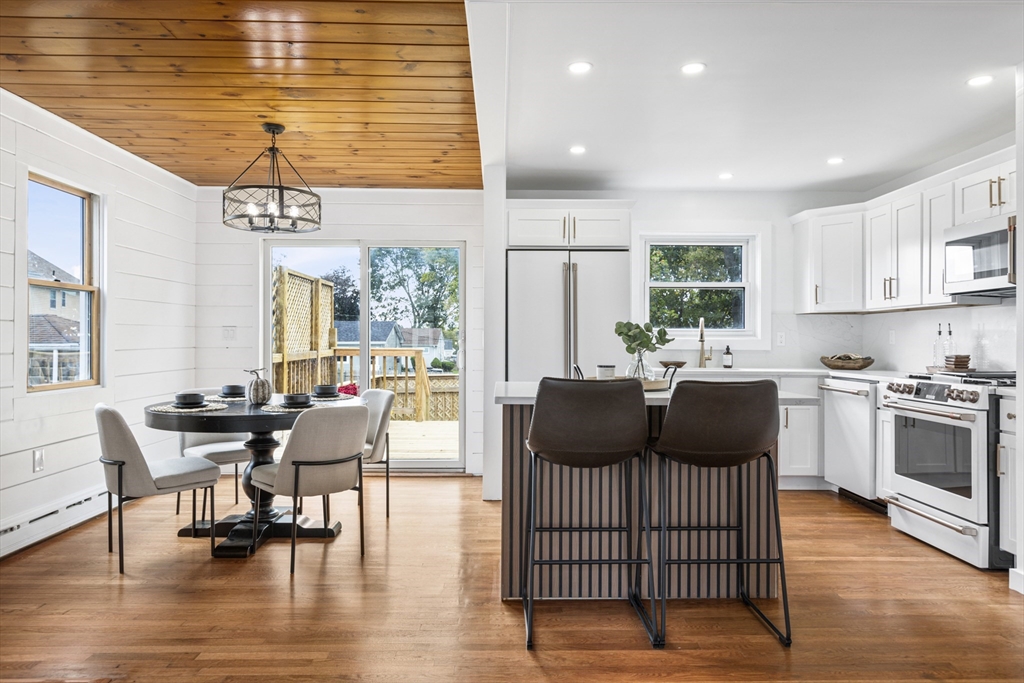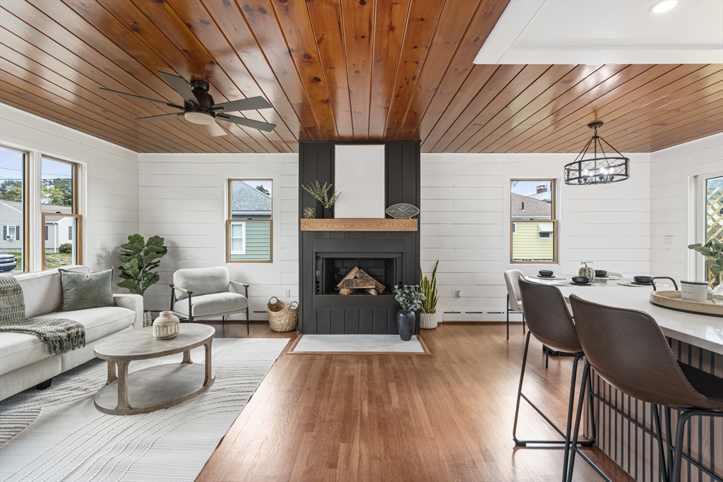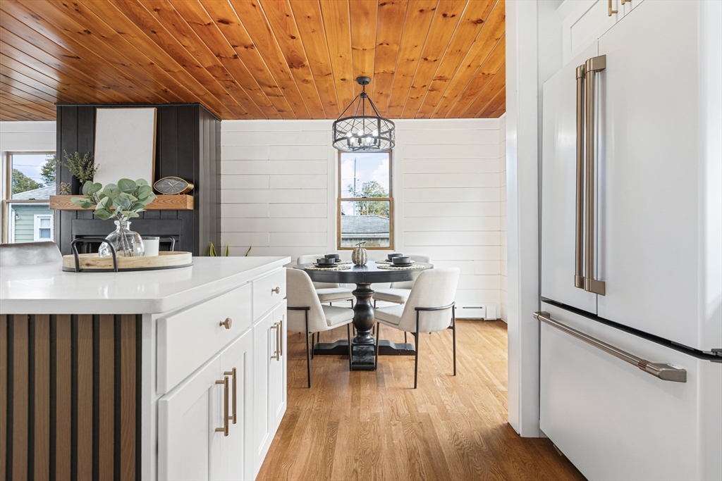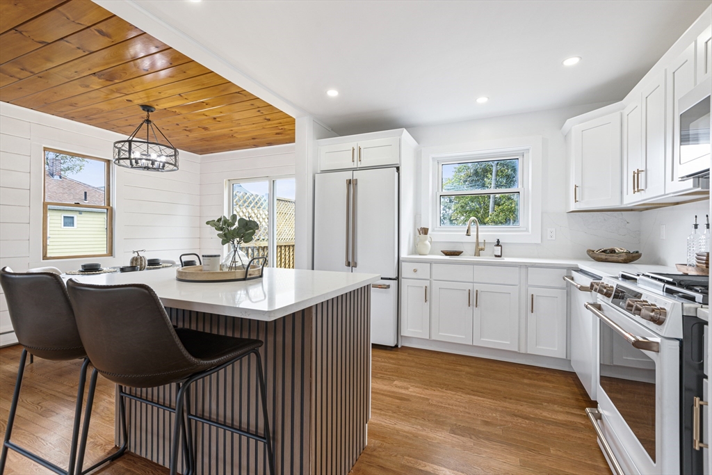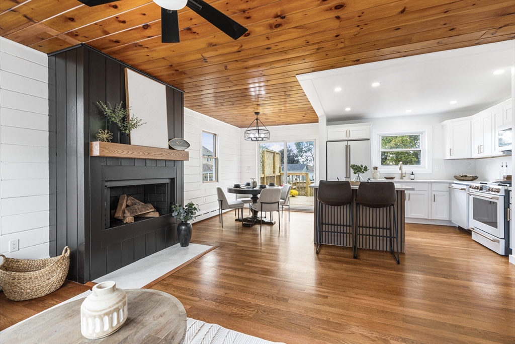 Modern comfort meets timeless style in this beautifully refreshed New Bedford Raised Ranch. Open-concept living where natural light pours across refinished hardwood floors. The living room’s fireplace sets a cozy tone that flows into the dining area and a kitchen designed to impress. Granite counters and backsplash, an island, and sleek Café appliances for that “wow” factor. Sliders lead to a spacious deck overlooking a fenced yard with shed, perfect for gatherings, morning coffee & night caps. The main level also features 3 Bedrooms and a Full Bath. Downstairs offers updated flooring, a second Full Bath, laundry hookup, and a walkout. The space is ideal for a media room, home gym, or in-law setup. Freshly painted throughout with a neutral palette, thoughtful updates, and statement lighting add just the right touch of modern edge. Conveniently located near schools, shopping, and highway access.