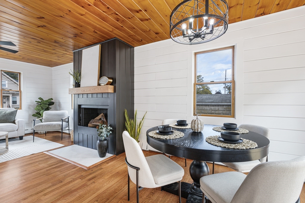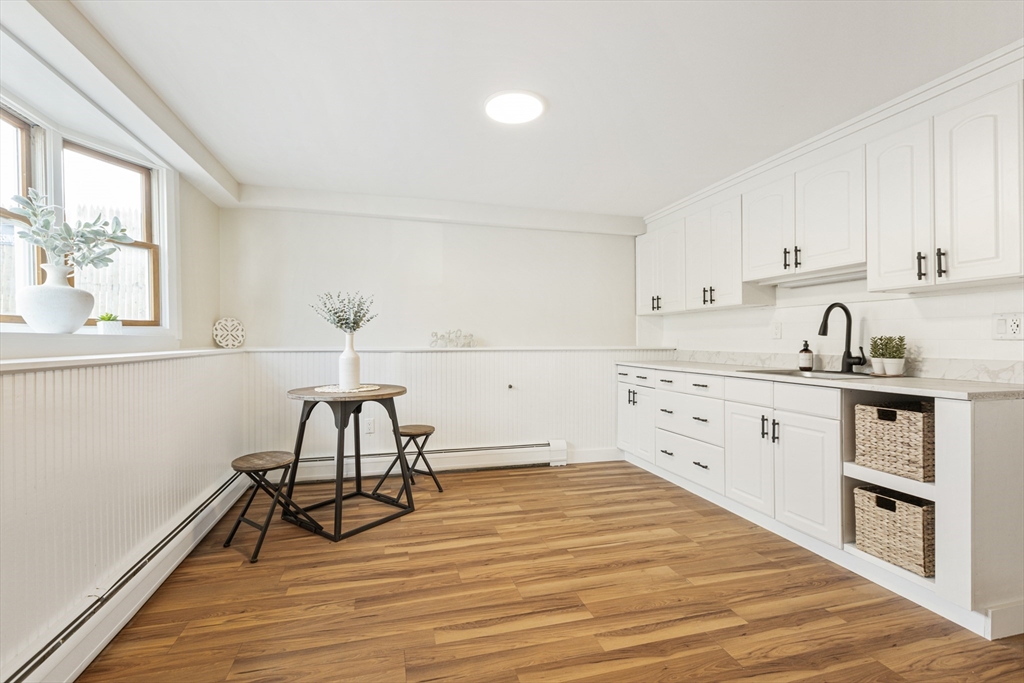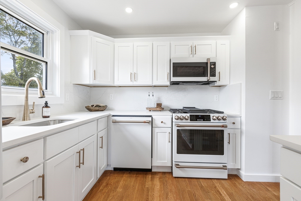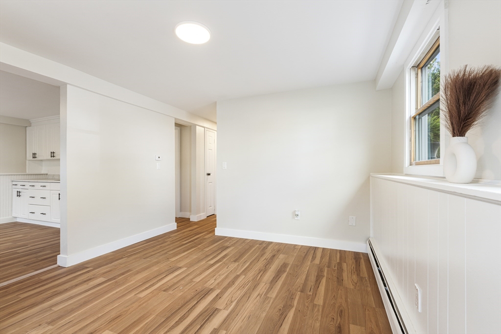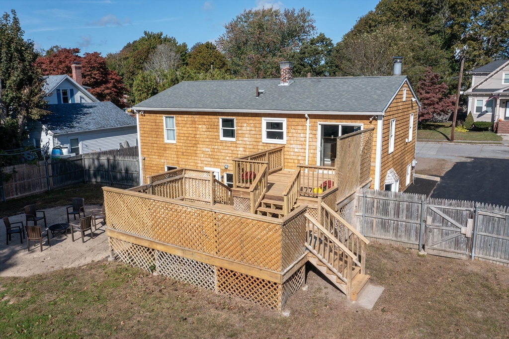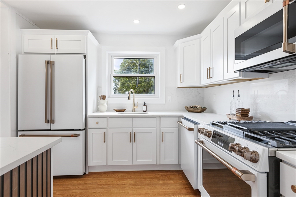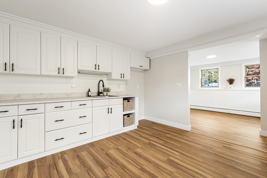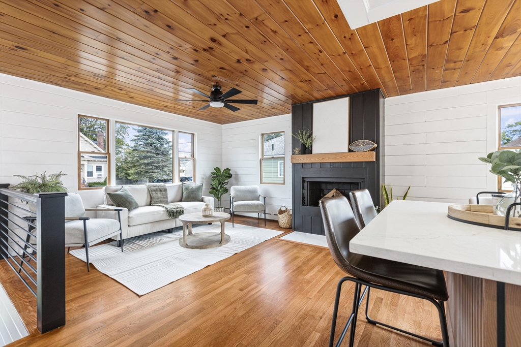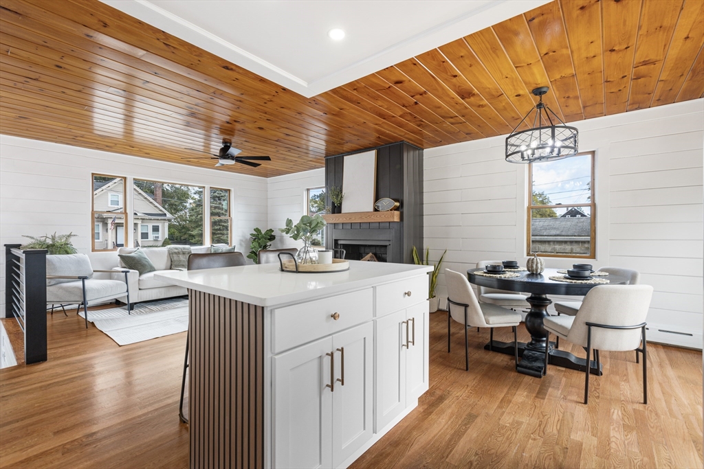 Modern comfort meets timeless style in this beautifully refreshed New Bedford Raised Ranch. Open-concept living where natural light pours across refinished hardwood floors. The living room’s fireplace sets a cozy tone that flows into the dining area and a kitchen designed to impress. Granite counters and backsplash, an island, and sleek Café appliances for that “wow” factor. Sliders lead to a spacious deck overlooking a fenced yard with shed, perfect for gatherings, morning coffee & night caps. The main level also features 3 Bedrooms and a Full Bath. Downstairs offers updated flooring, a second Full Bath, laundry hookup, and a walkout. The space is ideal for a media room, home gym, or in-law setup. Freshly painted throughout with a neutral palette, thoughtful updates, and statement lighting add just the right touch of modern edge. Conveniently located near schools, shopping, and highway access.