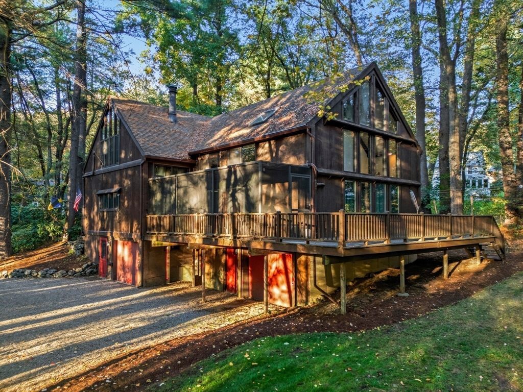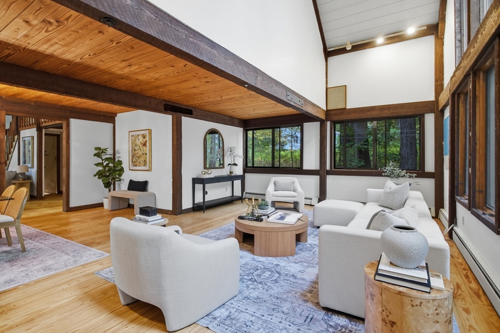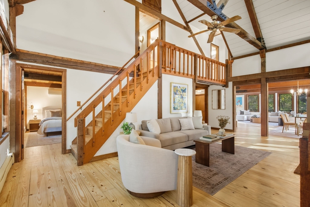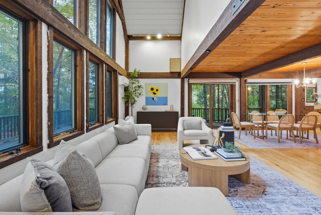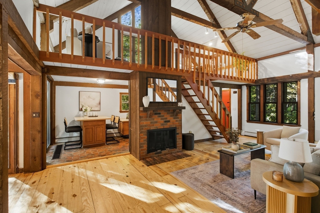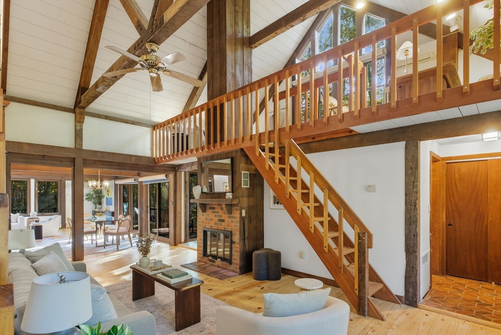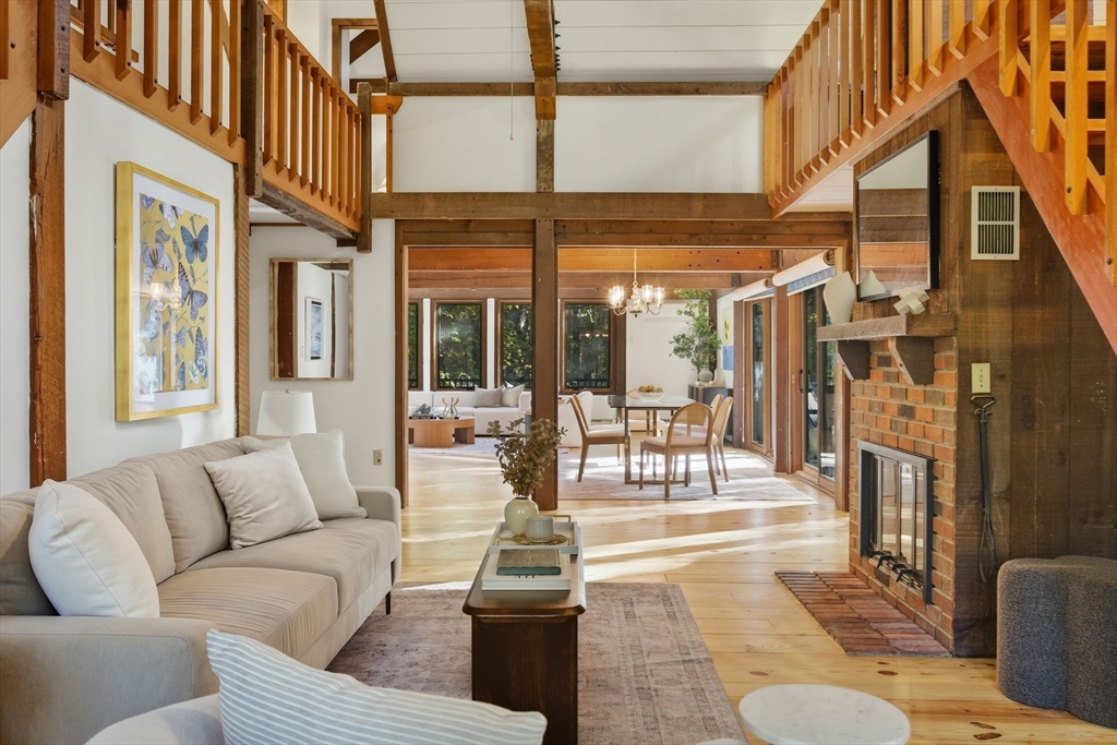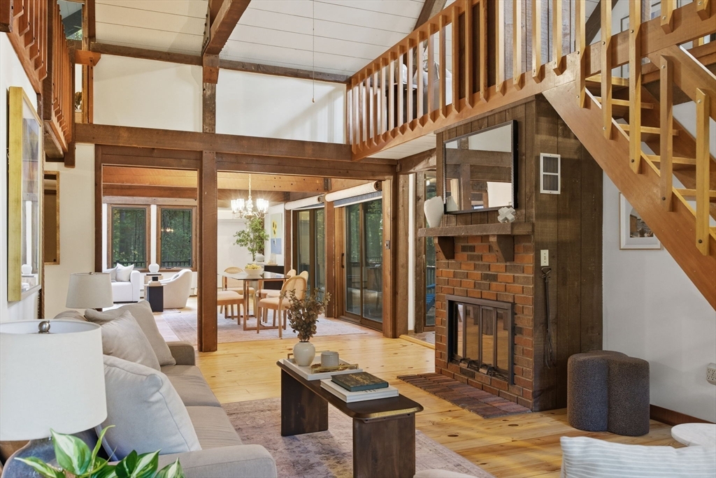 Truly a spectacular home in an incredible neighborhood at the end of a quiet dead-end street, surrounded by conservation land. This custom Yankee Barn Home showcases the timeless quality and craftsmanship the brand is known for; post and beam construction with the finest materials for durability, weather protection, and energy efficiency. Inside, soaring cathedral ceilings highlight the stunning living room with fireplace and dramatic loft above. The dining room opens to a screened porch and an expansive deck running the length of the home. A bright family room with a wall of windows overlooks the serene setting. The first-floor primary suite offers convenience and privacy, while there are four additional bedrooms upstairs, each feature charming nooks/lofts. Freshly painted throughout with refinished floors, newer heating system, and efficient mini splits providing air conditioning to every room, plus a spacious 2+ car garage complete this special property!