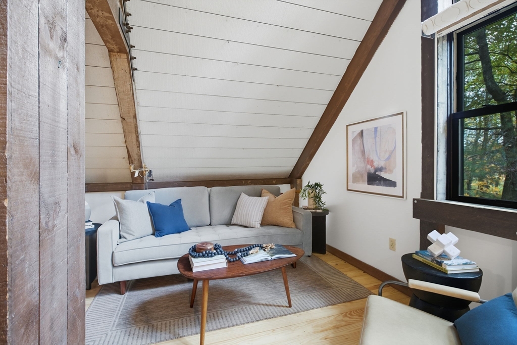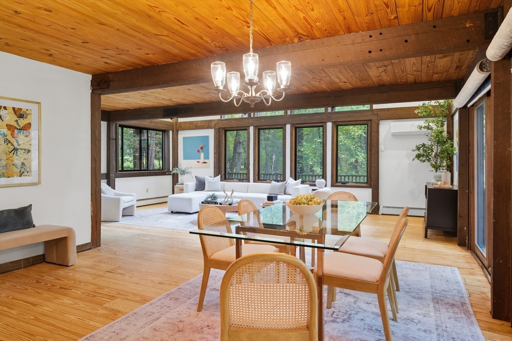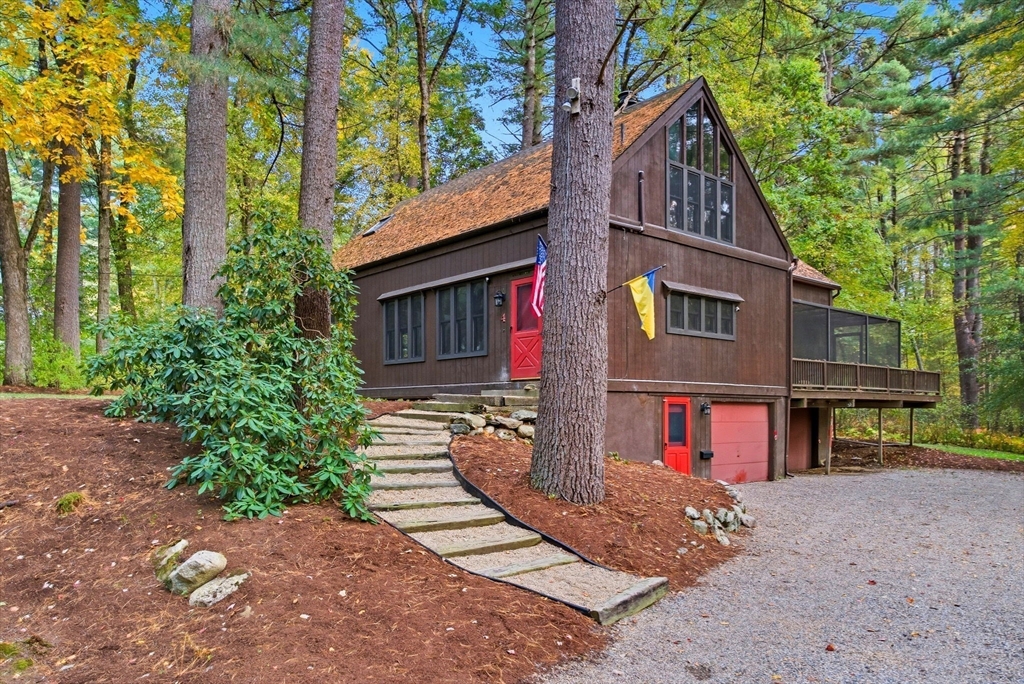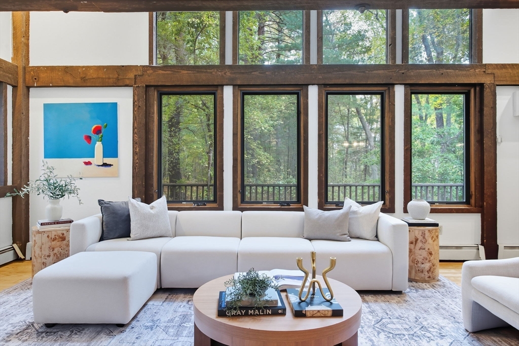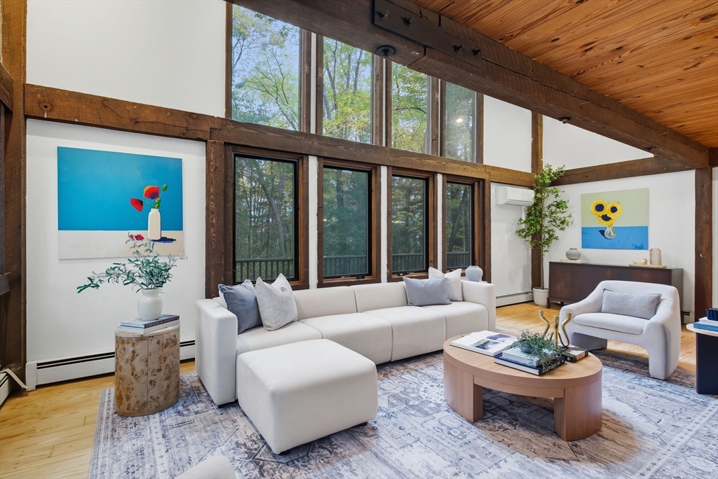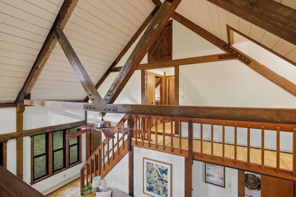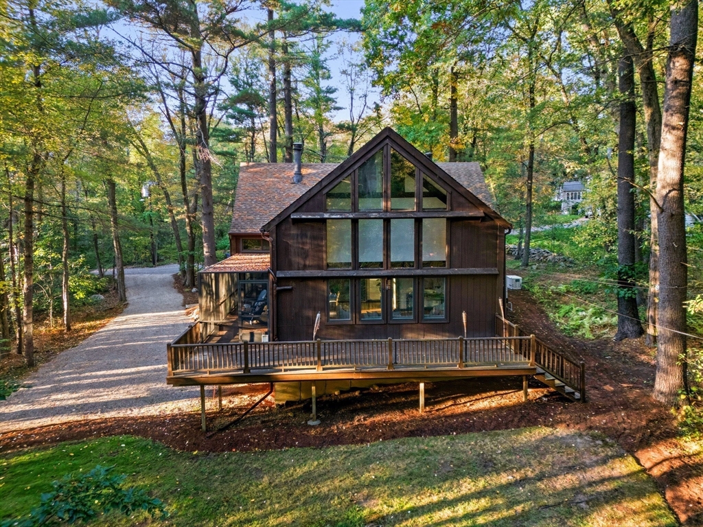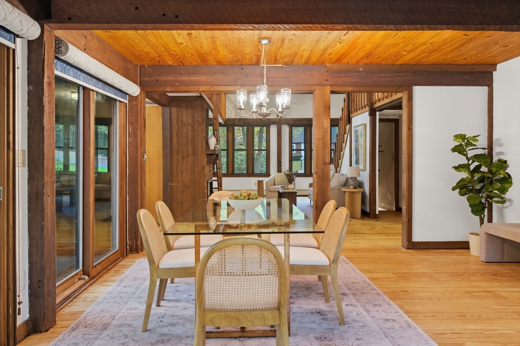 Truly a spectacular home in an incredible neighborhood at the end of a quiet dead-end street, surrounded by conservation land. This custom Yankee Barn Home showcases the timeless quality and craftsmanship the brand is known for; post and beam construction with the finest materials for durability, weather protection, and energy efficiency. Inside, soaring cathedral ceilings highlight the stunning living room with fireplace and dramatic loft above. The dining room opens to a screened porch and an expansive deck running the length of the home. A bright family room with a wall of windows overlooks the serene setting. The first-floor primary suite offers convenience and privacy, while there are four additional bedrooms upstairs, each feature charming nooks/lofts. Freshly painted throughout with refinished floors, newer heating system, and efficient mini splits providing air conditioning to every room, plus a spacious 2+ car garage complete this special property!