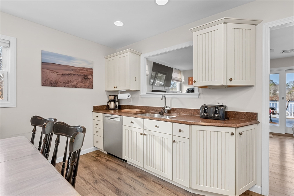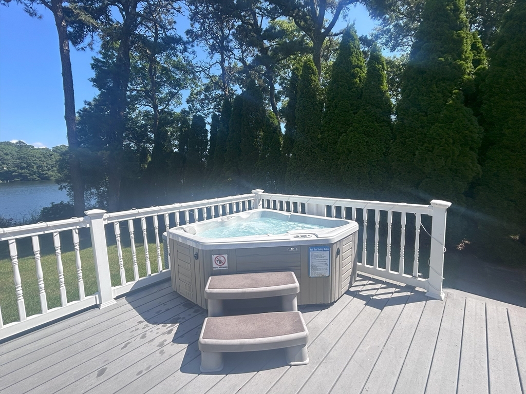 Located in Bourne, the Gateway to Cape Cod, this one-level home on Queen Sewell Pond offers beautiful water views & recreation. Queen Sewell Pond is an 18-acre freshwater pond, make memories swimming, kayaking & fishing from your personal dock or the sandy beach nearby. Enjoy a large flat grassy backyard and you'll be delighted with the fire pit area, bring the s'mores! The 35-foot deck offers plenty of room for outdoor living including a 2-person hot tub. Plenty of room for friends & family in this air-conditioned 4-bedroom house. Primary suite at the rear of the home offers privacy, its own bathroom and an office space(or could be converted to a walk in closet). The eat-in kitchen centers the home & leads to a living room w/ easy access to the deck and water views via sliding doors. The gas stove in the living room offers a cozy vibe. The bathroom is roomy with a separate shower and jacuzzi tub. A convenient utility room offers storage & stackable washer/dryer.