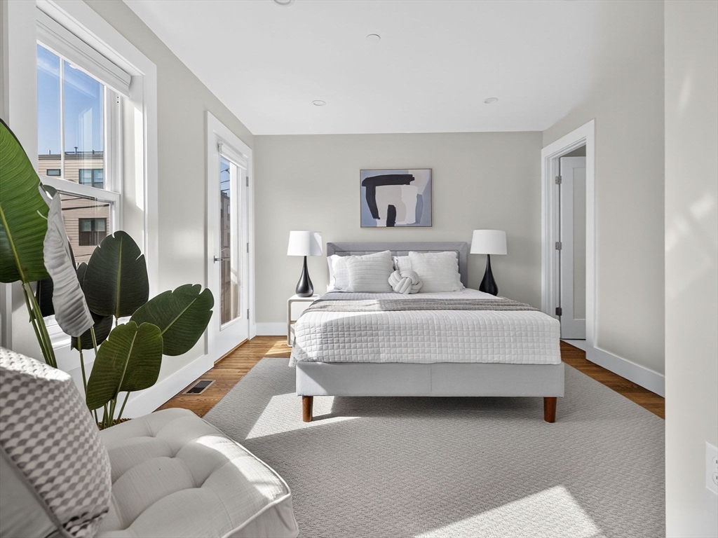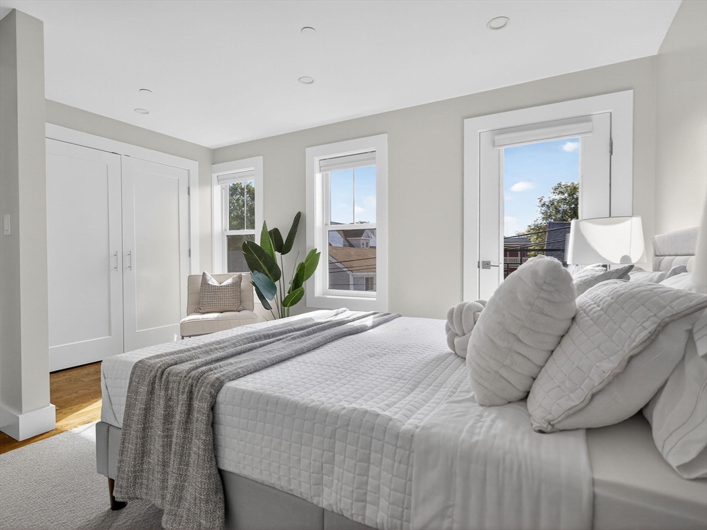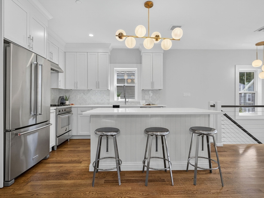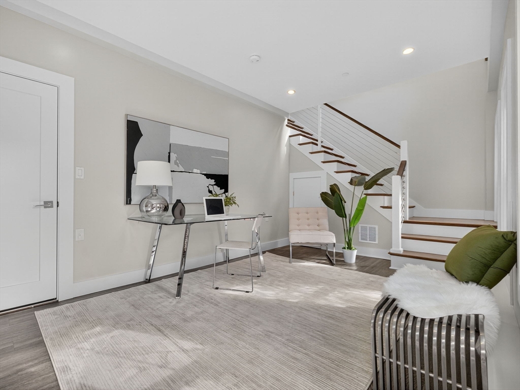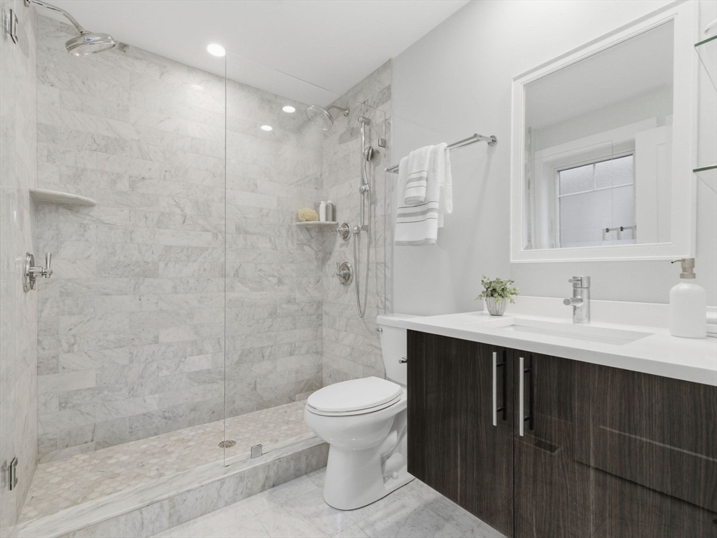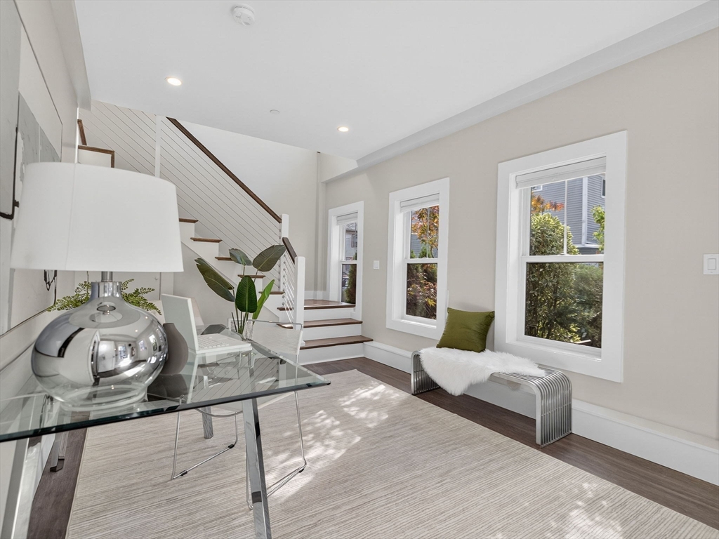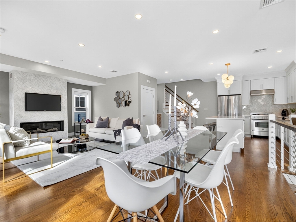 Perfect single-family alternative! Light pours into this stunning front-facing townhouse, where contemporary design meets effortless living. The open floor plan is anchored by a sleek gas fireplace with herringbone tile surround and framed by a wall of oversized windows that fill the space with natural light. A designer kitchen shines with West Elm lighting, marble backsplash, and a spacious island ideal for casual dining or entertaining. Upstairs, the serene primary suite features a spa-like bath with dual rain showers, while two additional bedrooms offer flexibility for guests or creative spaces. A private walk-up roof deck offers a sun-soaked retreat with treetop views, ideal for relaxing or gathering with friends. The versatile first-floor flex room—perfect as an office, gym, or mudroom—adds convenience and function. With garage parking, Elfa closet systems, an EV charger, and a location near JP’s vibrant shops, green spaces, and Orange Line T, this home is a must see!
