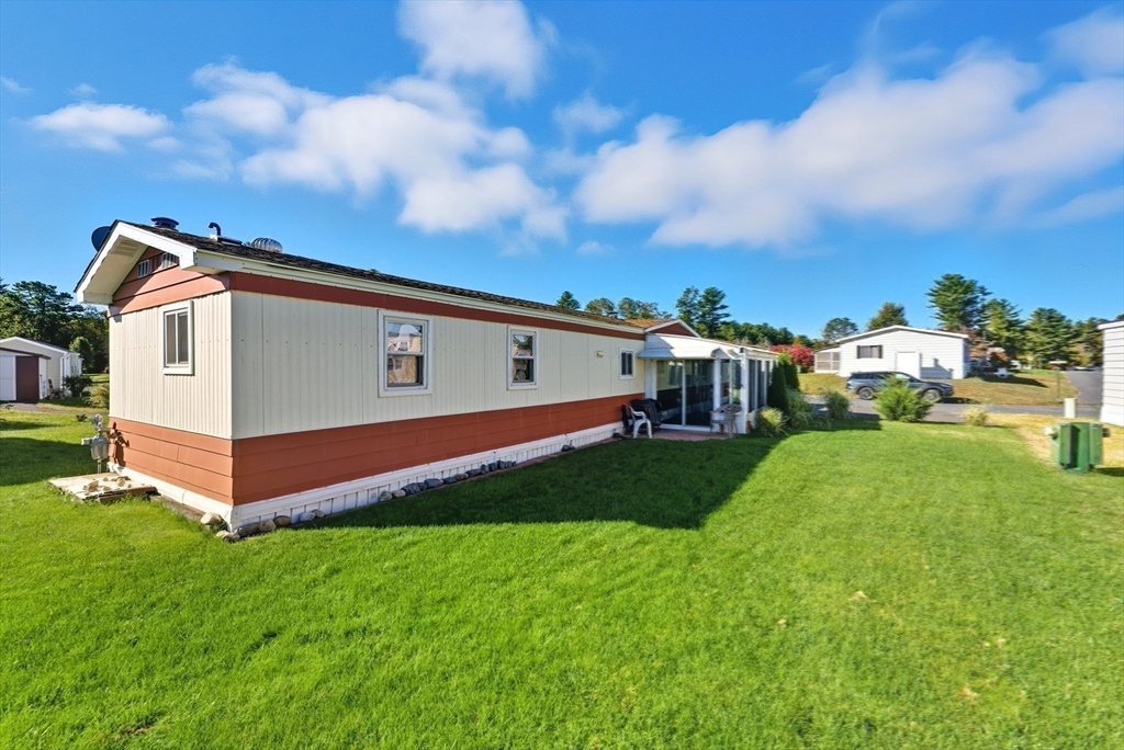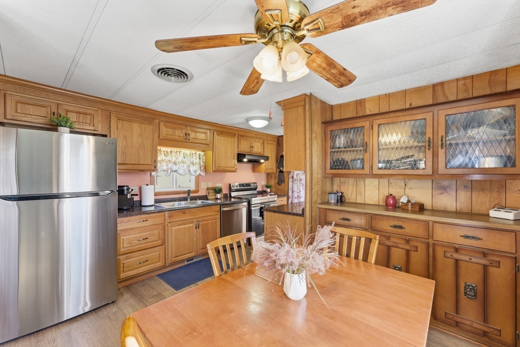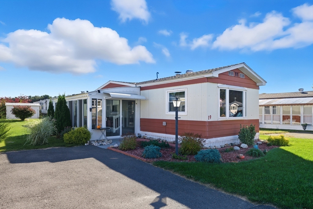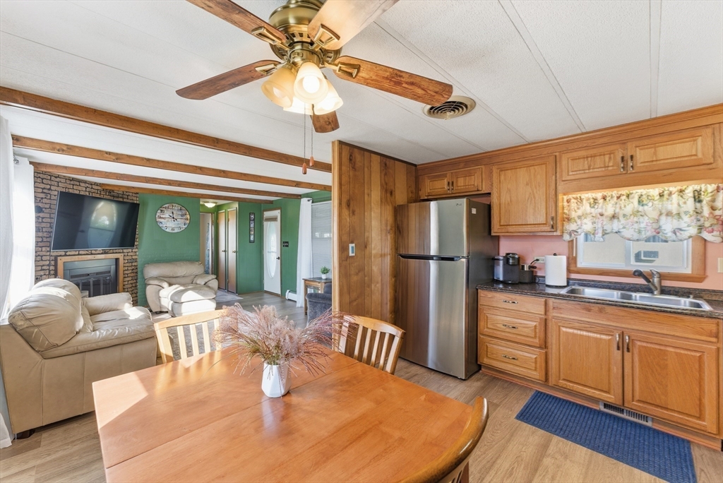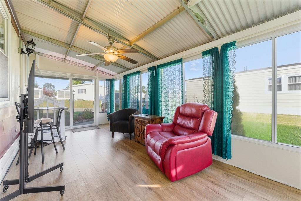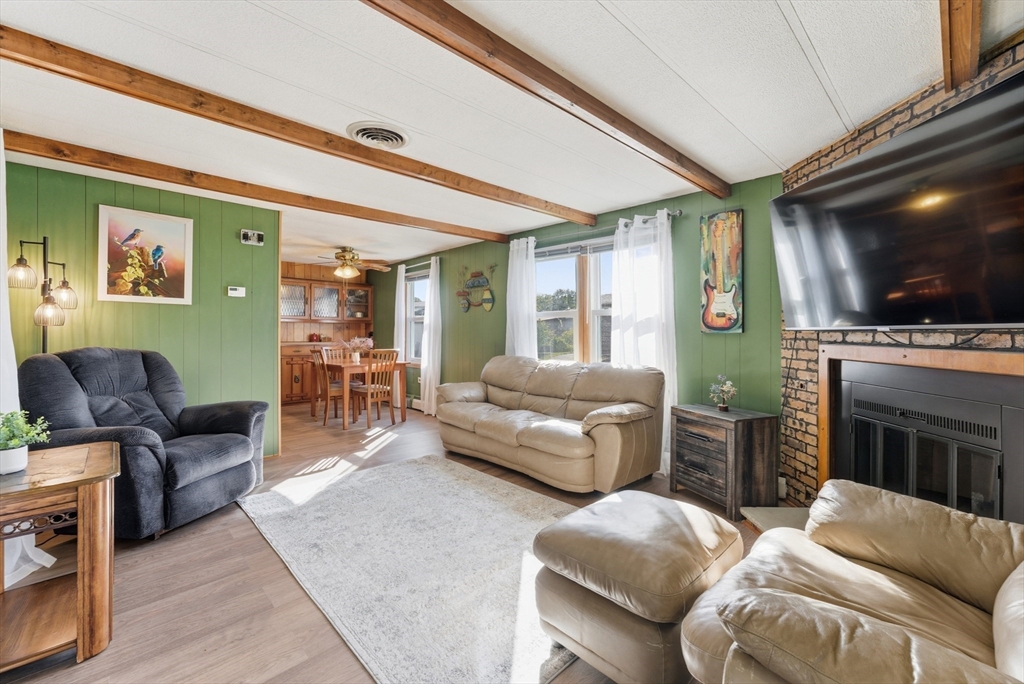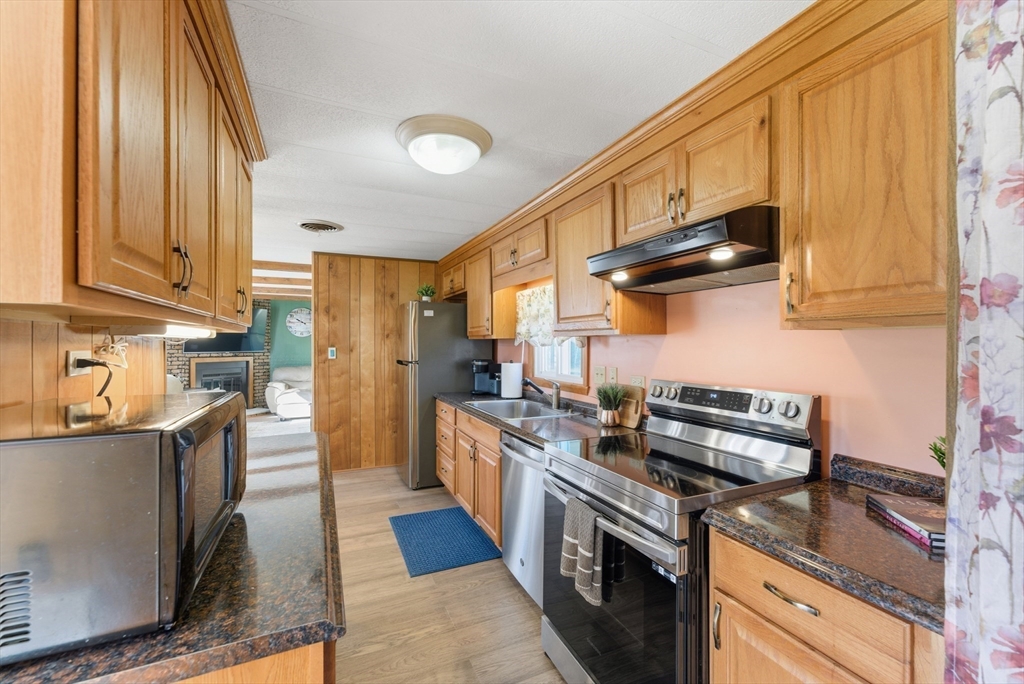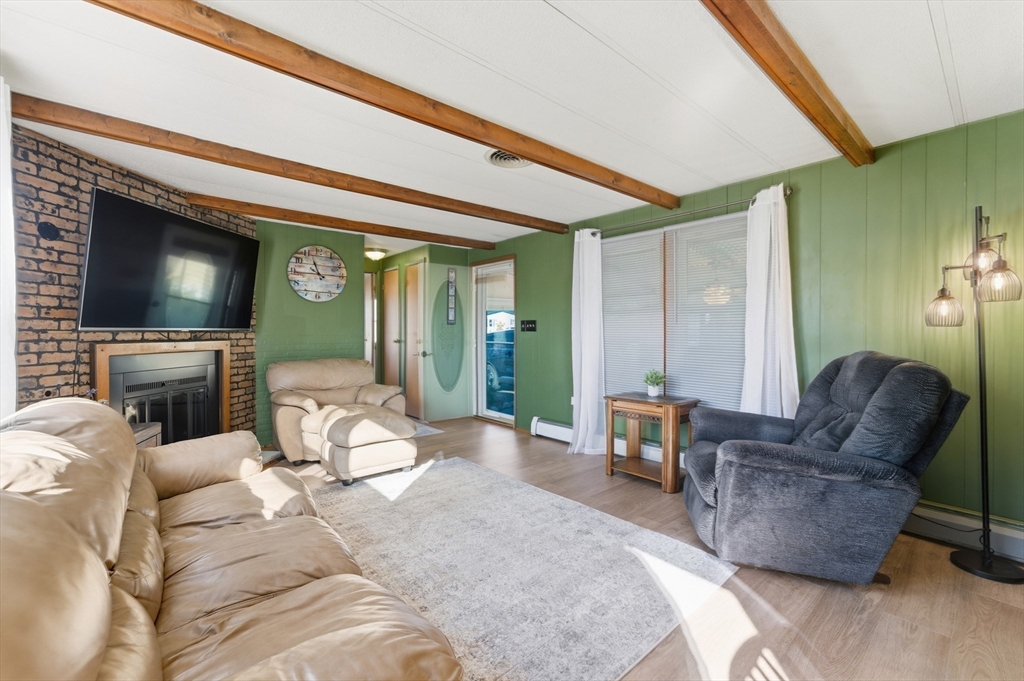 Easy living abounds! In sought after 55+ Hampden Village, this well maintained, single wide mobile home is ready for you to call it home! From the moment you arrive, the tasteful landscaping and lush green grass beckons you to come inside. Enter into a sunny 3 season porch and into this BEAUTIFUL home with so many updates. The spacious living room really shows off the cozy wood burning fireplace w/ so much natural light. The renovated kitchen has elegant stainless steel appliances, with tons of beautiful cabinetry. The kitchen free flows to the dining space with built in cabinets for even more storage! Each bedroom has ample space with new updated ceiling fans. Not one, but TWO full size baths complete this charming home. New stylish LVP floors throughout most of the home really modernize the space! Floors & subfloor replaced 2025, gas furnace 2018, central air 2022, appliances 2023, roof 2010, kitchen updated 2012, HW heater 2014, porch sliders 2022, and many newer windows!