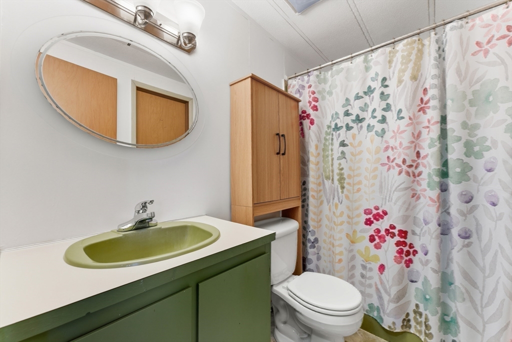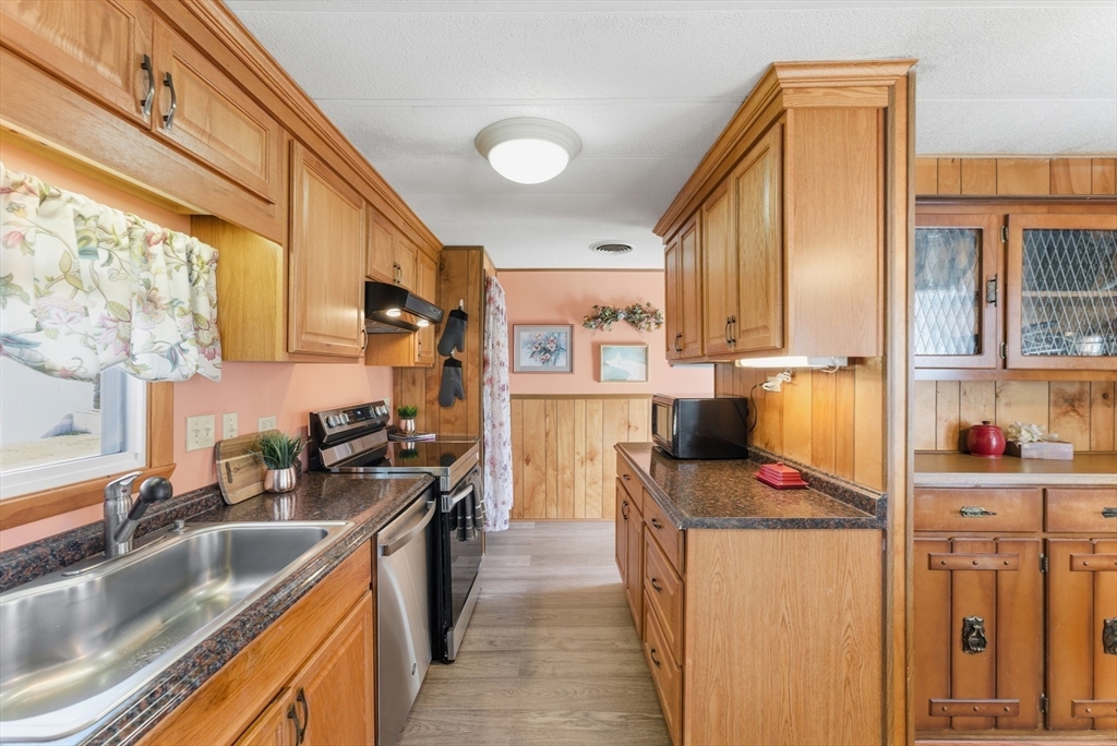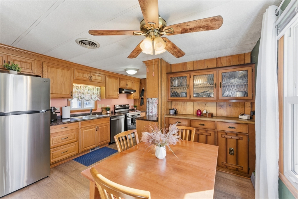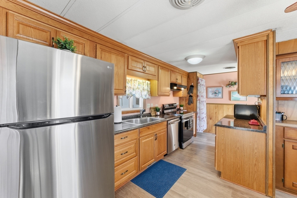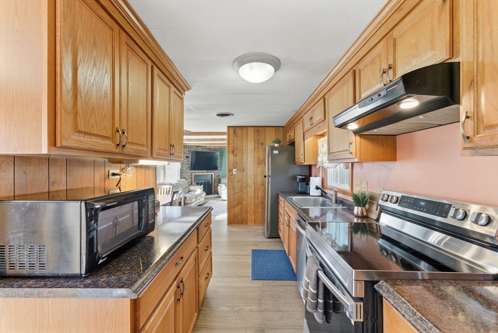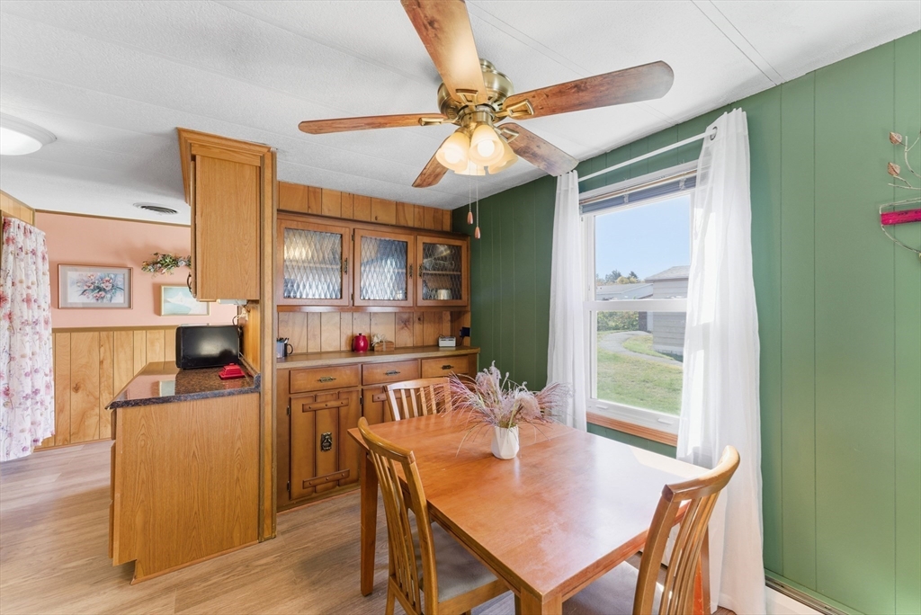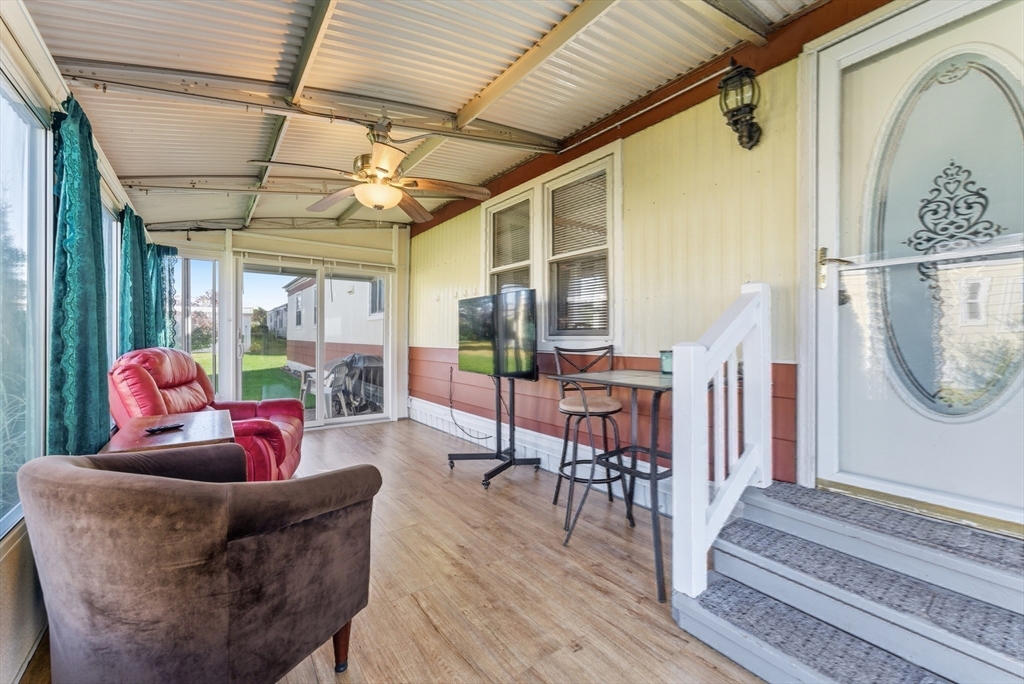 Easy living abounds! In sought after 55+ Hampden Village, this well maintained, single wide mobile home is ready for you to call it home! From the moment you arrive, the tasteful landscaping and lush green grass beckons you to come inside. Enter into a sunny 3 season porch and into this BEAUTIFUL home with so many updates. The spacious living room really shows off the cozy wood burning fireplace w/ so much natural light. The renovated kitchen has elegant stainless steel appliances, with tons of beautiful cabinetry. The kitchen free flows to the dining space with built in cabinets for even more storage! Each bedroom has ample space with new updated ceiling fans. Not one, but TWO full size baths complete this charming home. New stylish LVP floors throughout most of the home really modernize the space! Floors & subfloor replaced 2025, gas furnace 2018, central air 2022, appliances 2023, roof 2010, kitchen updated 2012, HW heater 2014, porch sliders 2022, and many newer windows!