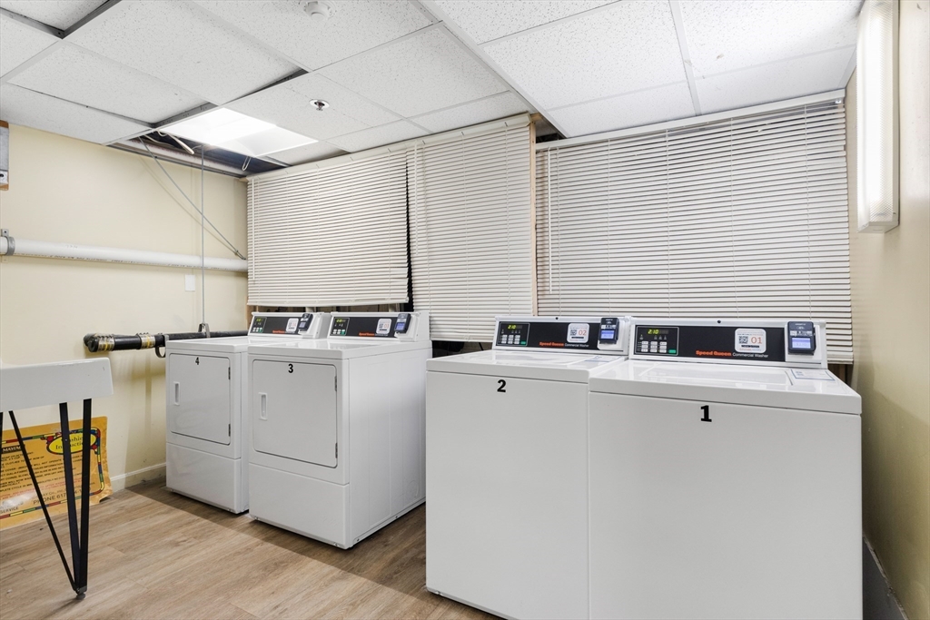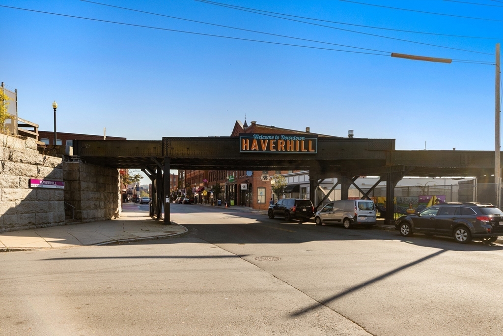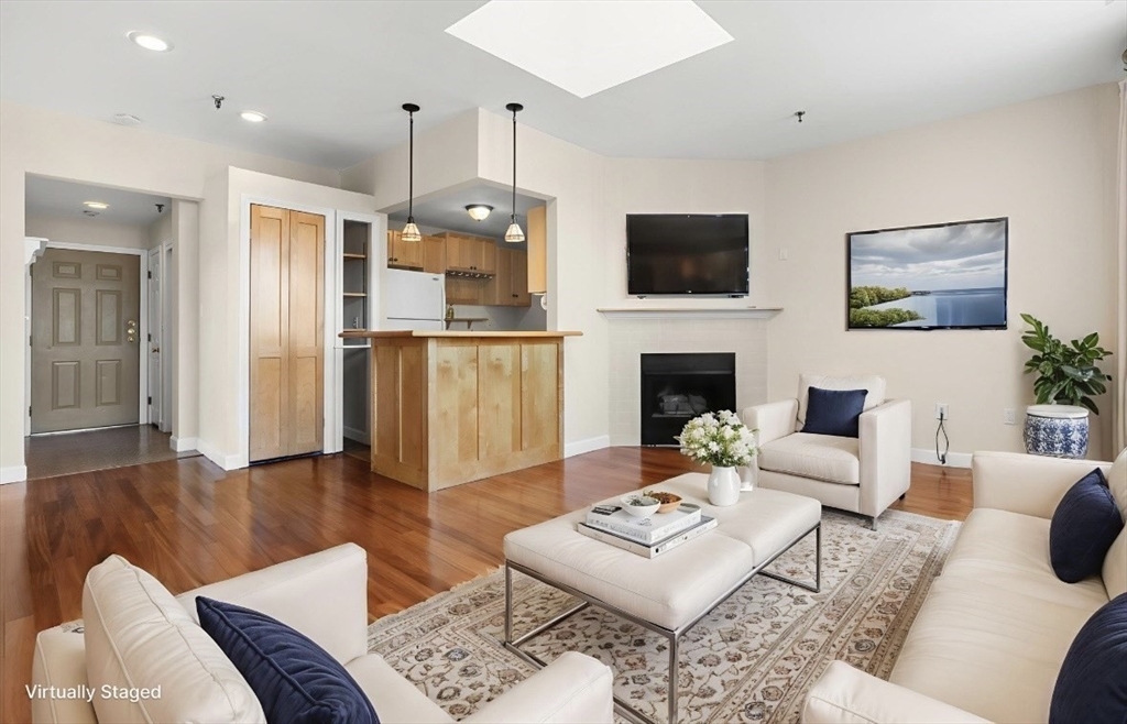 Experience the perfect blend of historic charm, modern comfort and convenience in this top-floor unit at the Bragg Block Condominiums. Sunlight fills the open concept living space through large windows, a skylight and high ceilings - highlighting gleaming hardwood floors and a cozy gas fireplace in the living room. The kitchen offers light wood cabinetry, ample counter space, an in-unit washer/dryer and a built-in breakfast bar. There is also space for a dining table—ideal for entertaining or casual meals. Two generously sized bedrooms feature ample closet space. Conveniences include a common laundry room, elevator access and additional on-site storage. A private deeded parking spot sits just across the street in a gated parking lot. A commuters dream! Enjoy effortless access to commuter line, public transportation and route 495. There is always something to do in this vibrant neighborhood filled with restaurants, shops, parks and a scenic river boardwalk. Nothing to do but move-in!