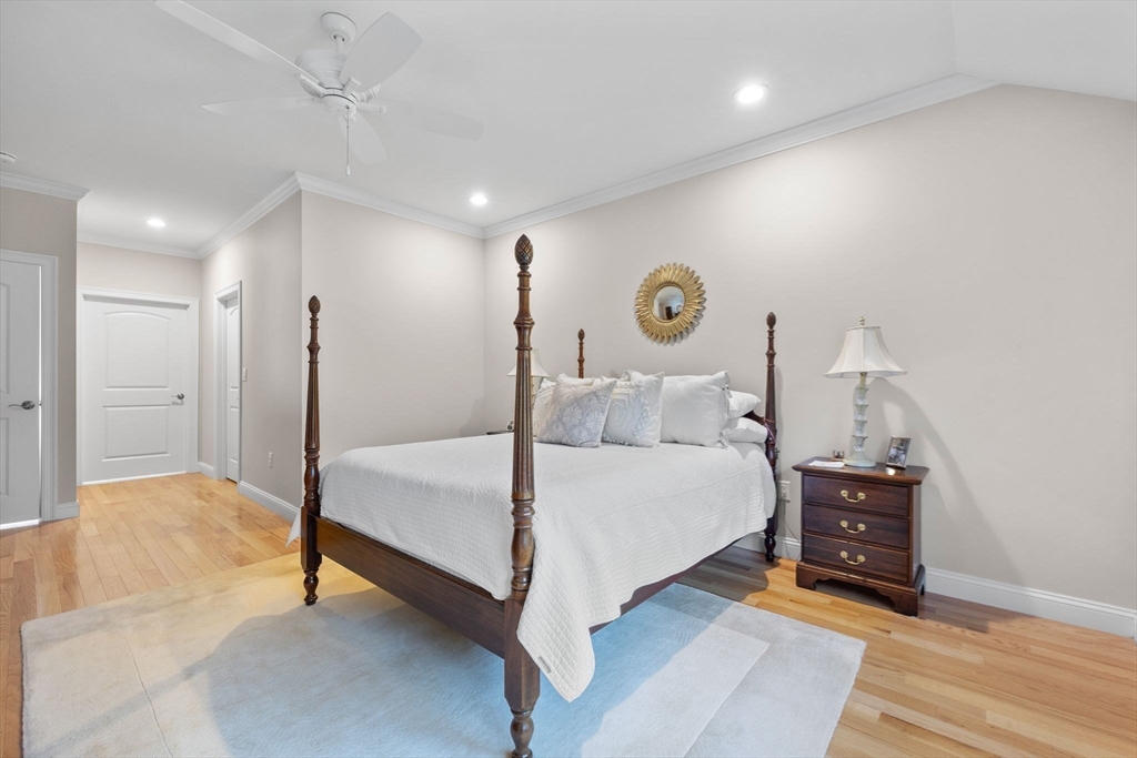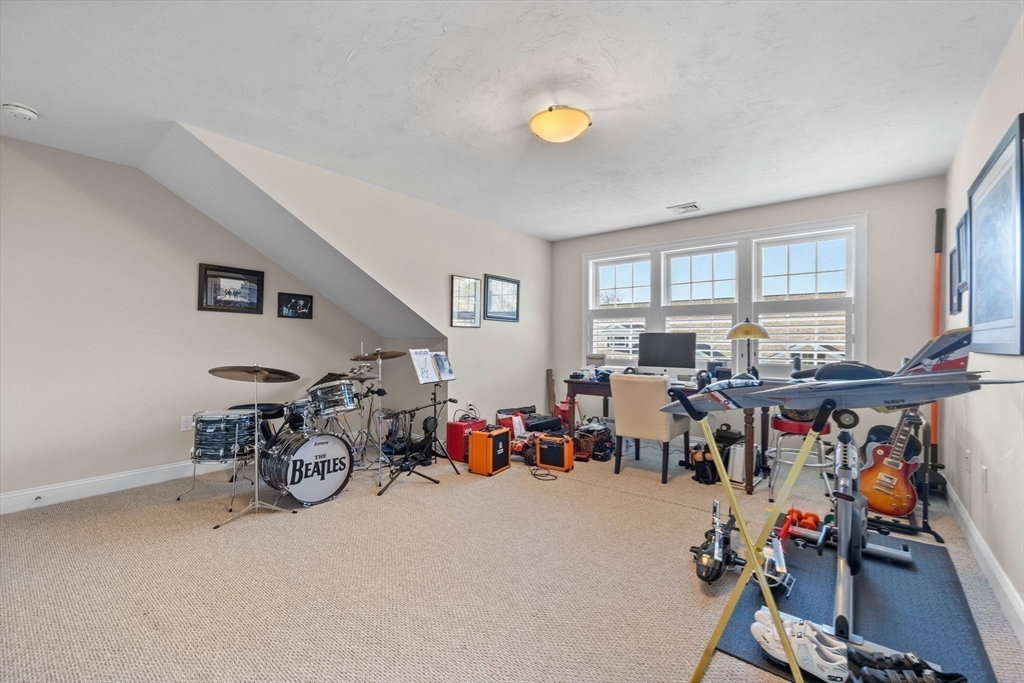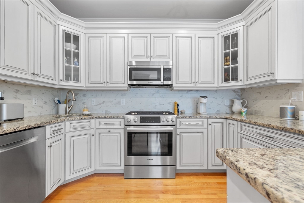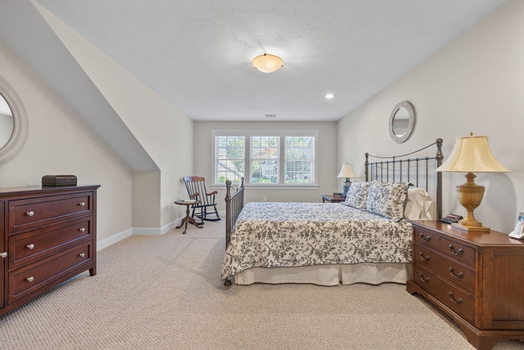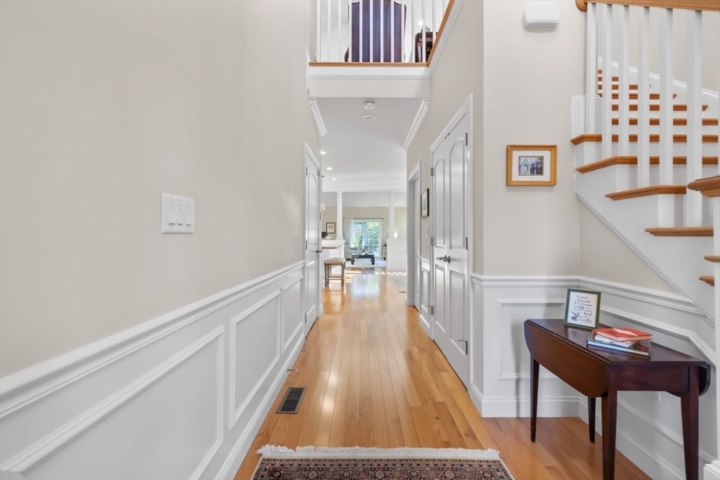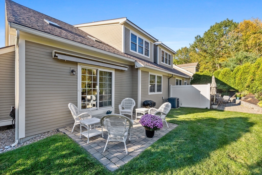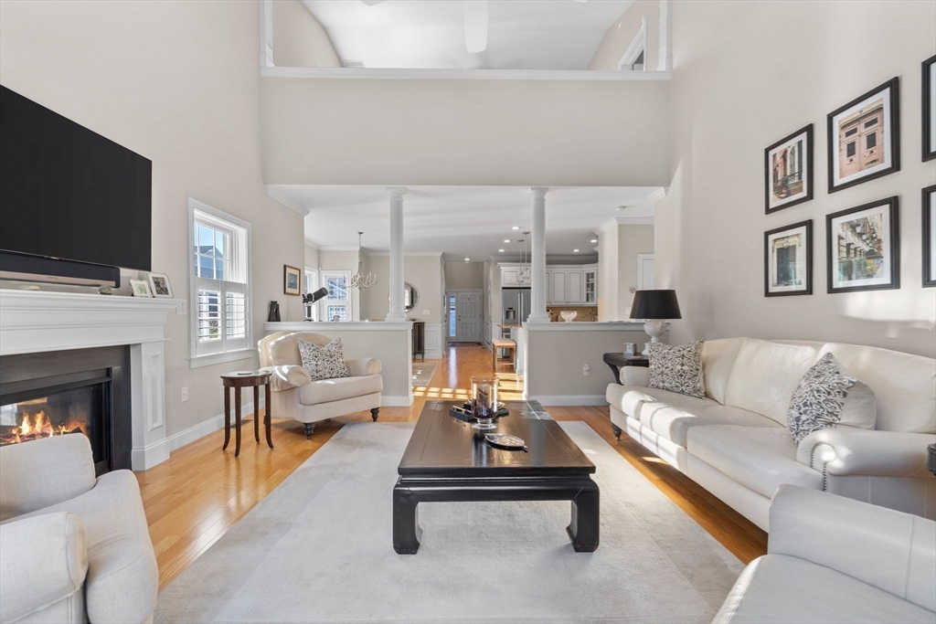 Welcome to North Meadow Village, a 55+ community offering luxurious first-floor living. Step into this beautifully maintained home with perfectly kept hardwood floors, wainscoting, and crown molding throughout, complemented by high ceilings and bright, airy rooms. The heart of the home is the spacious kitchen, ideal for entertaining, featuring light cabinetry, stunning granite countertops, and a generous center island, all perfectly situated in the open-concept layout that flows seamlessly into the dining and family areas. The family room is a cozy retreat with a gas fireplace, Anderson windows, and skylights that pour in natural light. Unwind on the private patio, sheltered by a shade awning, and enjoy the serene surroundings. The primary bedroom, full bath, and laundry are conveniently located on the first floor, providing effortless living. Upstairs, the cozy loft area offers a charming spot to relax, overlooking the family room, while the two spacious bedrooms on the second floor.
