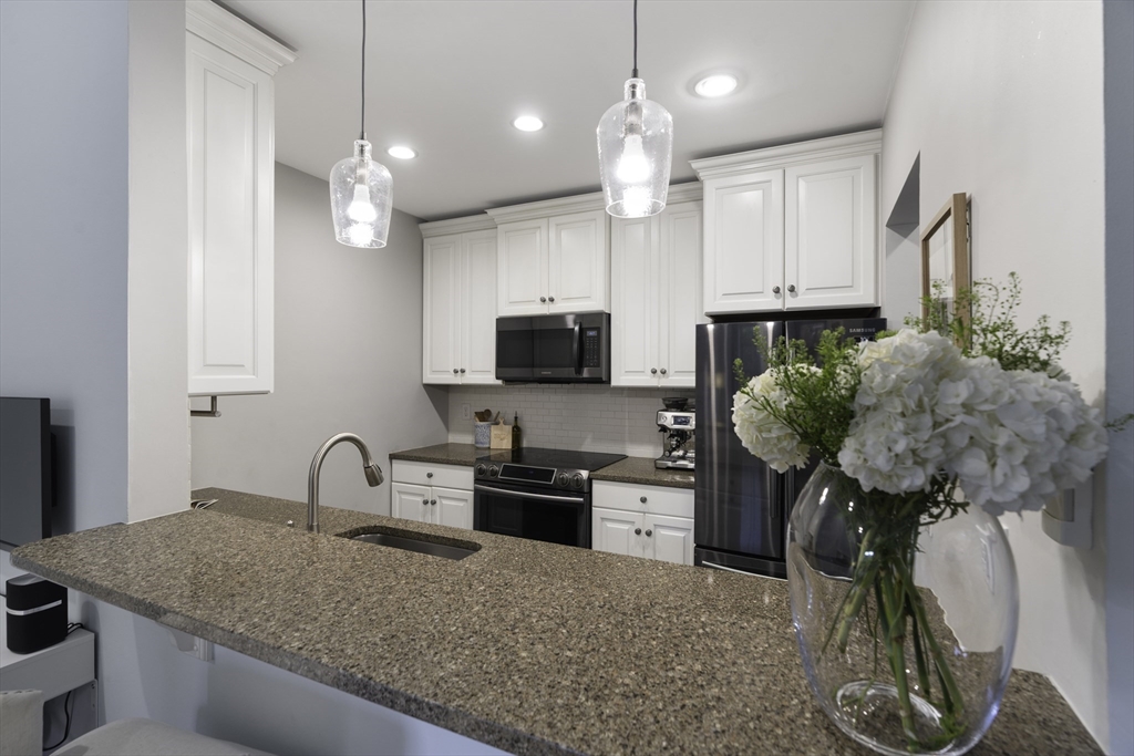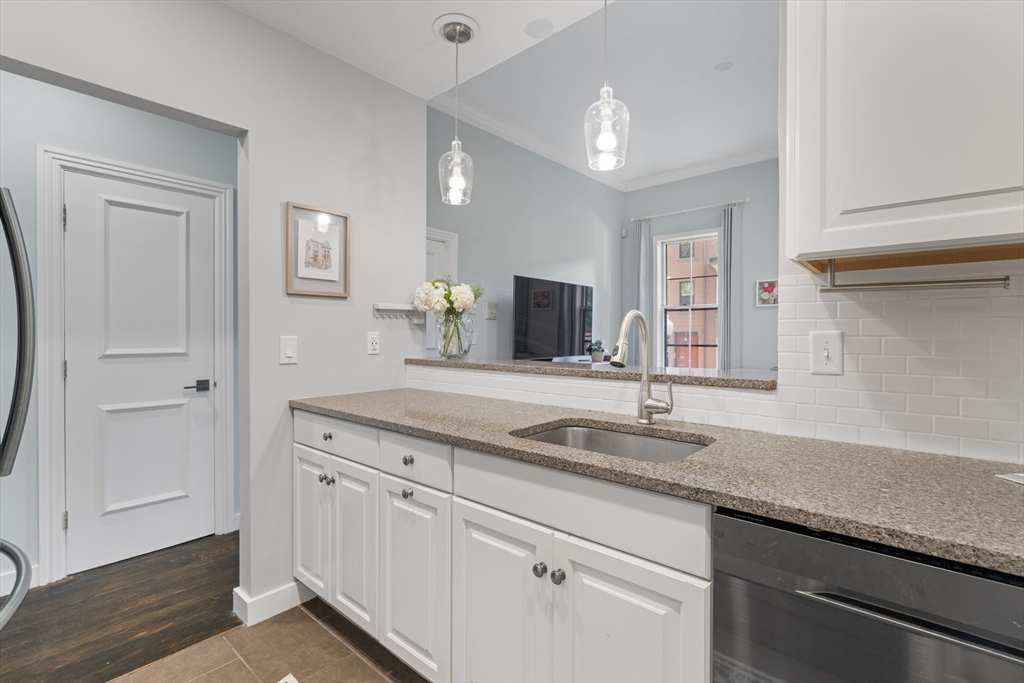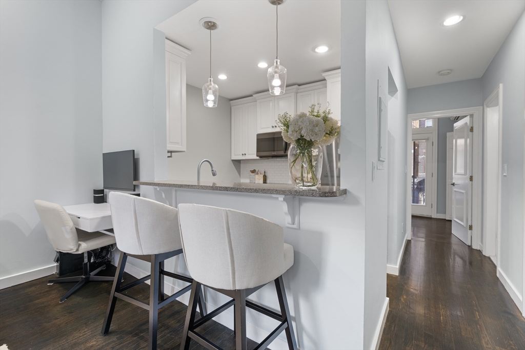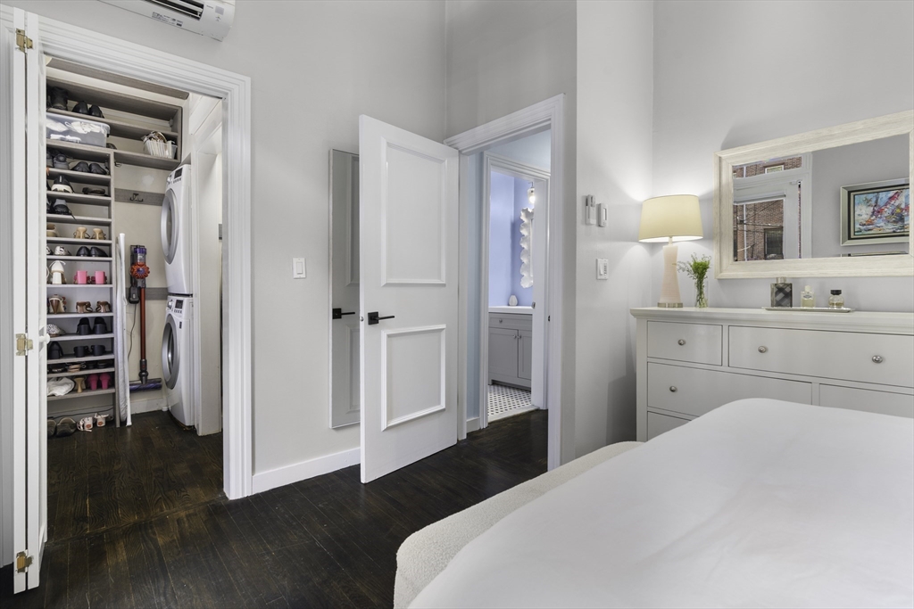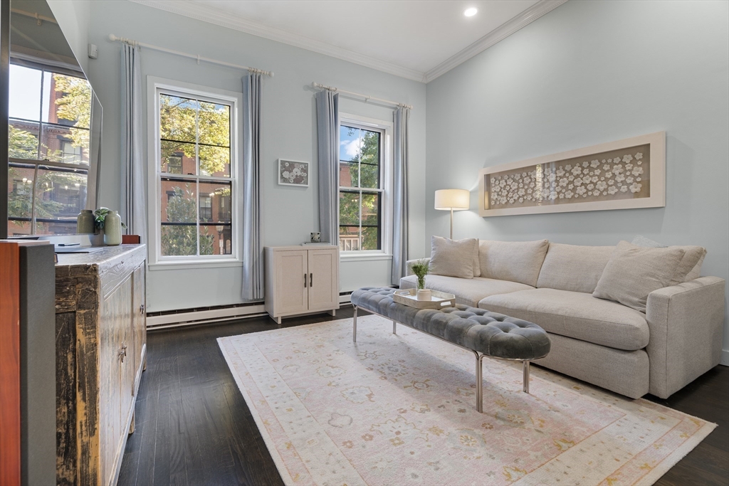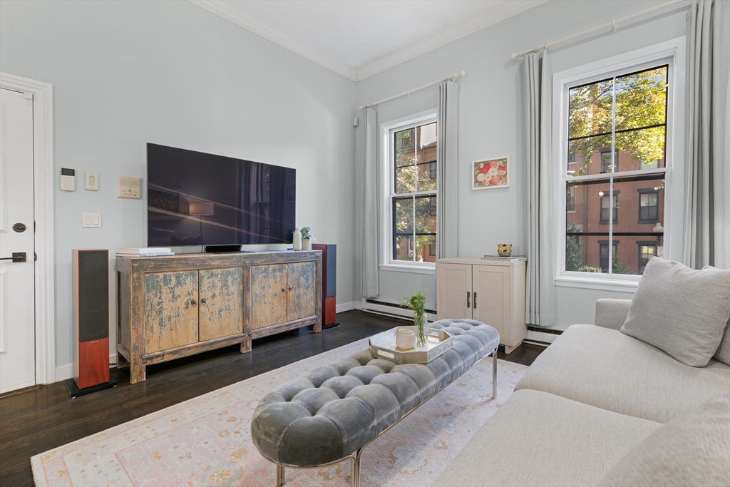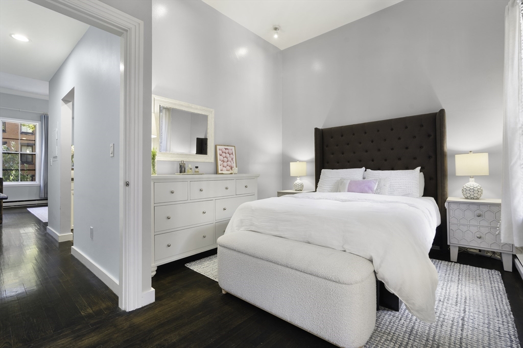 Pristine parlor-level 1-bedroom, 1-bathroom home offers the perfect blend of charm, comfort, & functionality—nestled right in the heart of the South End. The spacious living area features soaring ceilings & oversized windows that flood the space with natural light, creating an inviting atmosphere ideal for relaxing, entertaining, or working from home. A built-in high-top seamlessly connects the living space to the kitchen, making it easy to entertain while cooking your favorite meals. The kitchen is outfitted with stainless steel appliances & offers ample cabinet space for all your storage needs. Down the hall, you'll find a spacious bathroom features a full tub and clean, modern finishes—conveniently located for both you & guests. A spacious bedroom with a generous walk-in closet, complete with built-in shelving and a full-sized washer and dryer. To top it all off, step outside to your large, private deck—perfect for dining al fresco or simply enjoying the changing seasons of Boston