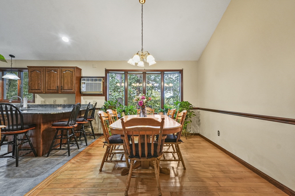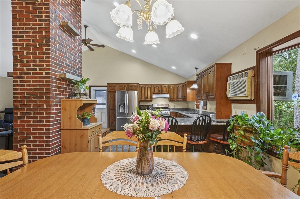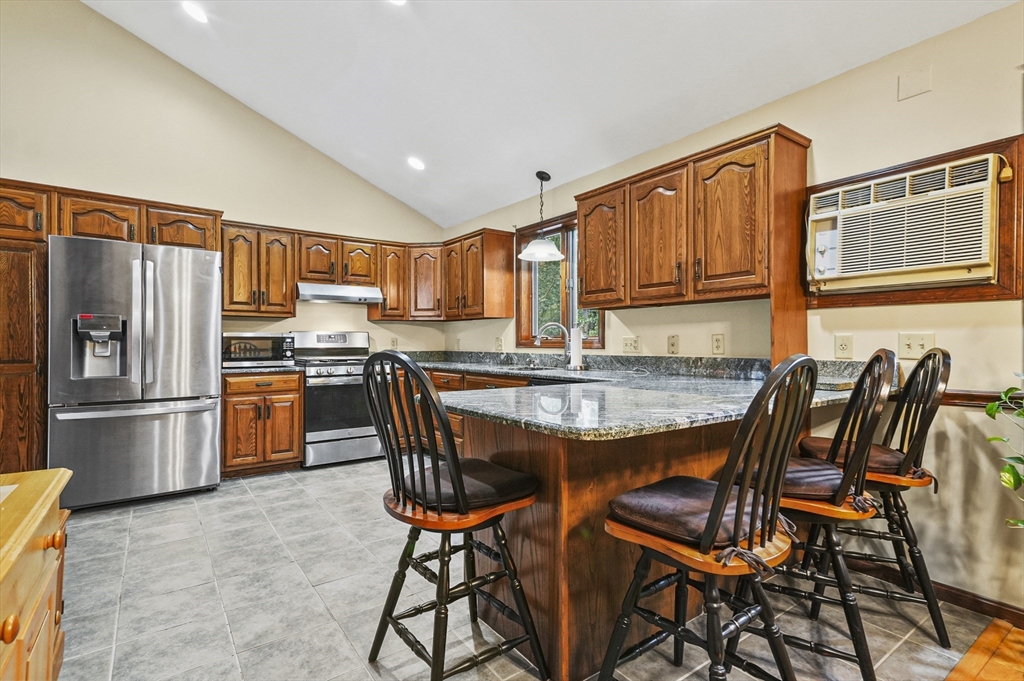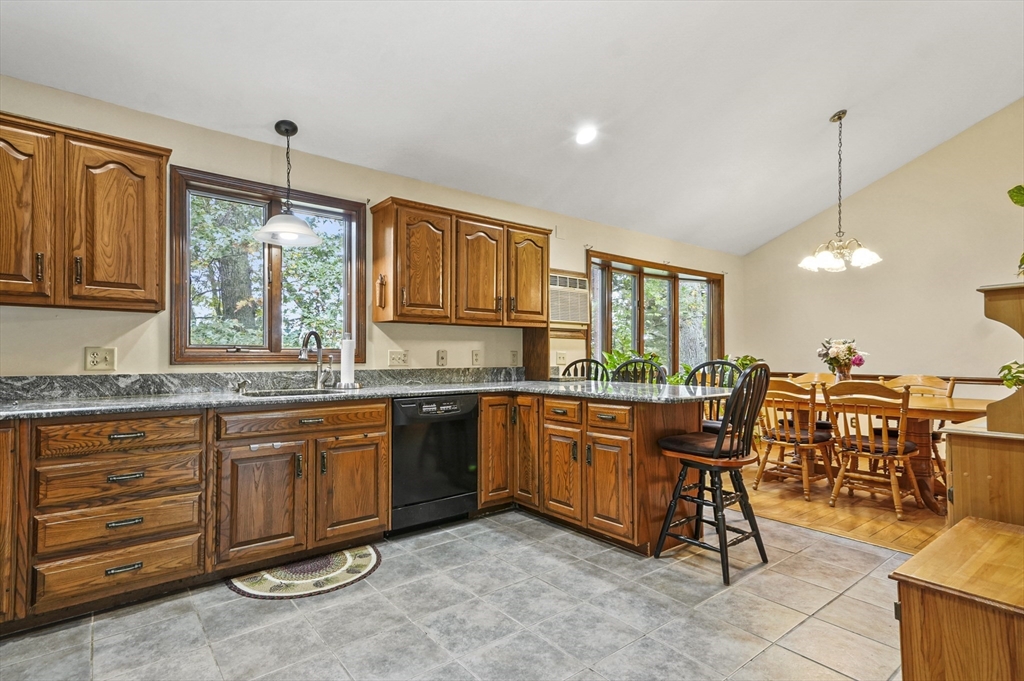 Charming & meticulously maintained ranch awaits-offering the perfect blend of comfort & convenience. Set on just under 2 acres, this home offers privacy and space while being conveniently located near highways for easy commuting. With just under 1,500 sq ft of living space, it features a bright, updated kitchen with stone countertops, ample cabinetry, a breakfast bar, and stainless-steel appliances. The open-concept living/dining area is perfect for entertaining, w/ a soaring cathedral ceiling, bay window & wood stove. Enjoy three comfortable bedrooms, including a primary w/ en suite, plus an add'l full bath for guests or family. Outside enjoy a spacious back deck overlooking a beautifully landscaped yard w/ a tranquil koi pond. The attached two-car garage & open-air breezeway add everyday convenience. Add'l features include a full basement w/ finishing potential & a new furnace to be installed prior to closing. This move-in ready home combines timeless charm w/ modern updates!