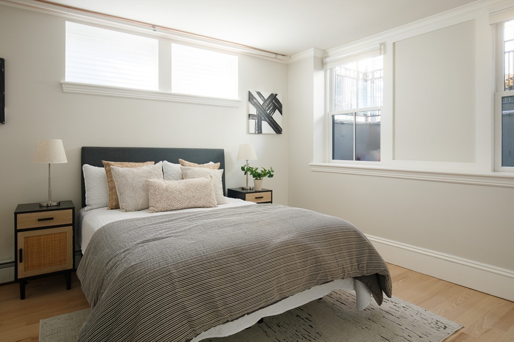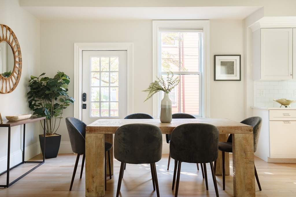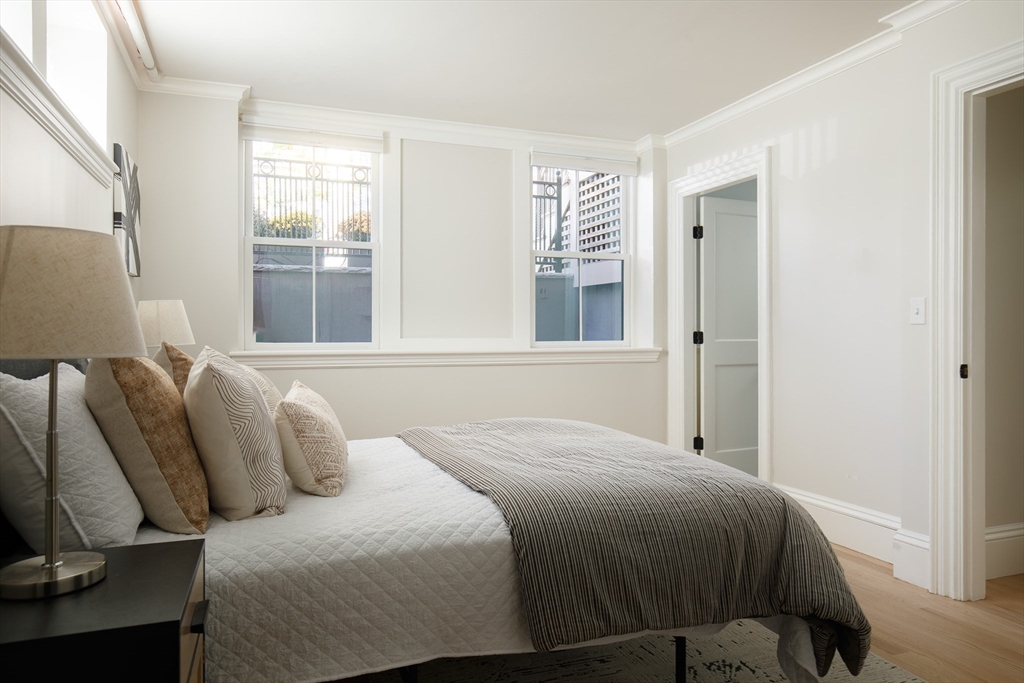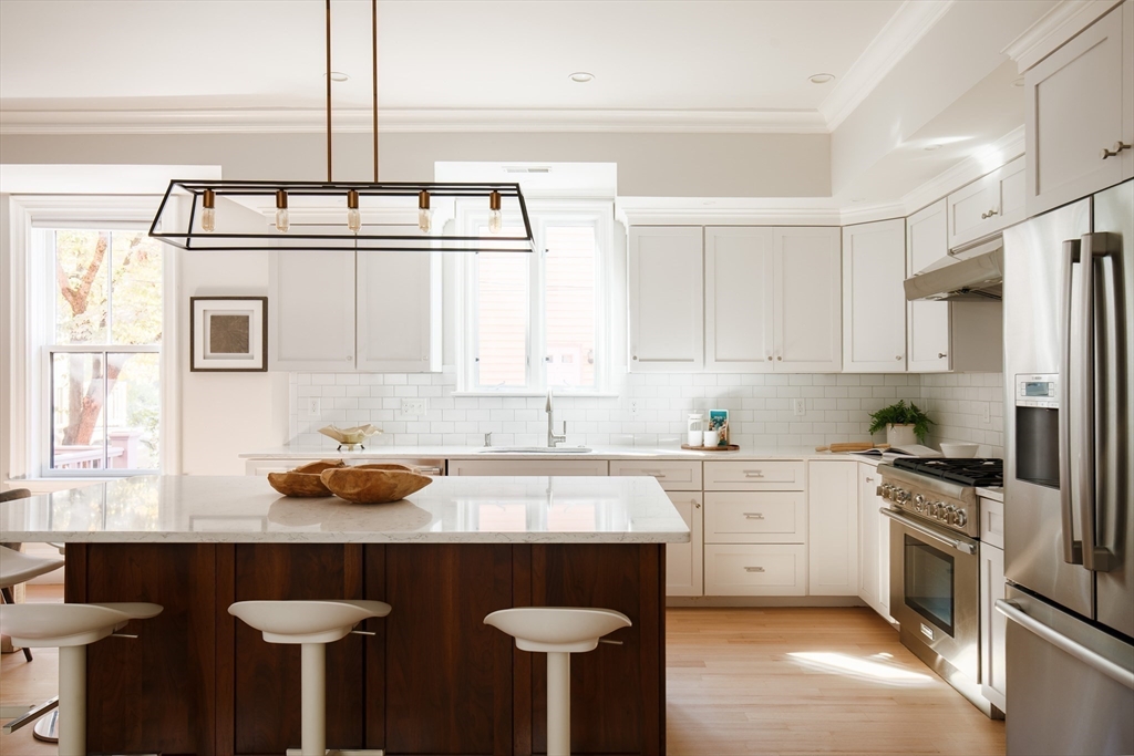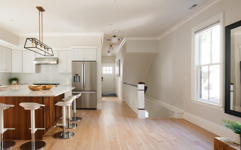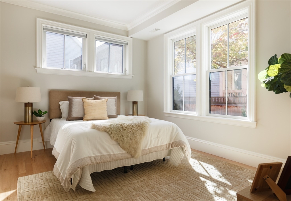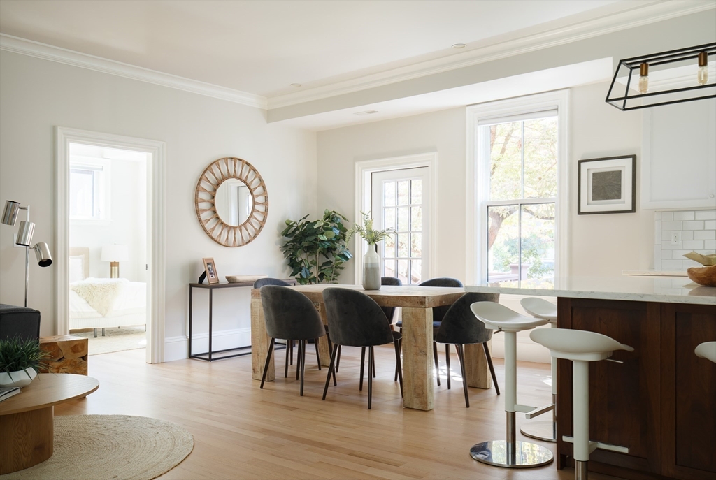 There’s something quietly striking about this award winning home—set on a tree-lined street, it blends modern comfort with a thoughtful layout across two levels. Recently renovated, it offers an open-concept main level, a private patio, and one-car parking with an EV charger on a heated driveway. A chef’s kitchen with two-tone cabinetry, a waterfall island with seating for 5, and stainless appliances anchor the living and dining areas, which extend seamlessly outdoors to a private patio finished with pavers and framed by shrubbery and trees. The serene primary suite is situated at the rear of the home and features a walk-in closet and spa-like bath with a double vanity and dual shower heads. A second bedroom overlooking Norfolk street connects to a full bath, while the lower-level ensuite bedroom offers flexibility for guests or a quiet workspace. Complete with hardwood floors, in-unit laundry, and proximity to Inman and Central Squares, it’s a polished blend of convenience and retreat