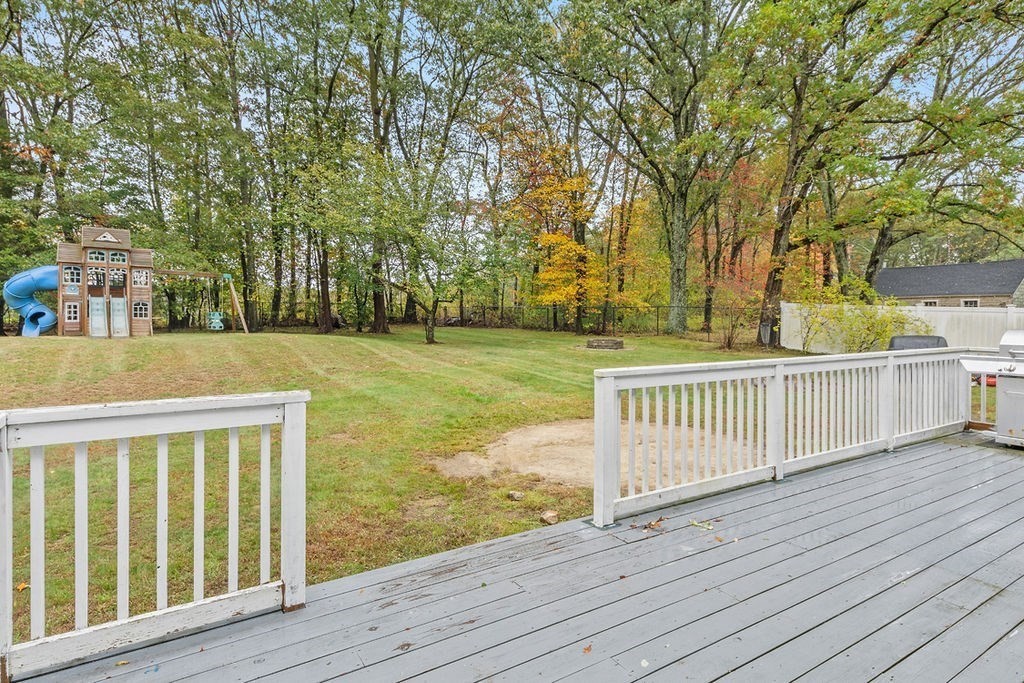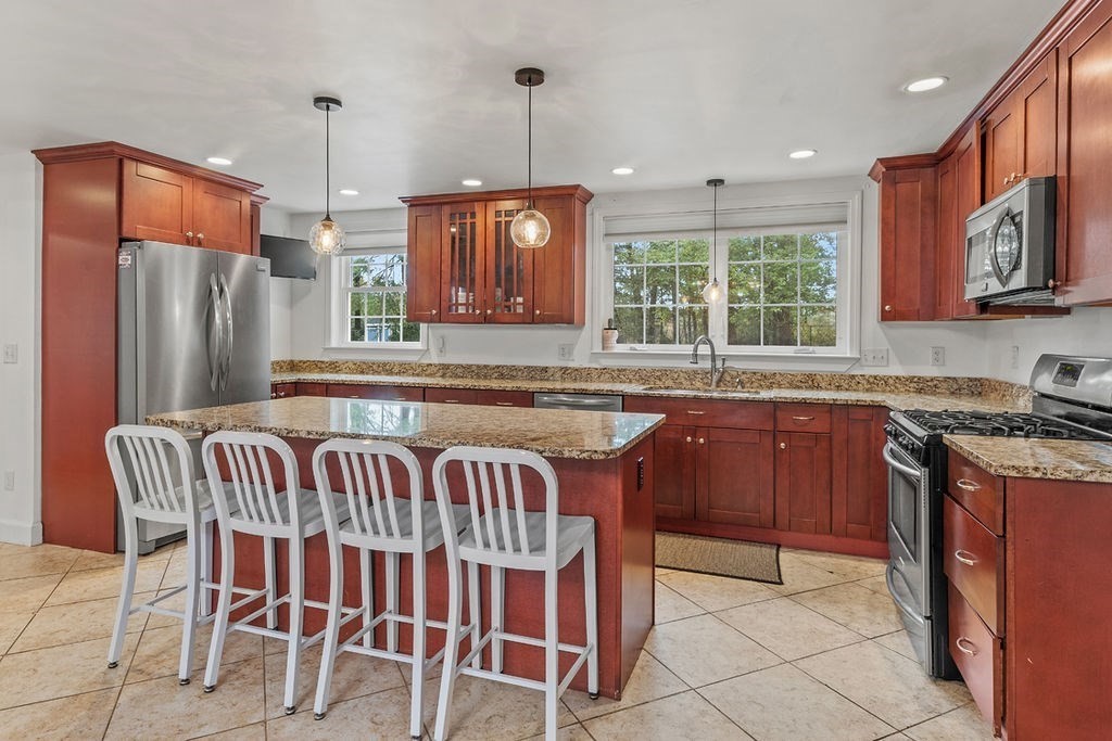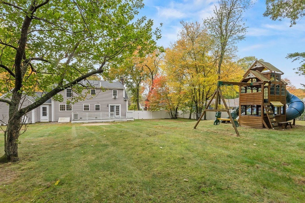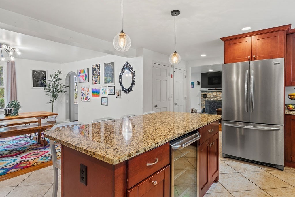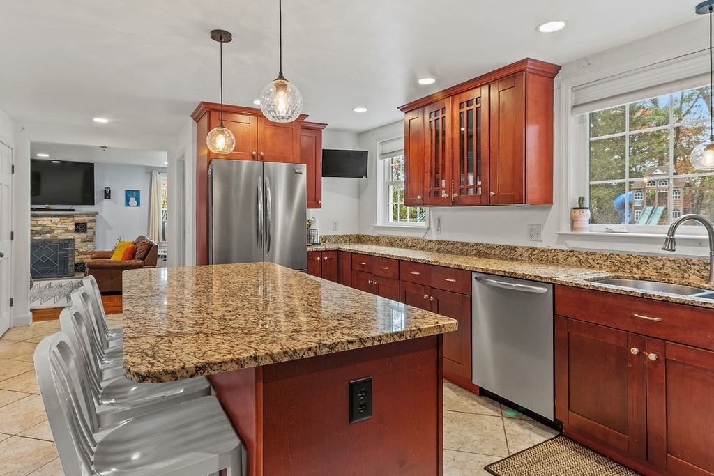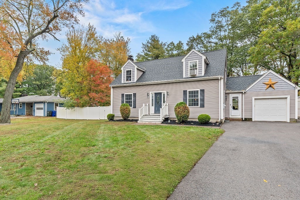 Welcome home to this warm and inviting 3-bedroom, 2.5-bath Cape, perfectly set on a ½-acre lot in Hopedale. Picture holidays gathered around the wood-burning fireplace in the spacious front-to-back living room, or summer barbecues on the back deck overlooking the fenced-in yard where everyone can spread out and play. The cherry cabinet kitchen, complete with granite counters, stainless steel appliances, wine fridge, and propane gas range, is ideal for cooking and entertaining. A convenient breezeway/mudroom connects to the garage, keeping things tidy year-round. Upstairs, three comfortable bedrooms include a guest bath with double vanity and a relaxing primary suite with walk-in closet and private bath. With a new roof, vinyl siding, newer heating system, and an unbeatable location near schools, shopping, and highways, this home blends comfort, convenience, and charm—ready for you to make lasting memories.