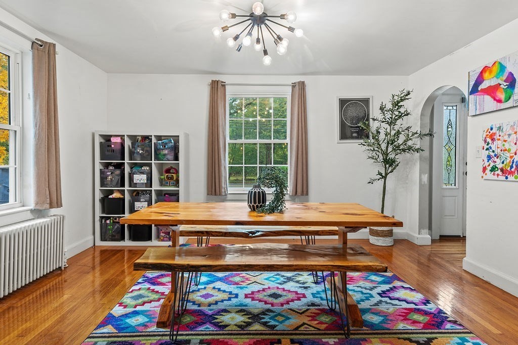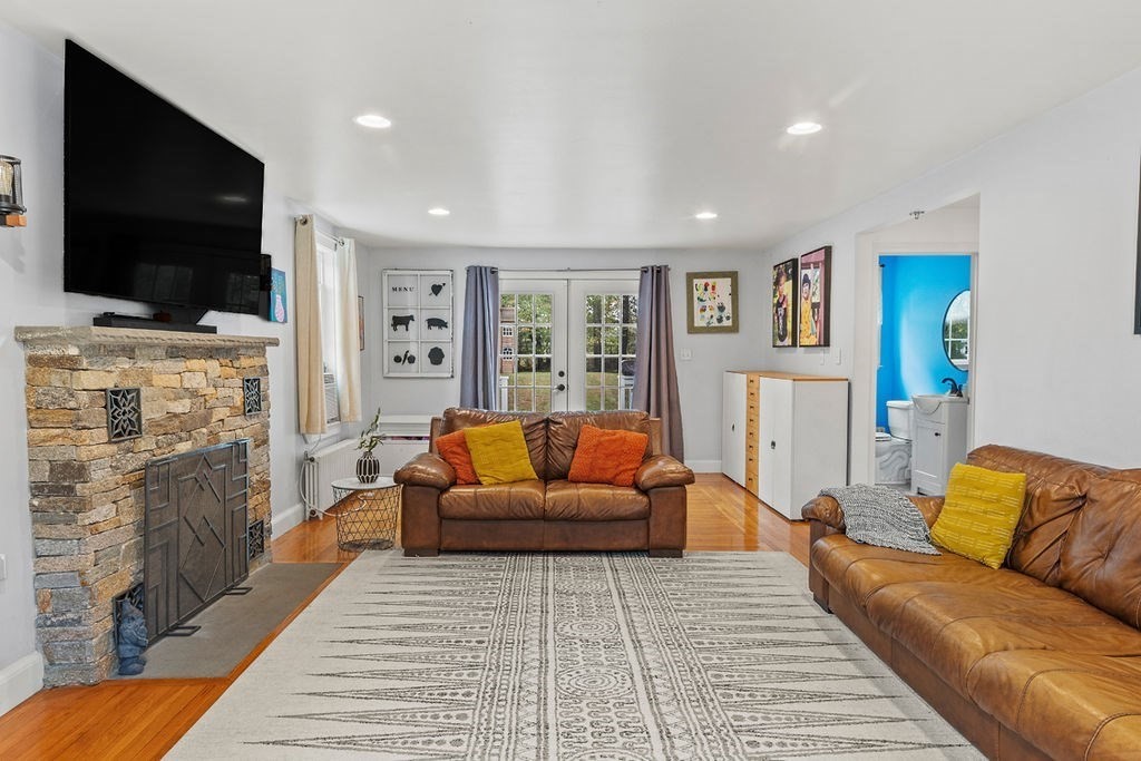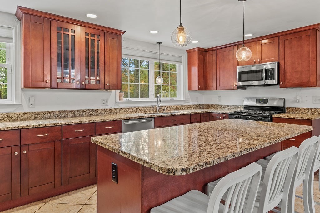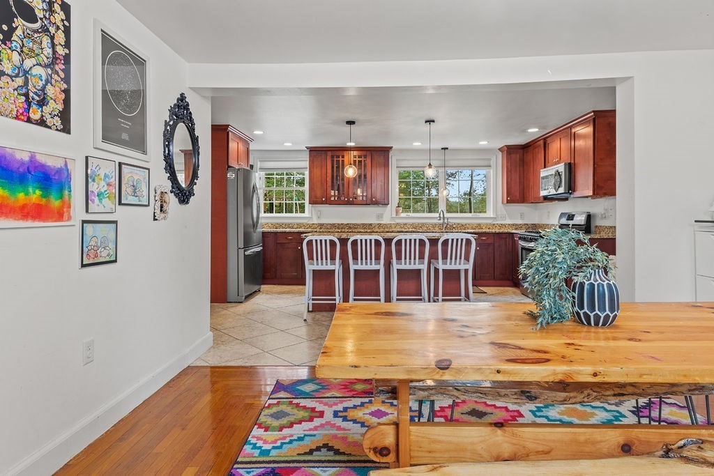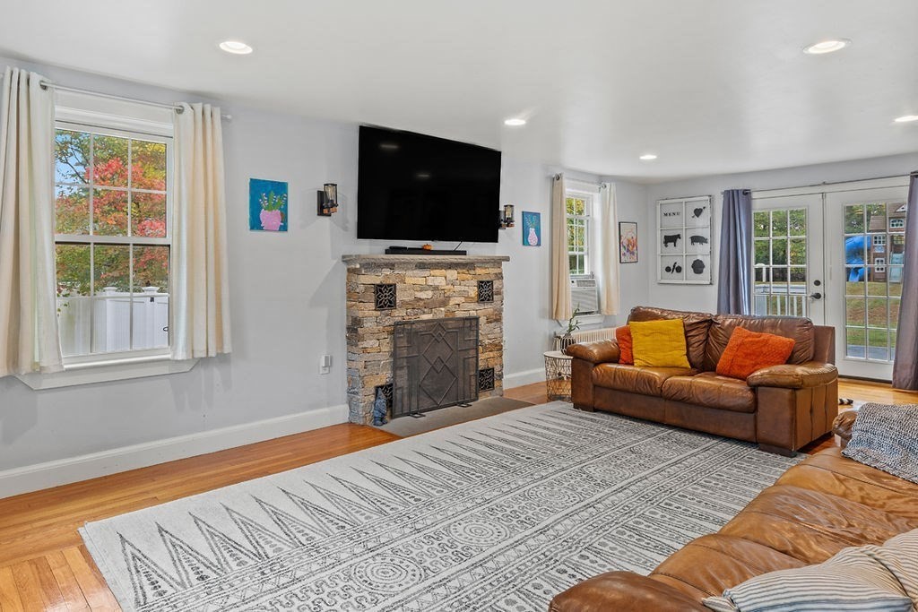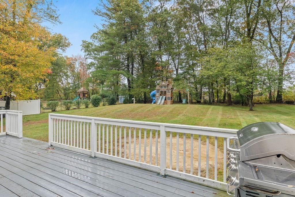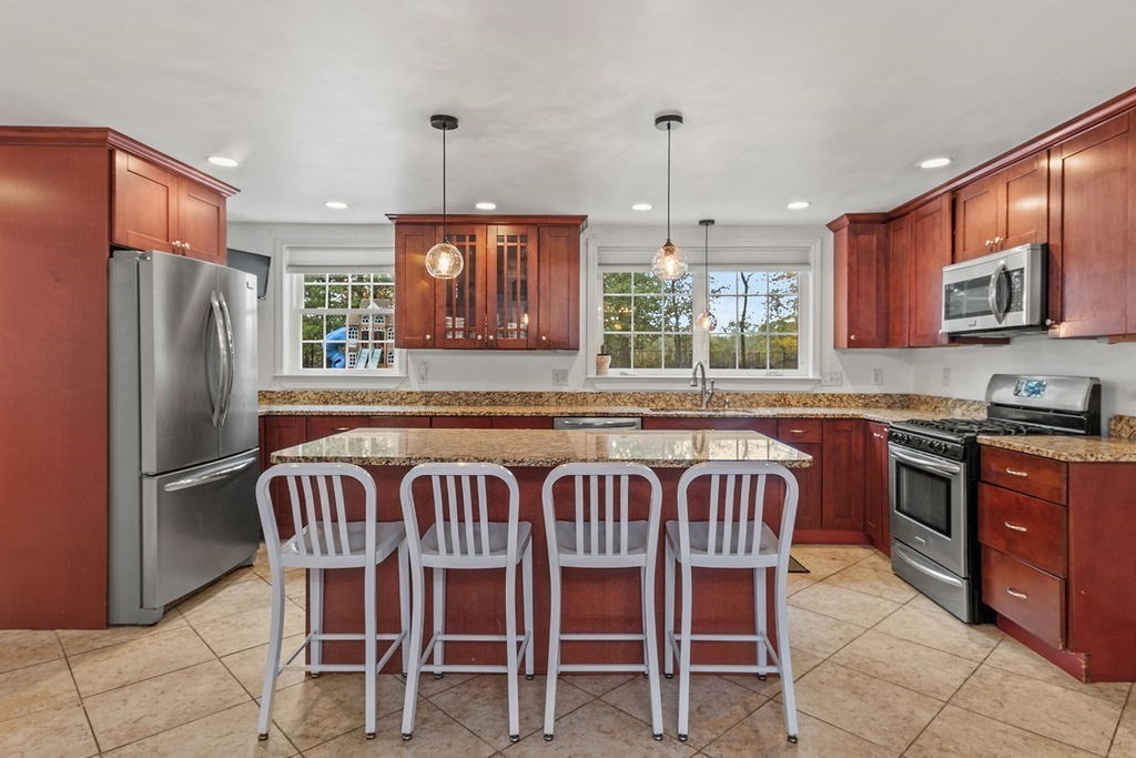Welcome home to this warm and inviting 3-bedroom, 2.5-bath Cape, perfectly set on a ½-acre lot in Hopedale. Picture holidays gathered around the wood-burning fireplace in the spacious front-to-back living room, or summer barbecues on the back deck overlooking the fenced-in yard where everyone can spread out and play. The cherry cabinet kitchen, complete with granite counters, stainless steel appliances, wine fridge, and propane gas range, is ideal for cooking and entertaining. A convenient breezeway/mudroom connects to the garage, keeping things tidy year-round. Upstairs, three comfortable bedrooms include a guest bath with double vanity and a relaxing primary suite with walk-in closet and private bath. With a new roof, vinyl siding, newer heating system, and an unbeatable location near schools, shopping, and highways, this home blends comfort, convenience, and charm—ready for you to make lasting memories.