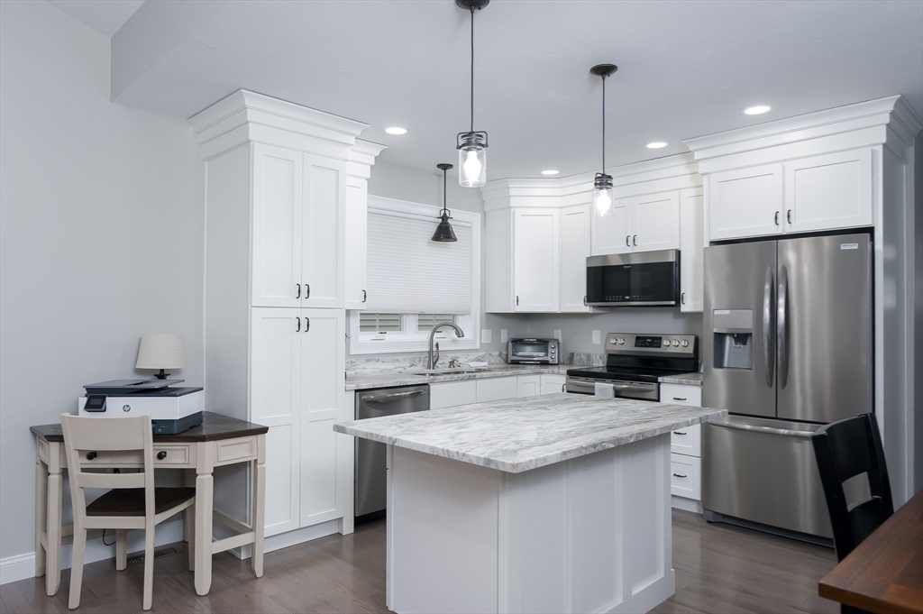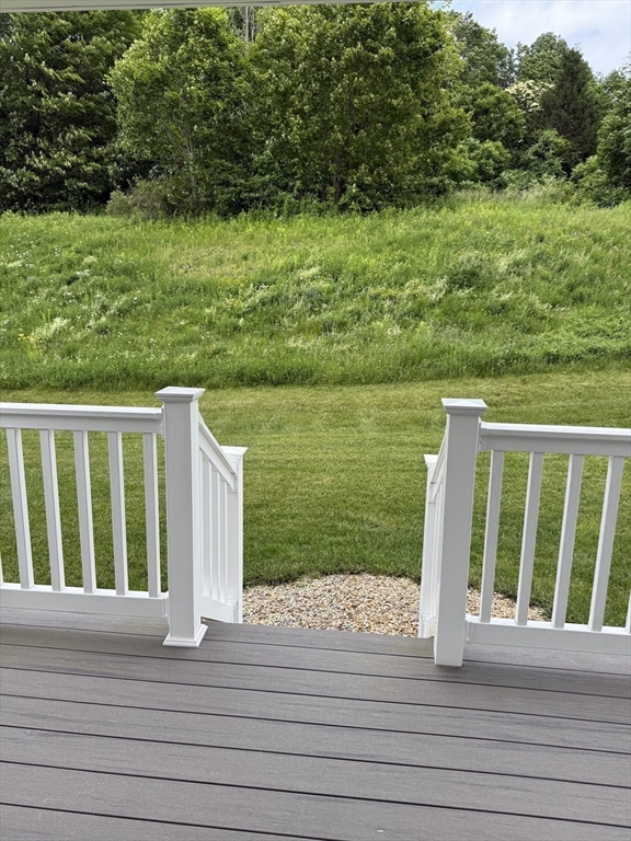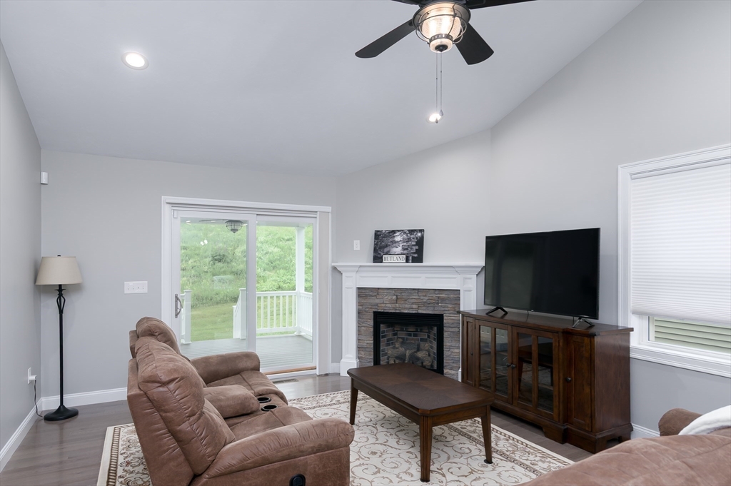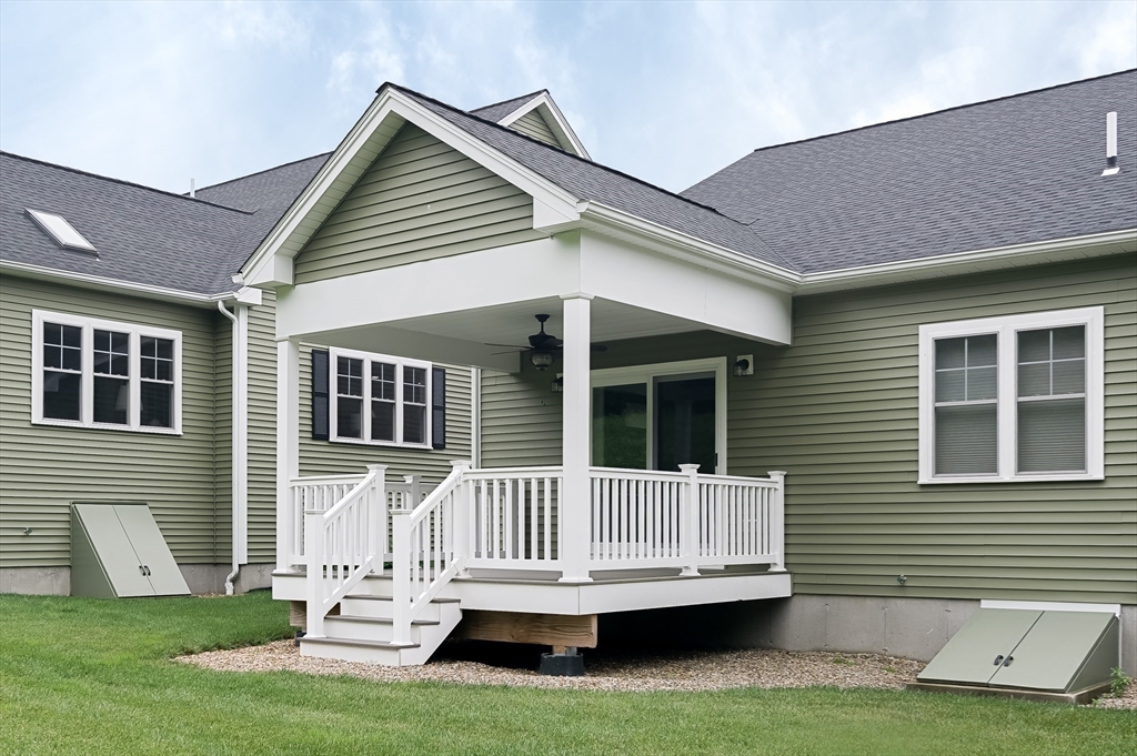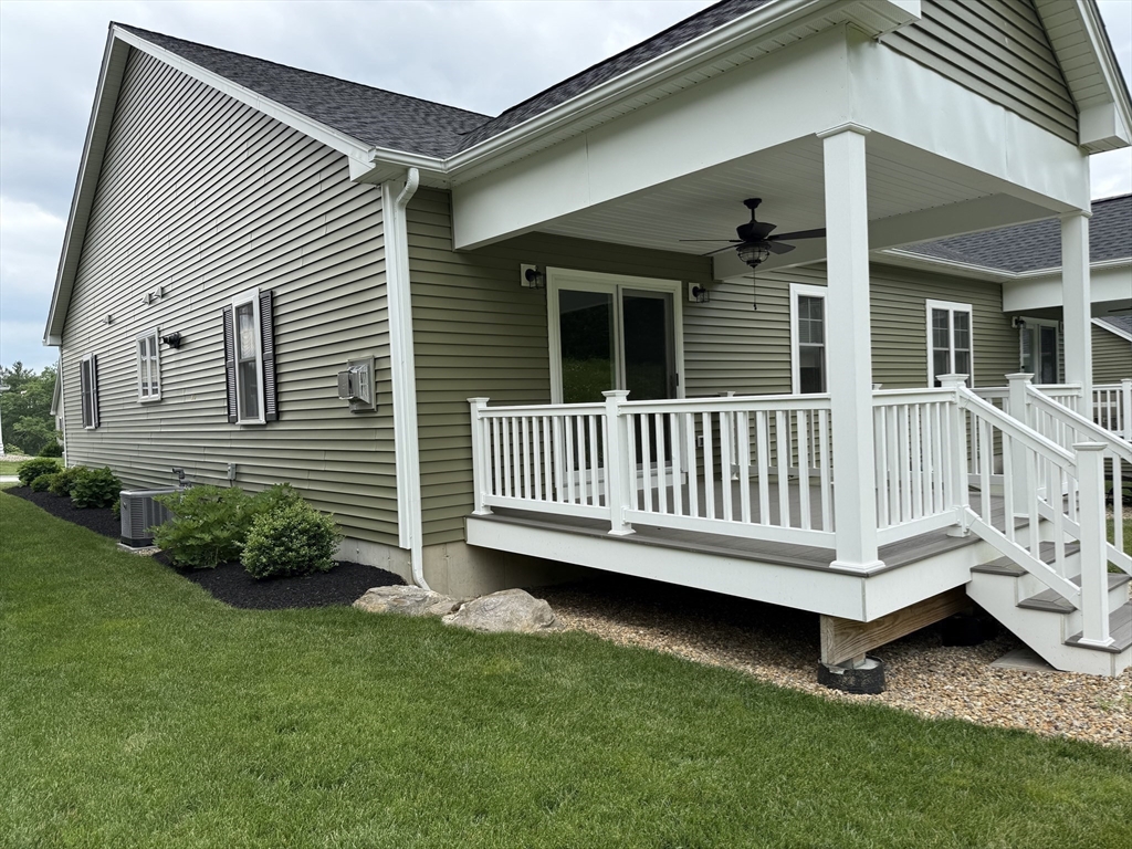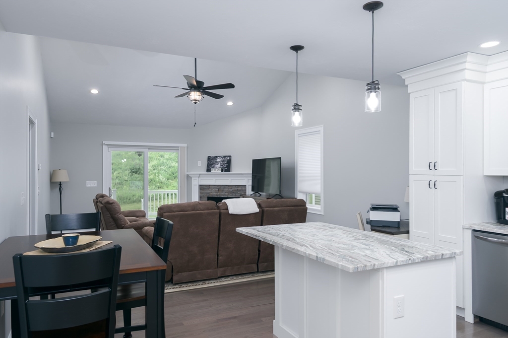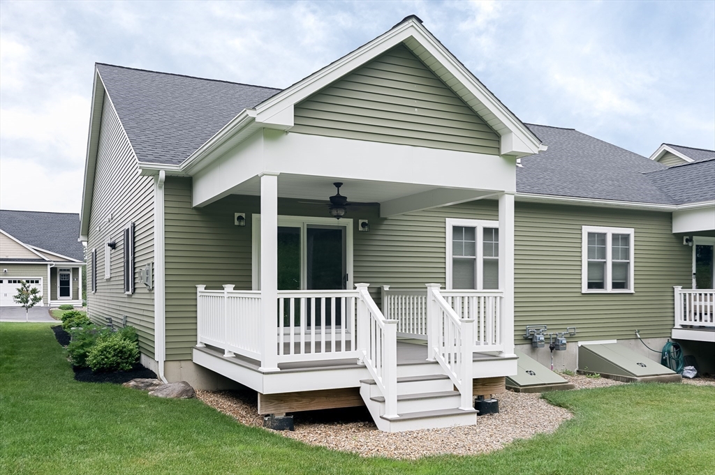 Welcome to Spruce Hill where you find this just like new one level living condo in a lovely 55+ community . Offering dine in kitchen with center island, granite counters, stainless steel appliances , white cabinetry accented with crown molding as well soft close features. Open to living room with vaulted ceilings, Propane FP and slider to composite covered porch/deck with views of wildflowers and mature trees. Spacious primary suite with ample closet space and private bath with dbl vanity sink , granite counters and shower . 2nd bedroom can also be used as an office or den all with tasteful plank flooring . 1st floor laundry option and one car garage complete the main level . 2nd laundry hook up in the LL and endless options for finishing or plenty of storage . All located closest to town center. Local restaurants , and parks