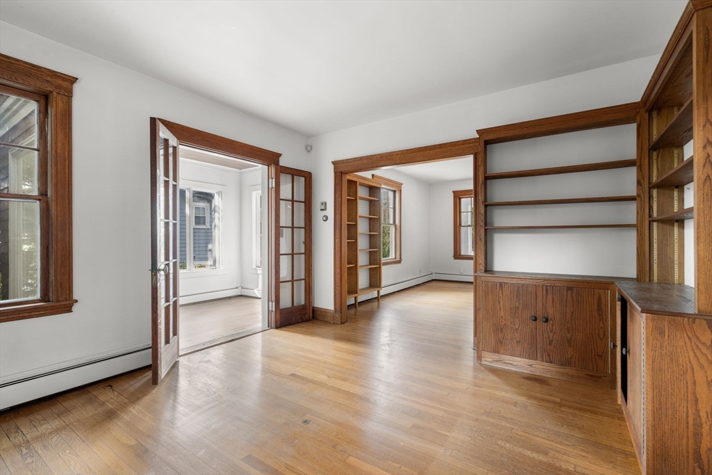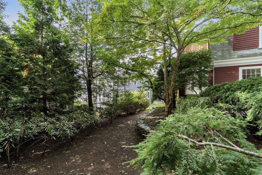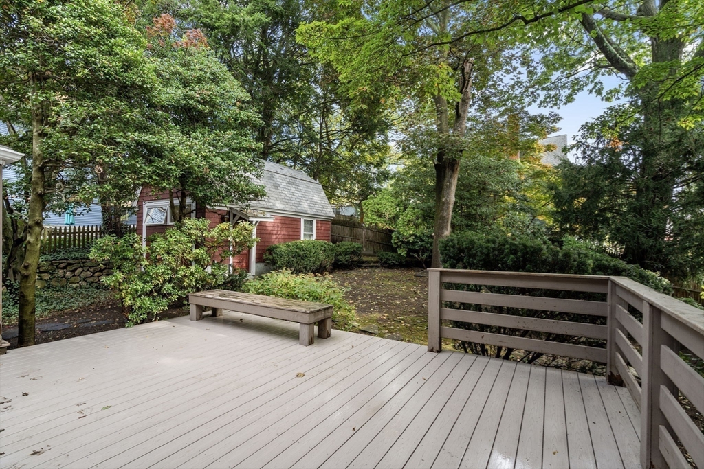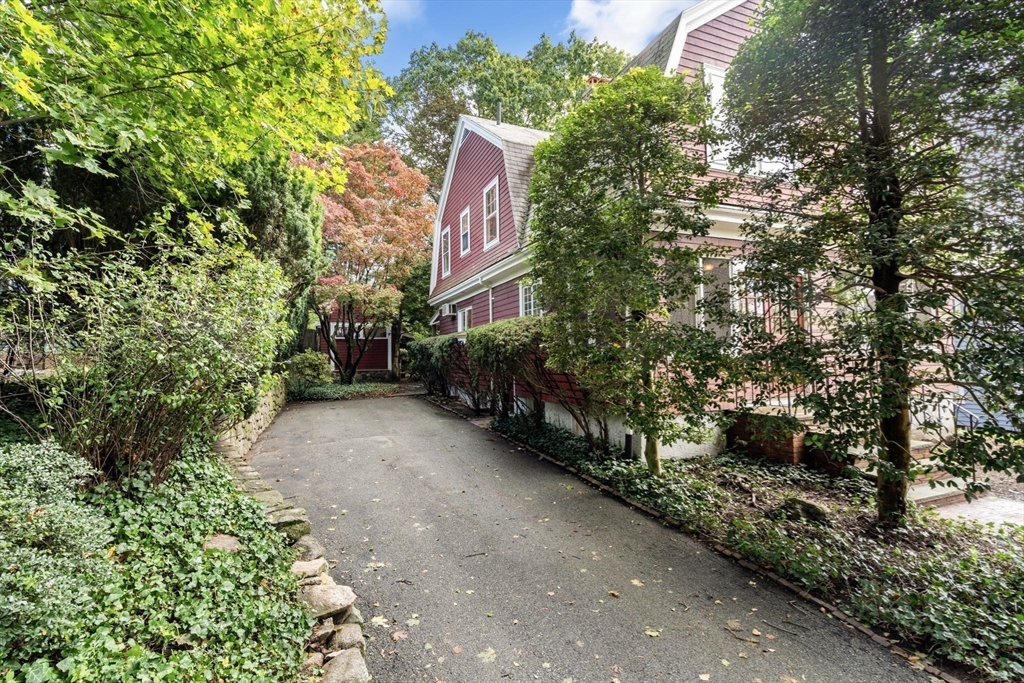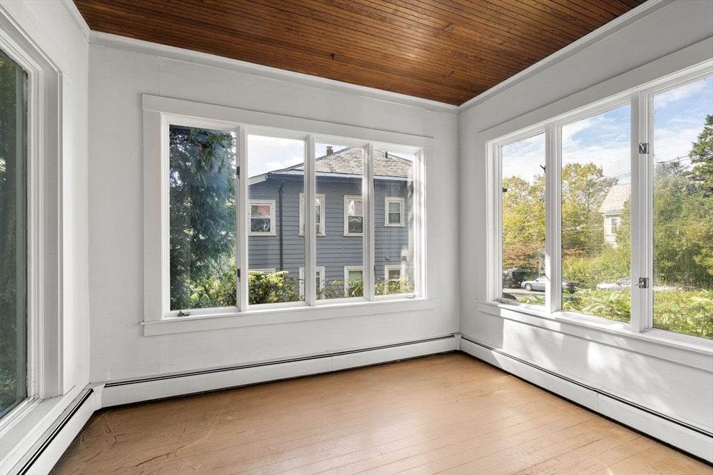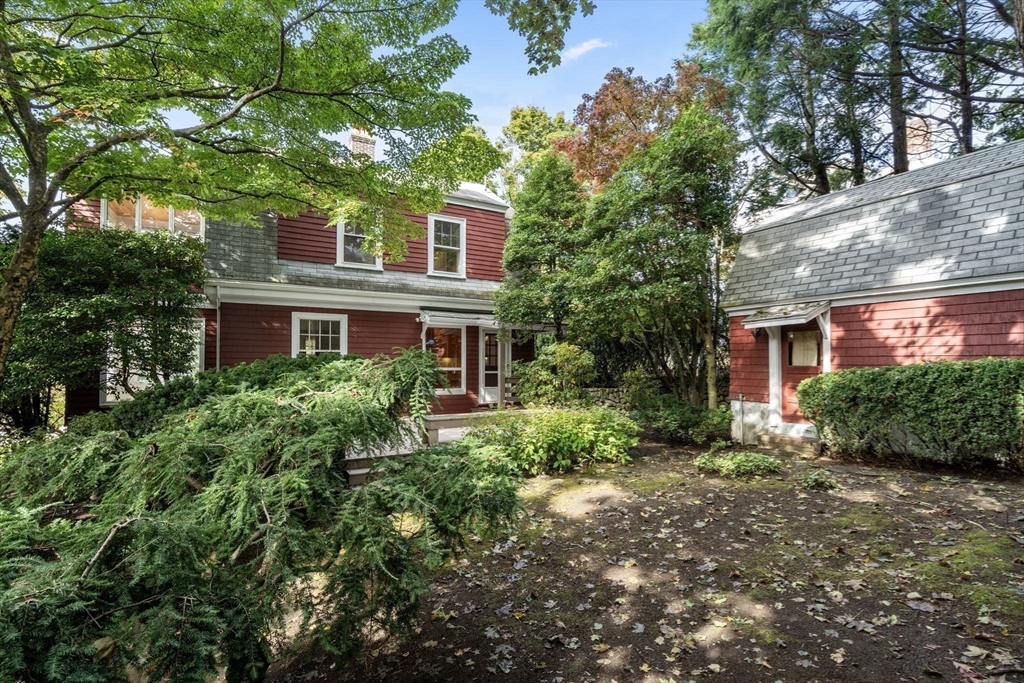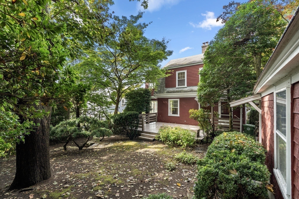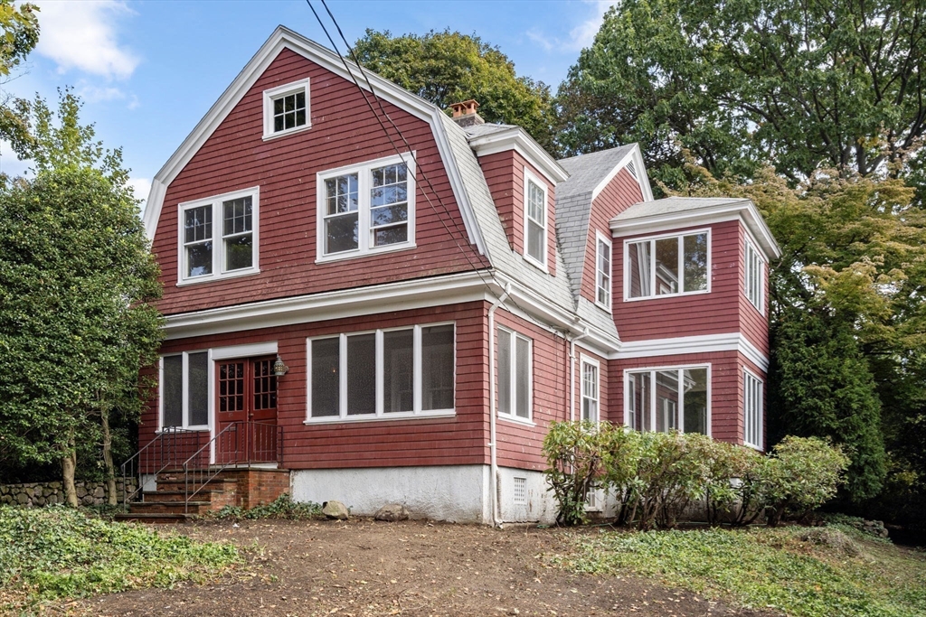 Classic 1913 Dutch Colonial with high ceilings and period charm, updated over time. Enclosed front porch opens to a spacious foyer thru a Tiger Oak front door, granite/stainless kitchen with deck access, large dining room with attached sunroom/office, and living room with brick fireplace & build-in bookcases. Upstairs offers 3 bedrooms, full bath, and a primary suite with en-suite bath and sunroom overlooking gardens. Both sunrooms added in 1991. Features include hardwood floors, built-ins, and 2,110 sq ft of finished space on a 9,583 sq ft lot. Walk-out basement (654 sq ft) and 200 sqft detached garage converted to office/studio with high ceilings. Mature gardens, stone walls, wood deck, and brick patio create a private retreat. Parking for 4. Near the New Watertown High, with easy access to Boston, Harvard Sq, Watertown Sq and Arsenal Yard. Offered as-is or renovated to spec. A real Gem ...