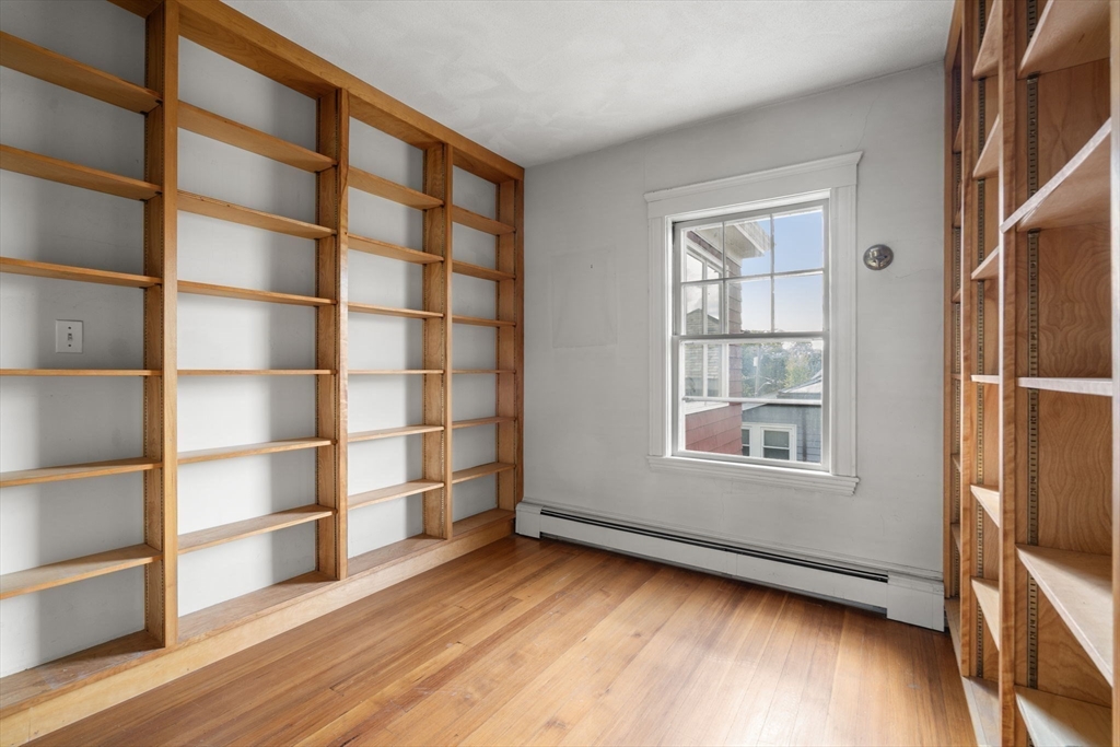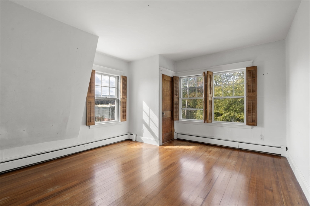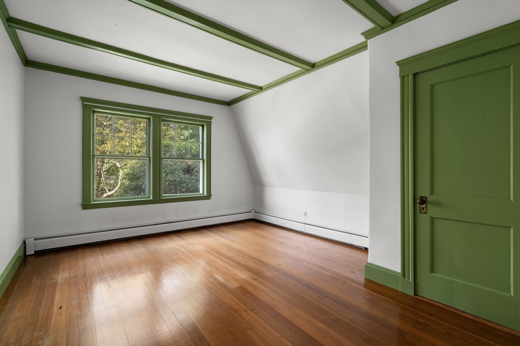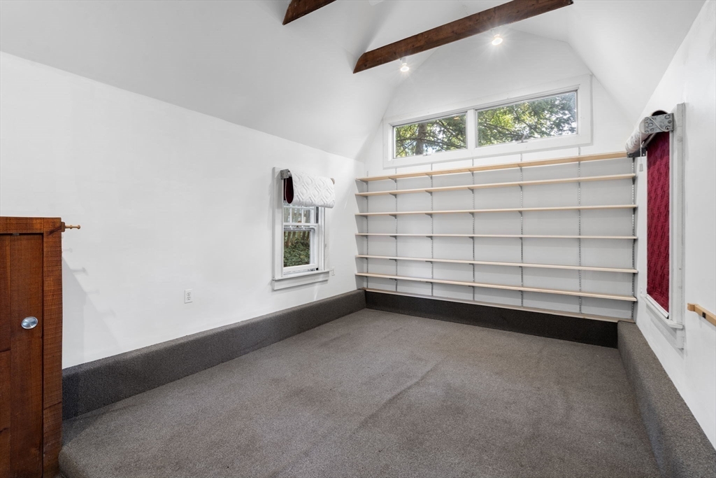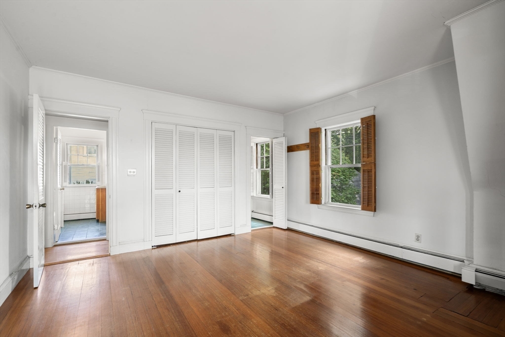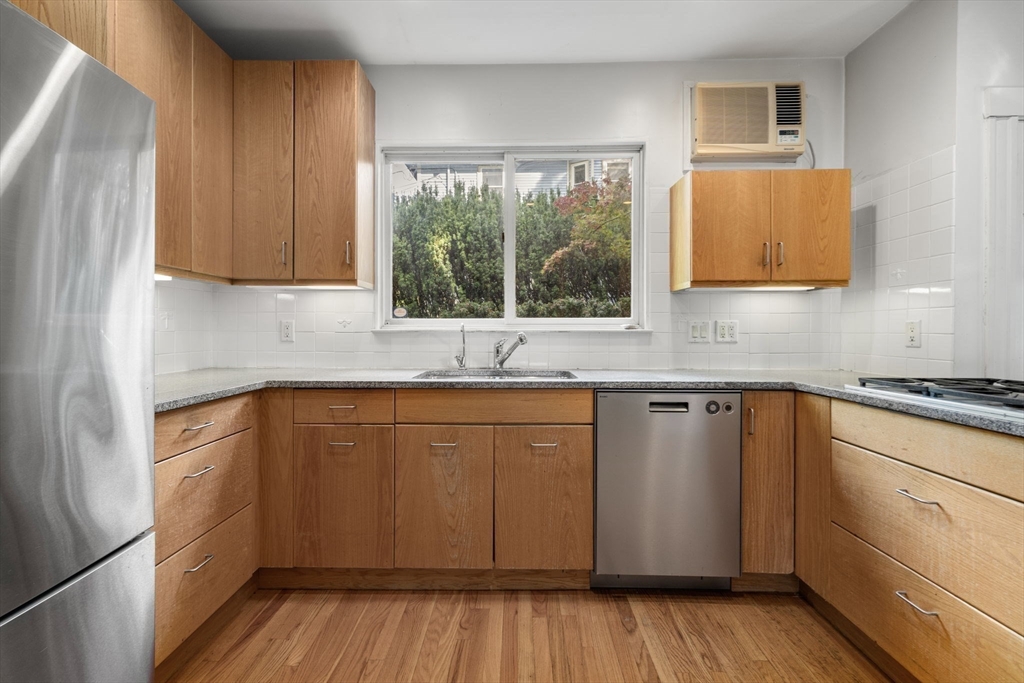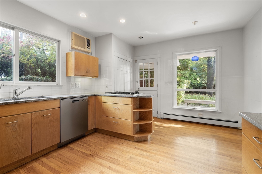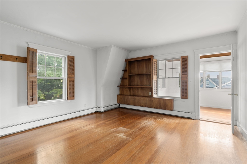 Classic 1913 Dutch Colonial with high ceilings and period charm, updated over time. Enclosed front porch opens to a spacious foyer thru a Tiger Oak front door, granite/stainless kitchen with deck access, large dining room with attached sunroom/office, and living room with brick fireplace & build-in bookcases. Upstairs offers 3 bedrooms, full bath, and a primary suite with en-suite bath and sunroom overlooking gardens. Both sunrooms added in 1991. Features include hardwood floors, built-ins, and 2,110 sq ft of finished space on a 9,583 sq ft lot. Walk-out basement (654 sq ft) and 200 sqft detached garage converted to office/studio with high ceilings. Mature gardens, stone walls, wood deck, and brick patio create a private retreat. Parking for 4. Near the New Watertown High, with easy access to Boston, Harvard Sq, Watertown Sq and Arsenal Yard. Offered as-is or renovated to spec. A real Gem ...