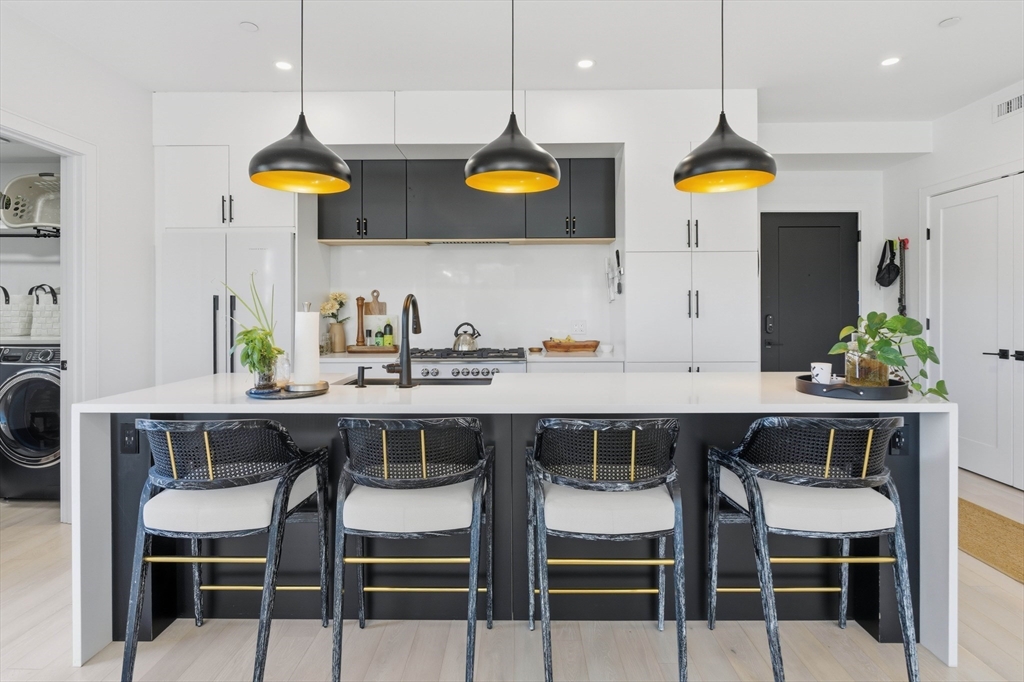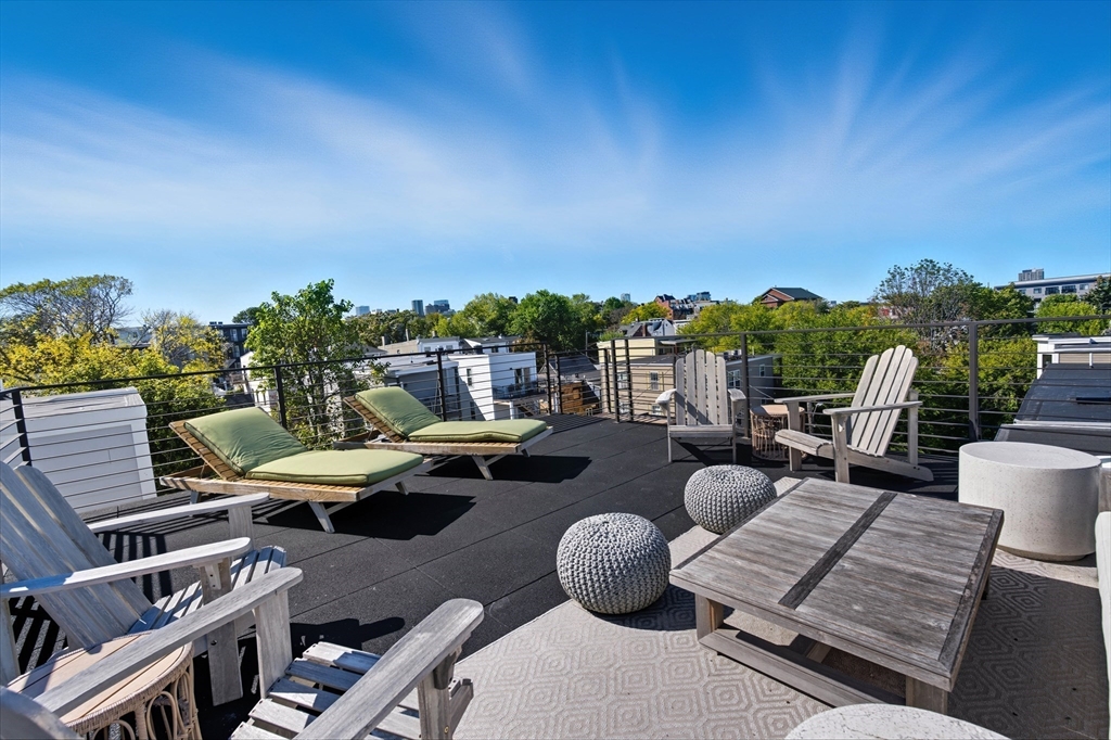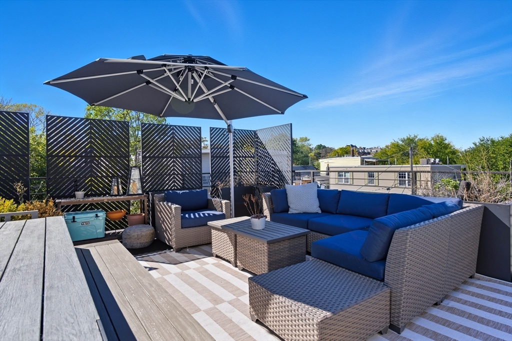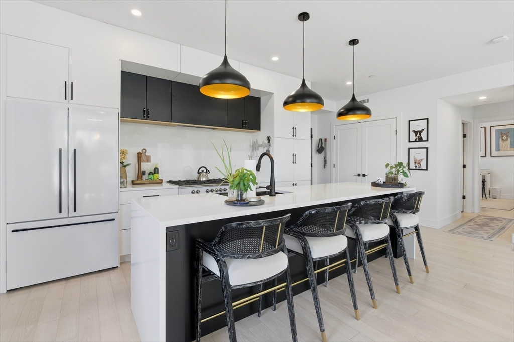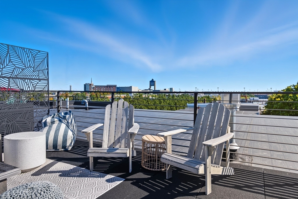 Modern Jeffries Point Penthouse with Private Roof Deck. Experience modern East Boston living in this newer-construction penthouse built in 2021. This 3-bed, 2-bath home offers 1,428 sq ft of living space plus 1,000+ sq ft of private outdoor space, including a roof deck with panoramic city and harbor views. The open layout features a chef’s kitchen with quartz waterfall island, high-end appliances, and a bright living area that opens to a private terrace, perfect for entertaining. The primary suite offers dual closets and a spa-like bath with glass shower. Two additional bedrooms, one with a private deck, provide space for guests or an office. Enjoy hardwood floors, recessed lighting, built-in sound, in-unit laundry, and garage parking. Minutes from Harborwalk, East Boston Greenway, parks, and waterfront trails, plus neighborhood favorites like Starbucks, The Quiet Few, Mida, ReelHouse, and Santarpio’s. Quick access to Maverick Station, East Boston Ferry, and major highways.