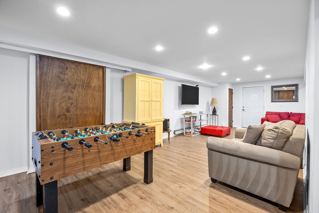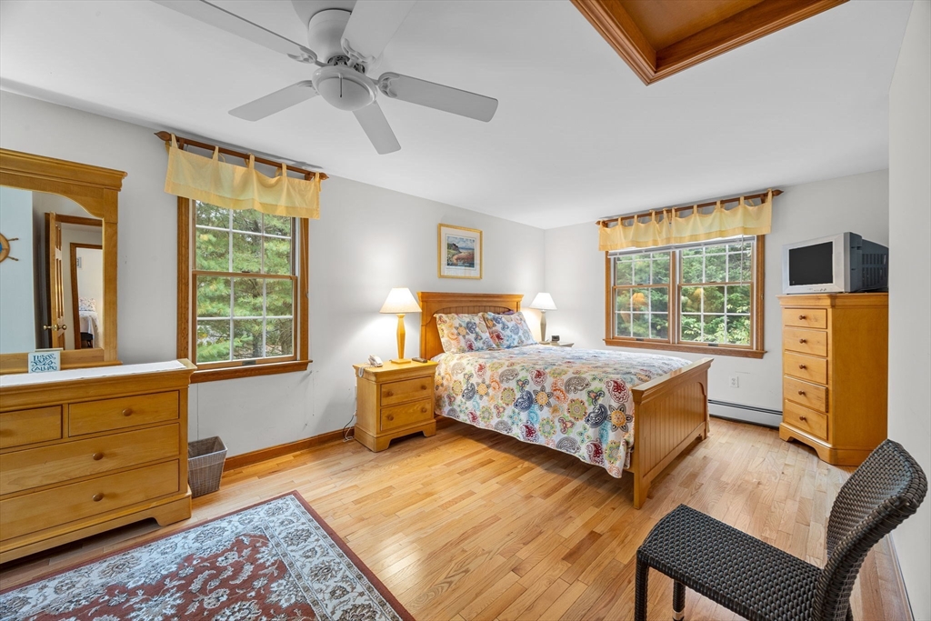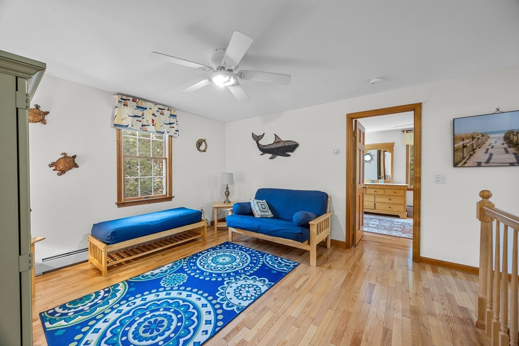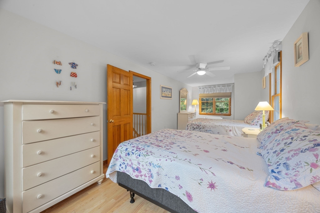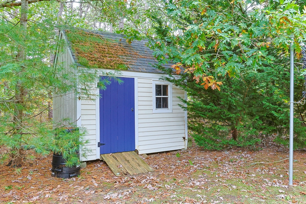 Nestled in the woods of Wellfleet, this secluded 3-bedroom home in Great Woods Fields offers coveted privacy and Cape Cod charm. Meticulously maintained, it features a bright open living and dining area with oak floors, two bay windows, a wood-burning fireplace and French doors to a knotty pine screened-in porch for relaxed mornings or summer nights. The updated kitchen boasts custom cabinets, Quartz counters, and a gas range. The first-floor bedroom, full bath, and laundry offer main-level convenience. Upstairs, a sunny sitting area leads to two oversized bedrooms and another bath. The finished basement invites play with media, ping pong, and foosball tables. Mature landscaping includes lush hydrangeas, irrigation, shed, and outdoor shower. Bike trail access through the homeowner association. Strong rental history. Sold turn-key—move in and start your Cape Cod adventure!