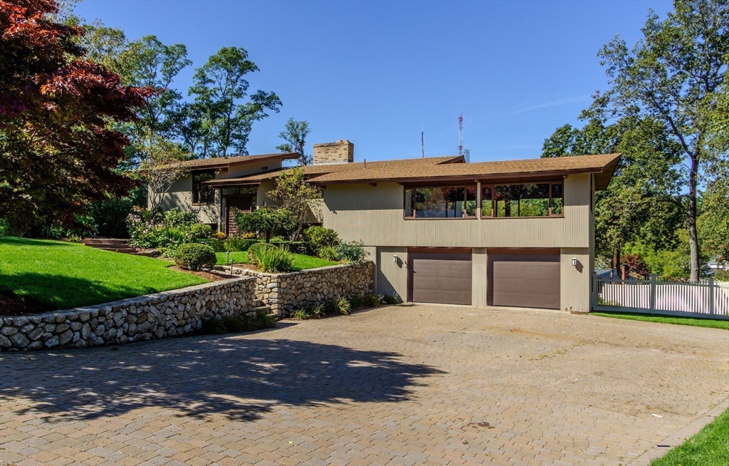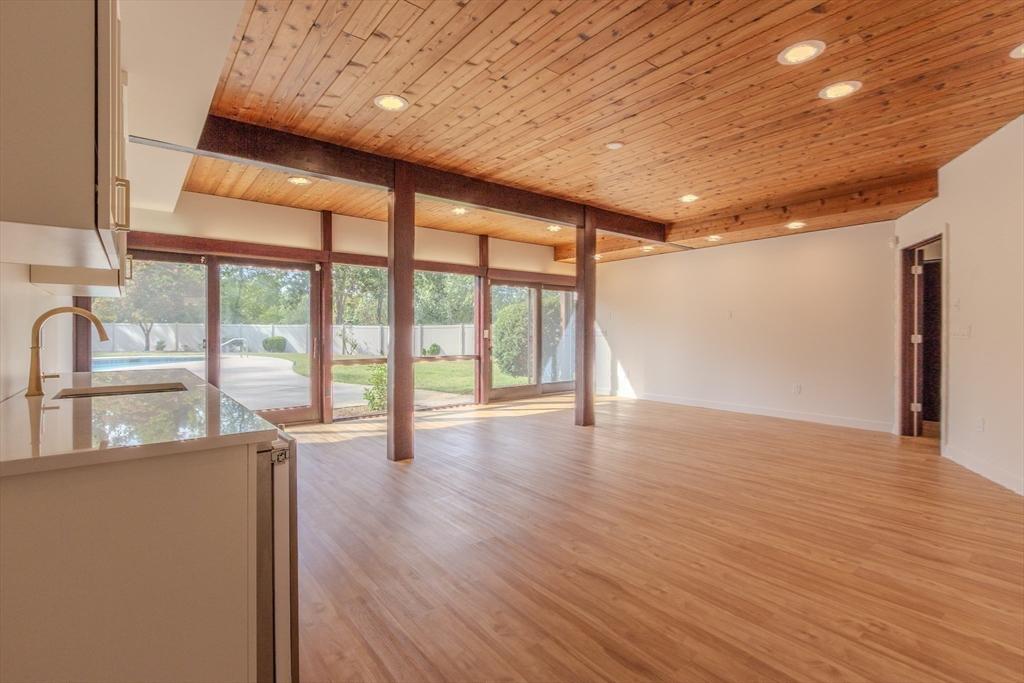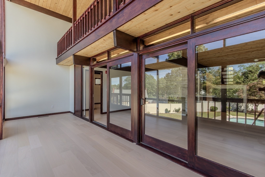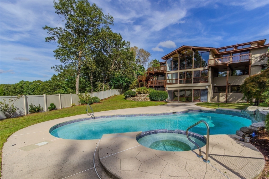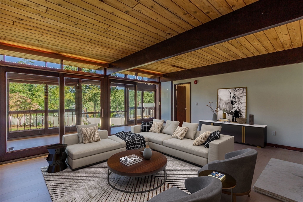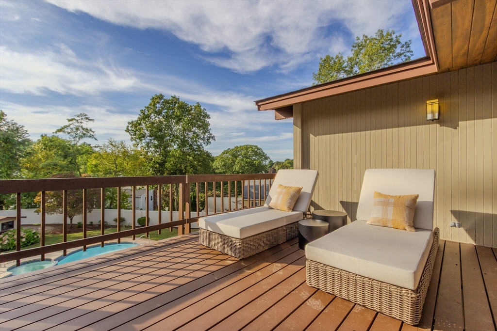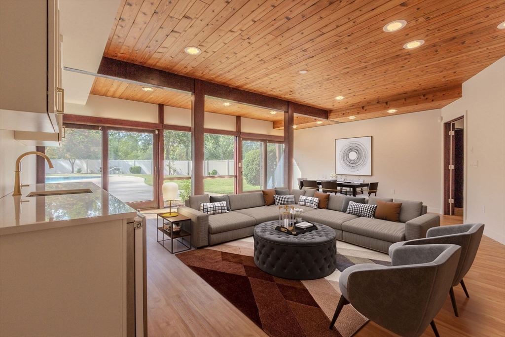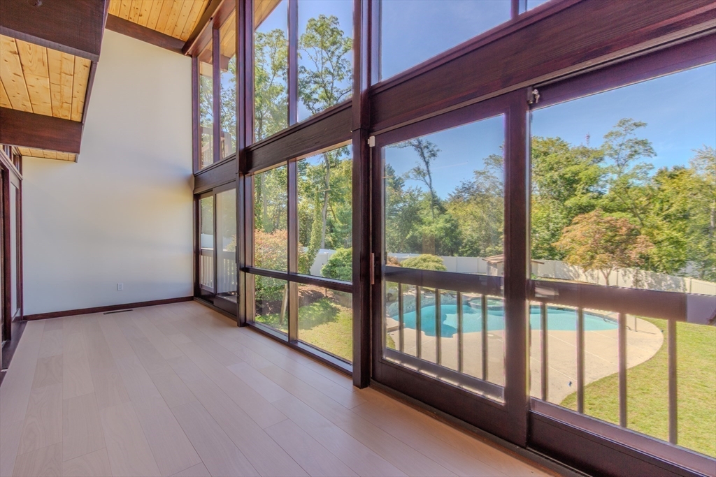 Spectacular new renovation by noted builder. This multi-level contemporary home features vaulted ceilings and an open-concept main floor. The updated Viking kitchen with large breakfast island, flows into the living and dining rooms, offering floor-to-ceiling views of the pool, jacuzzi, and fenced yard. A large bonus room, currently a library/game room. The primary suite is open and airy, with a slider to a private deck and a spa-like marble bath with a separate soaking tub, large shower, and double vanity. This floor also includes an additional home office and guest bath. A second family room, three additional bedrooms, a full bath, laundry, and a glass-enclosed sun room complete this level. The walk-out lower level offers an in-law suite or recreation space with a large bedroom, full bath, living area and prep/wet bar built ins, with direct access to the in-ground Gunite pool and yard. Two car garage under.